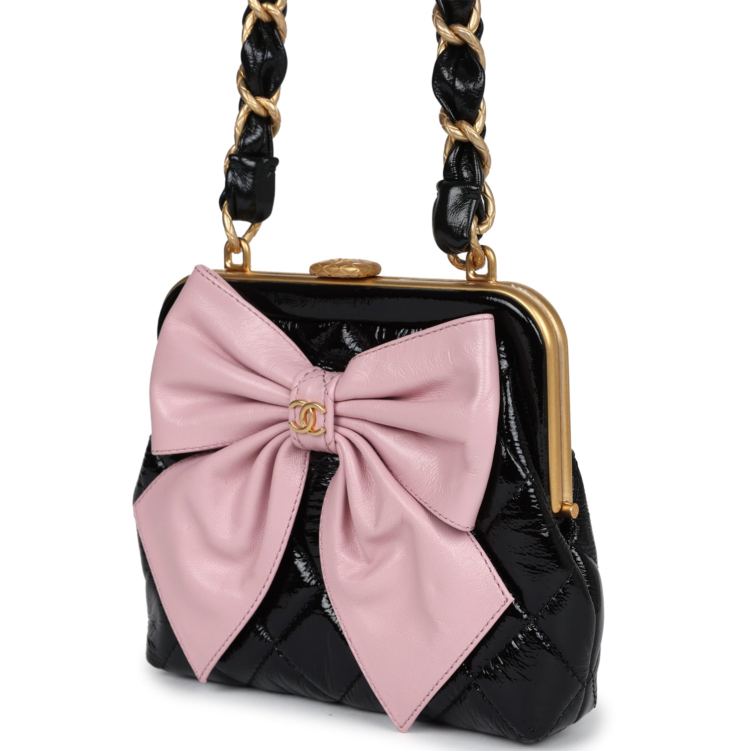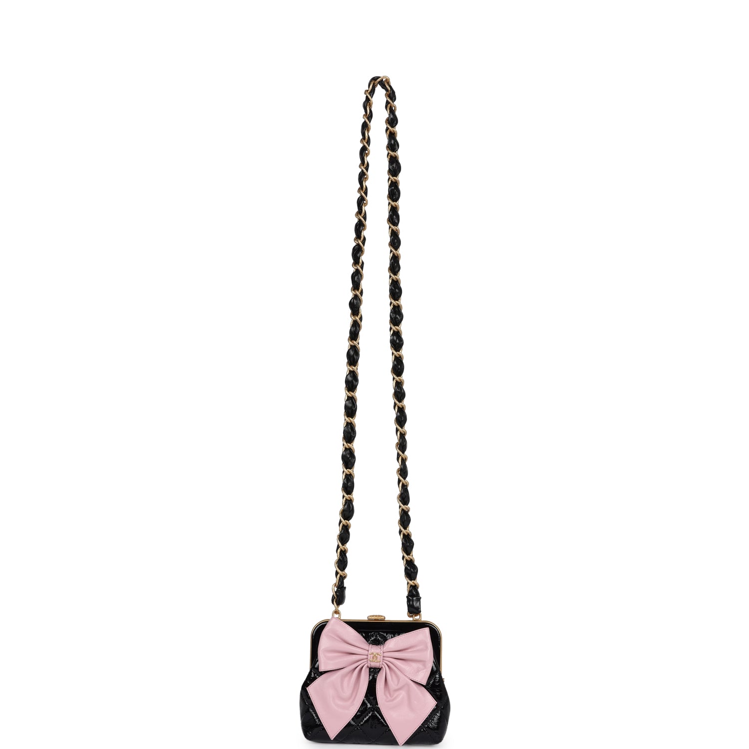 Regular price $1,980.00 Sale price $450.00 Save $1,530.00This Chanel Mini Clutch with bow crossbody bag is in black shiny lambskin leather and pink patent crumpled lambskin leather with antique gold hardware, featuring signature quilt with a large pink lambskin bow on the front of the clutch with the signature CC logo in antique gold hardware, has a black and antique gold frame around top of clutch, a fastener clasp closure, and a single interwoven black leather and antique gold chainlink shoulder/crossbody strap.