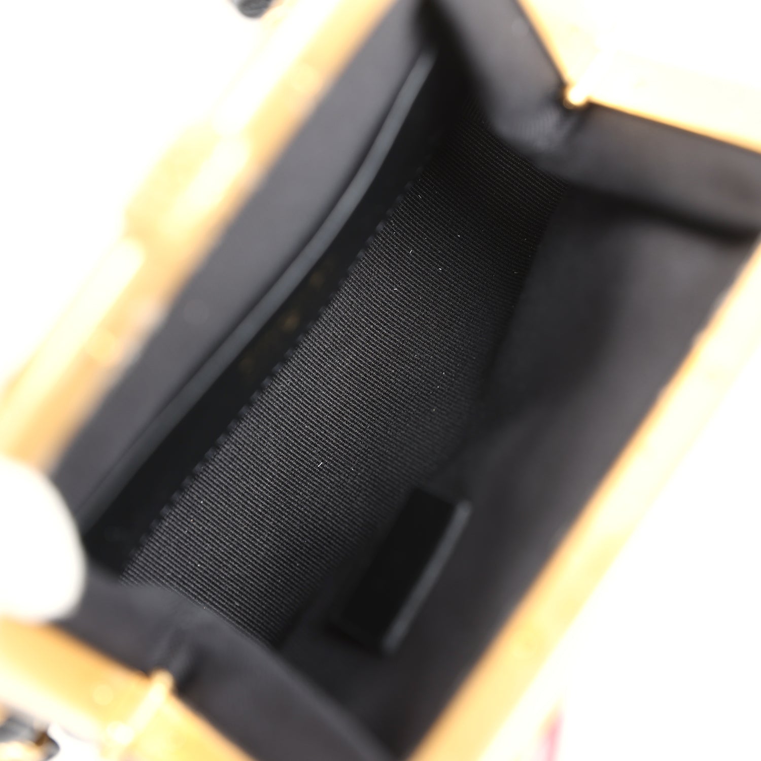 The interior is lined in black grossgrain fabric and has two small interior slit pockets.