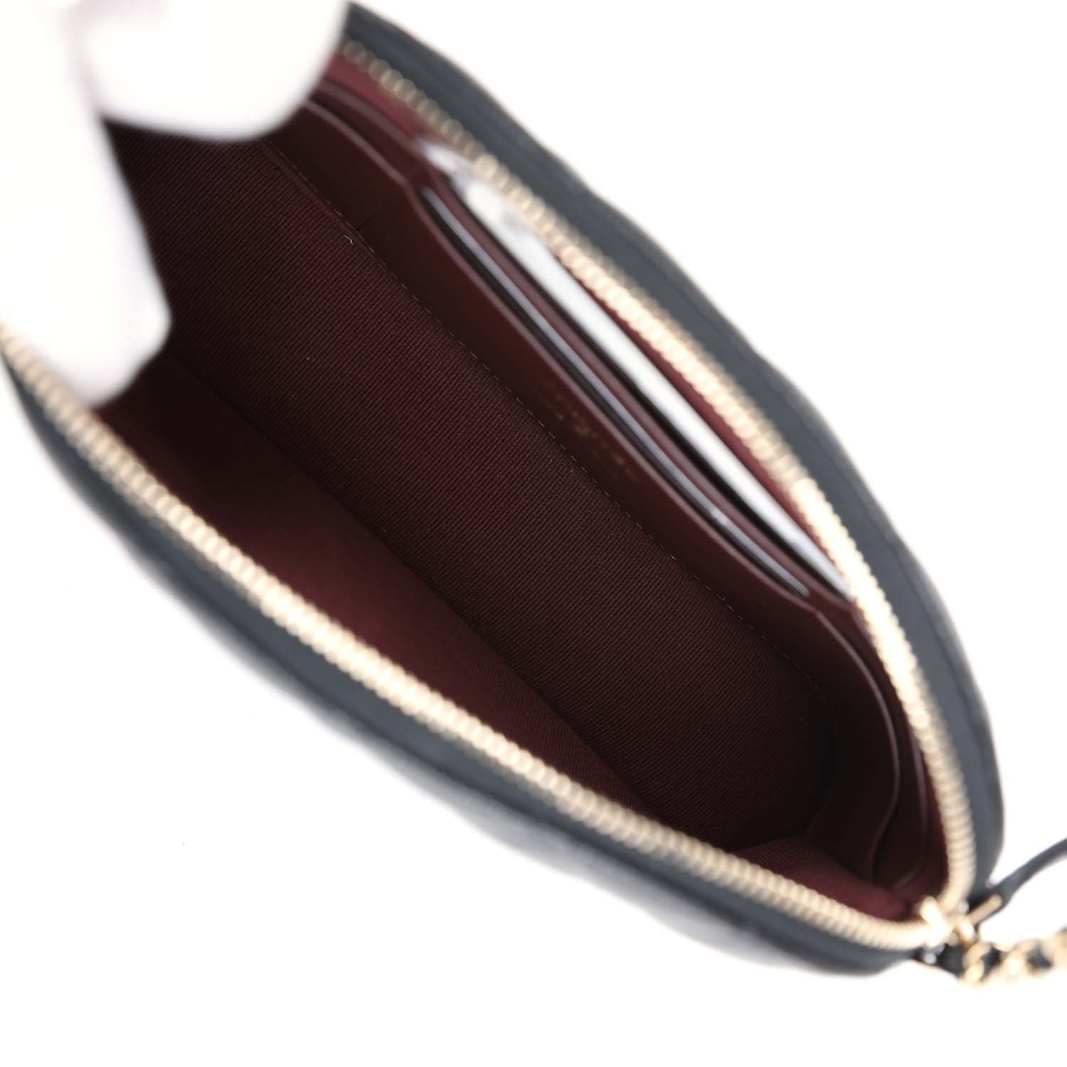 The interior is lined in burgundy grossgrain fabric and has one zip pocket on the rear wall with logo pull and one small slip pocket on rear wall.