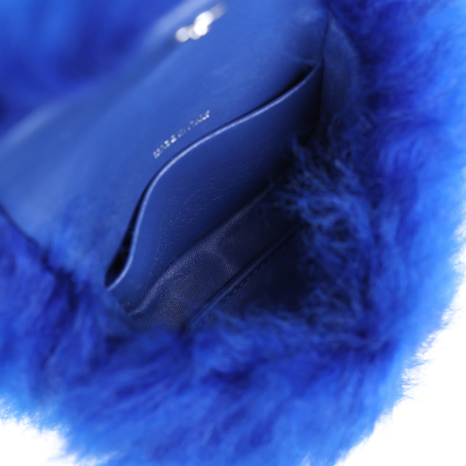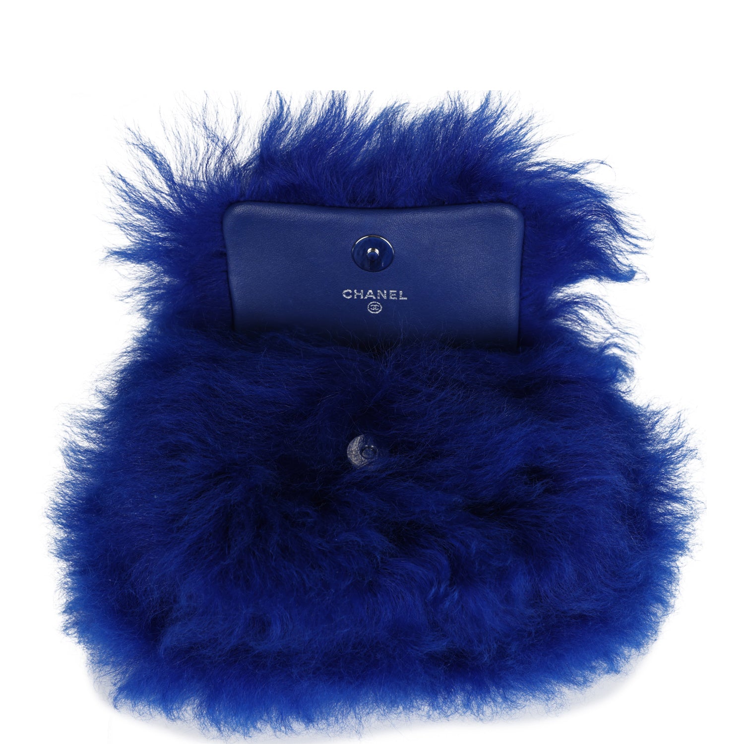 Regular price $19,100.00 Sale price $1,170.00 Save $17,930.00This Chanel Mini Clutch Bag is in dark blue shearling with silver hardware and featuring front CC snap closure and a silver Chanel carabiner hook/Clip.