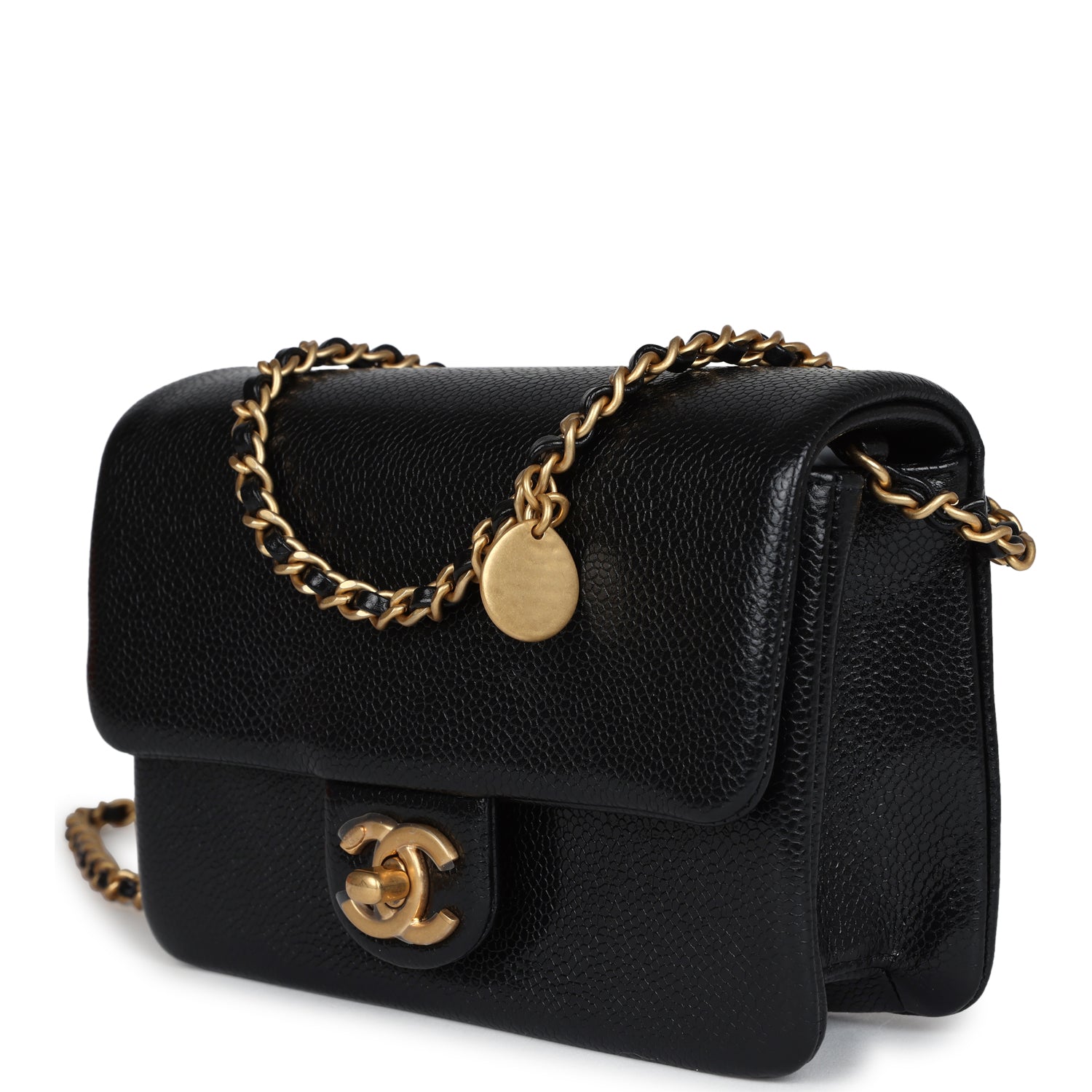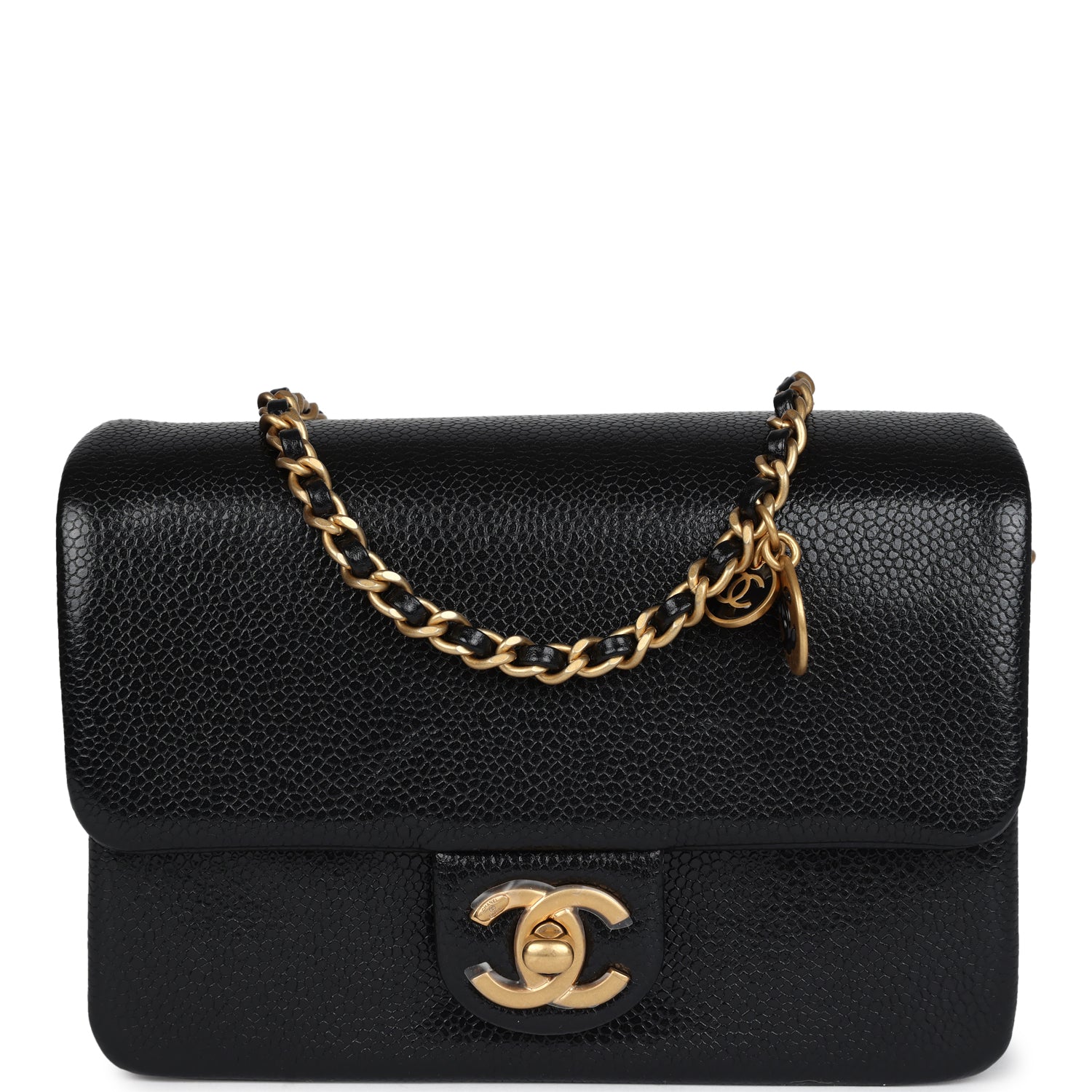 Regular price $1,860.00 Sale price $430.00 Save $1,430.00This Chanel mini flap bag is of black grained shiny calfskin leather with brushed Gold Hardware, featuring, a front flap CC turnlock closure and a single interwoven brushed gold and black leather shoulder strap with two round CC coin charms.