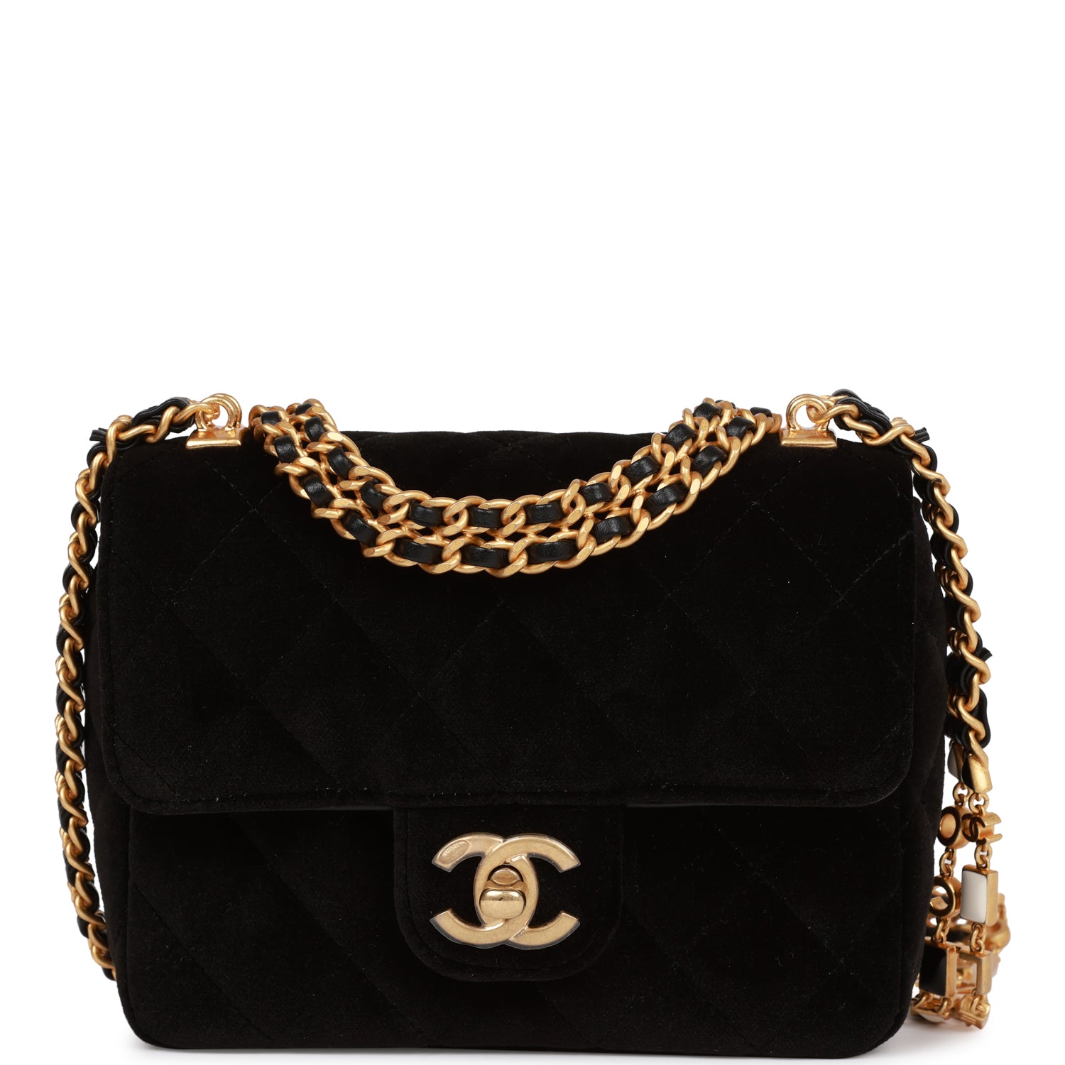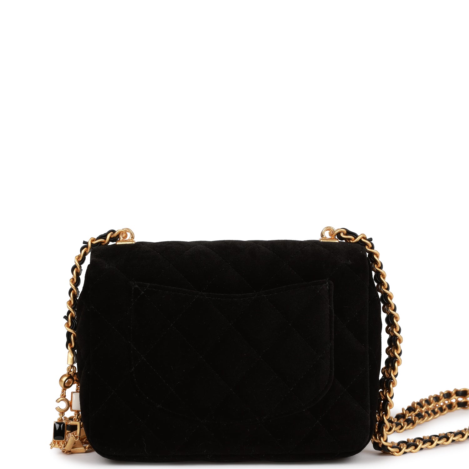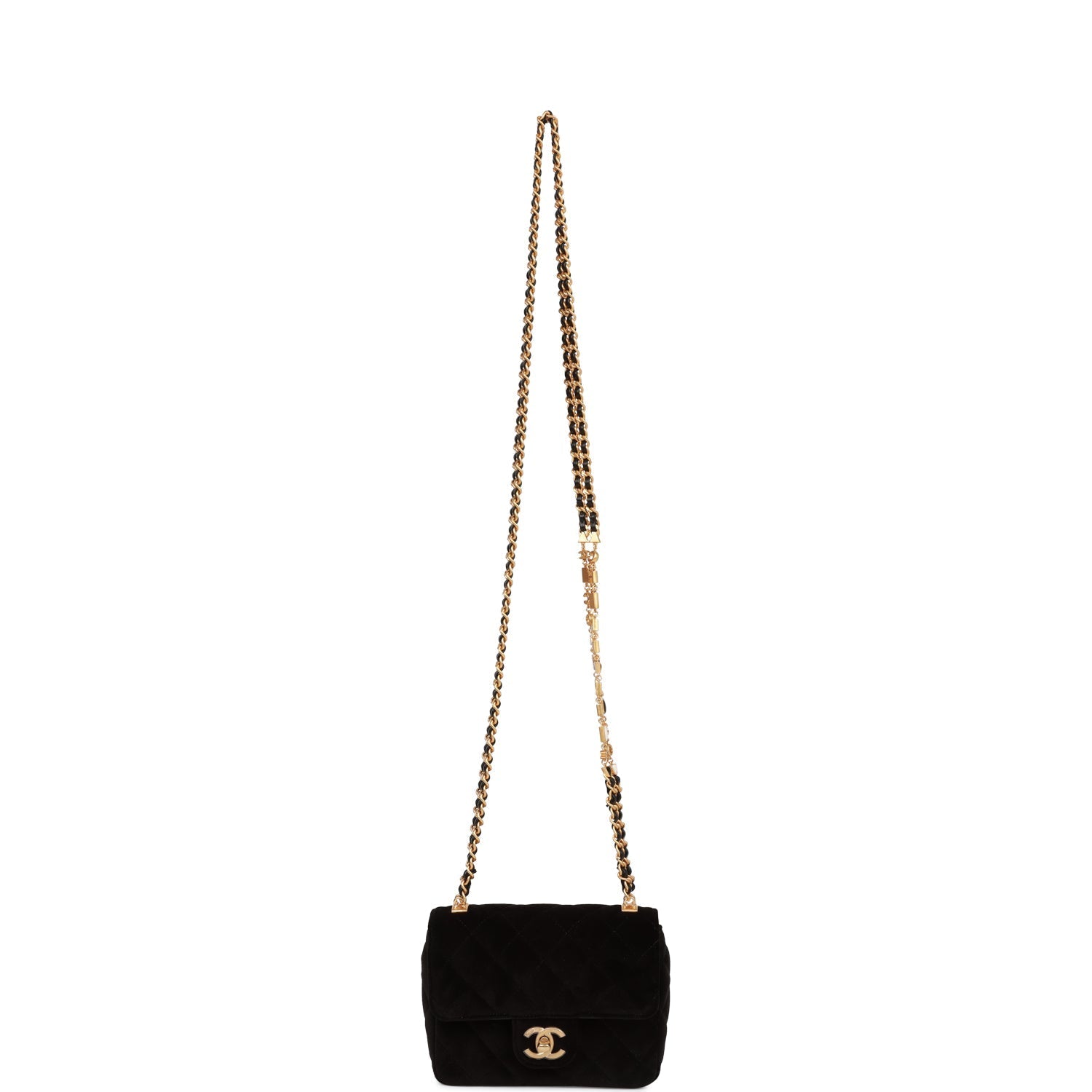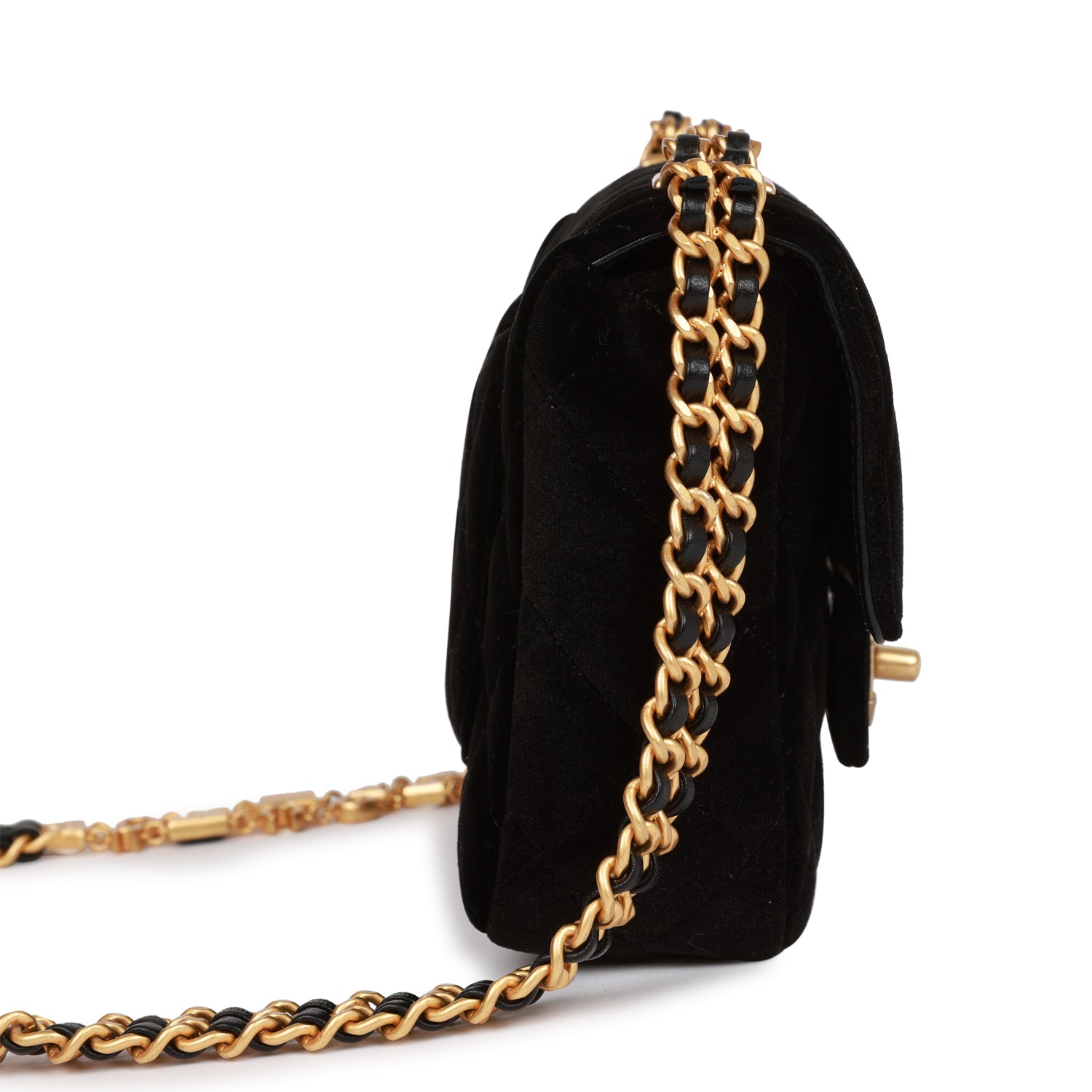 Regular price $2,190.00 Sale price $670.00 Save $1,520.00Mini flap bag is in black velvet with gold tone hardware and has a front flap with signature CC turnlock closure, rear half moon pocket and double interwoven black leather and an enamel and gold tone chain link shoulder/crossbody strap.