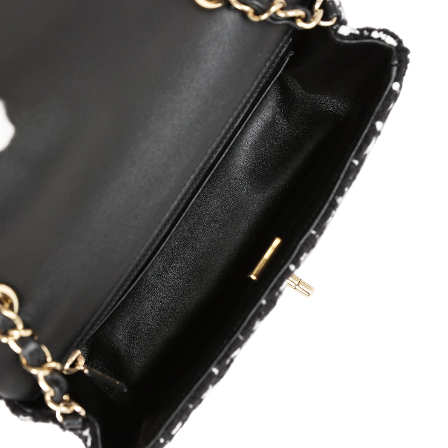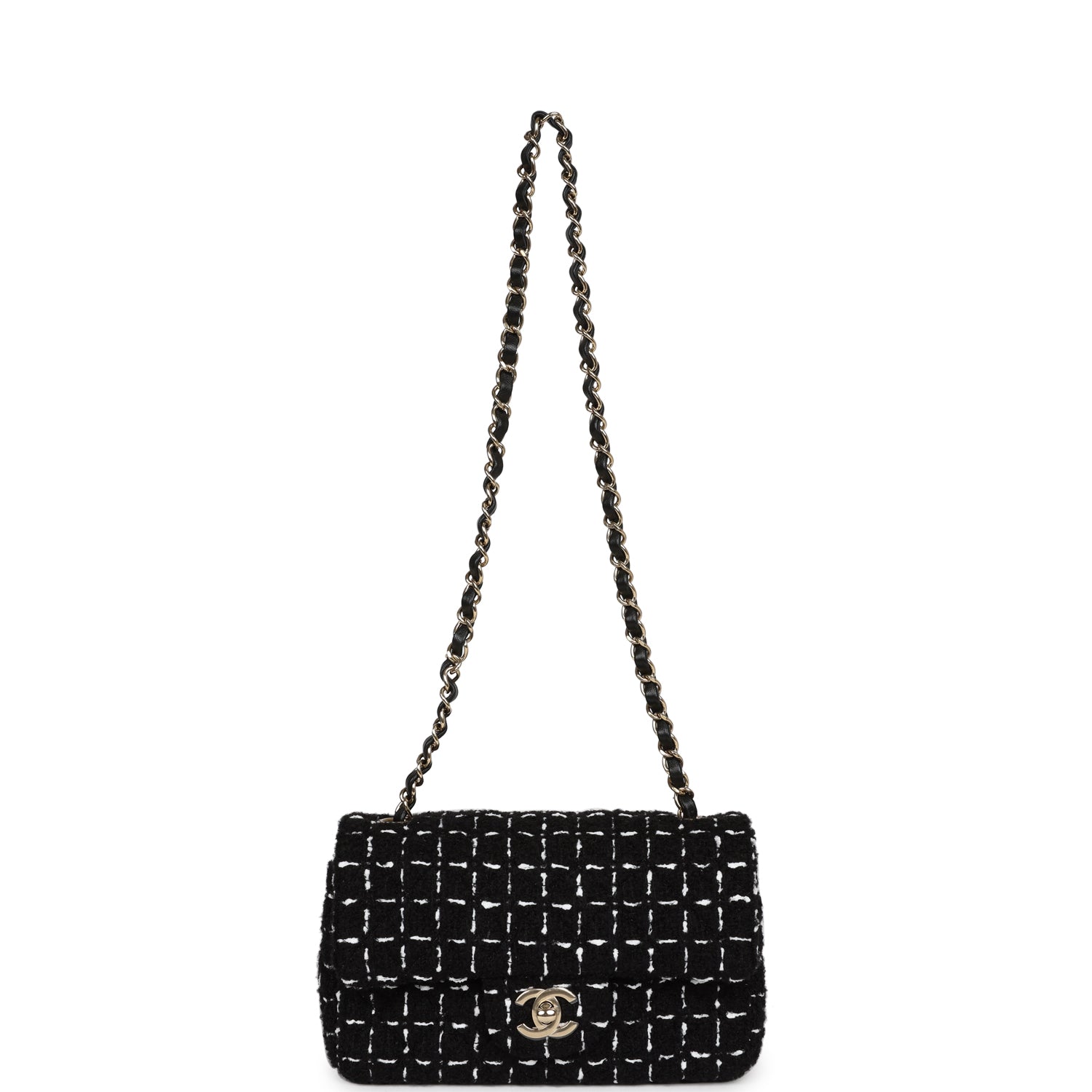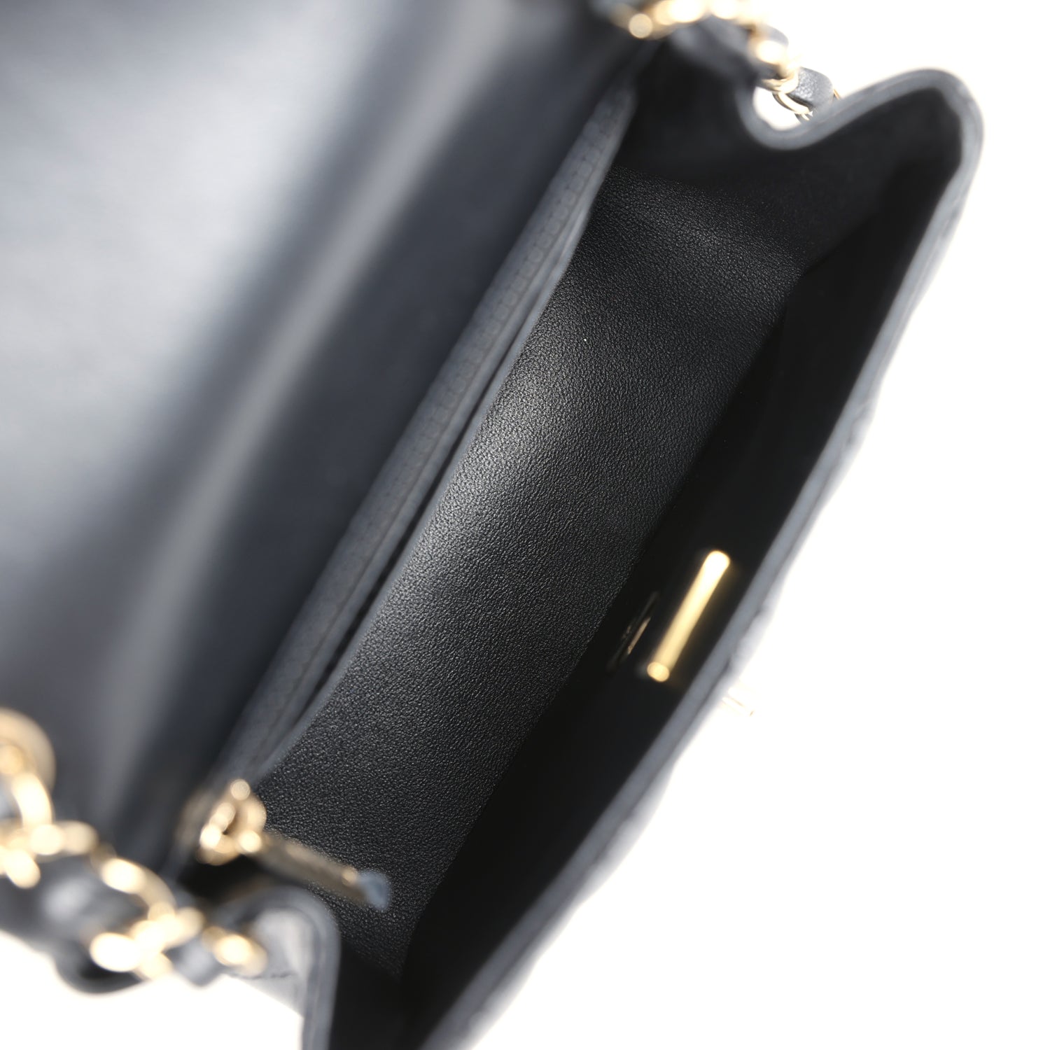 Regular price $18,660.00 Sale price $1,240.00 Save $17,420.00This Chanel Classic Mini Square flap bag is in black lambskin leather with light gold tone hardware and has a front flap with signature CC turnlock closure, tonal stitching, rear half moon pocket and single interwoven black leather and light gold tone chain link shoulder/crossbody strap.