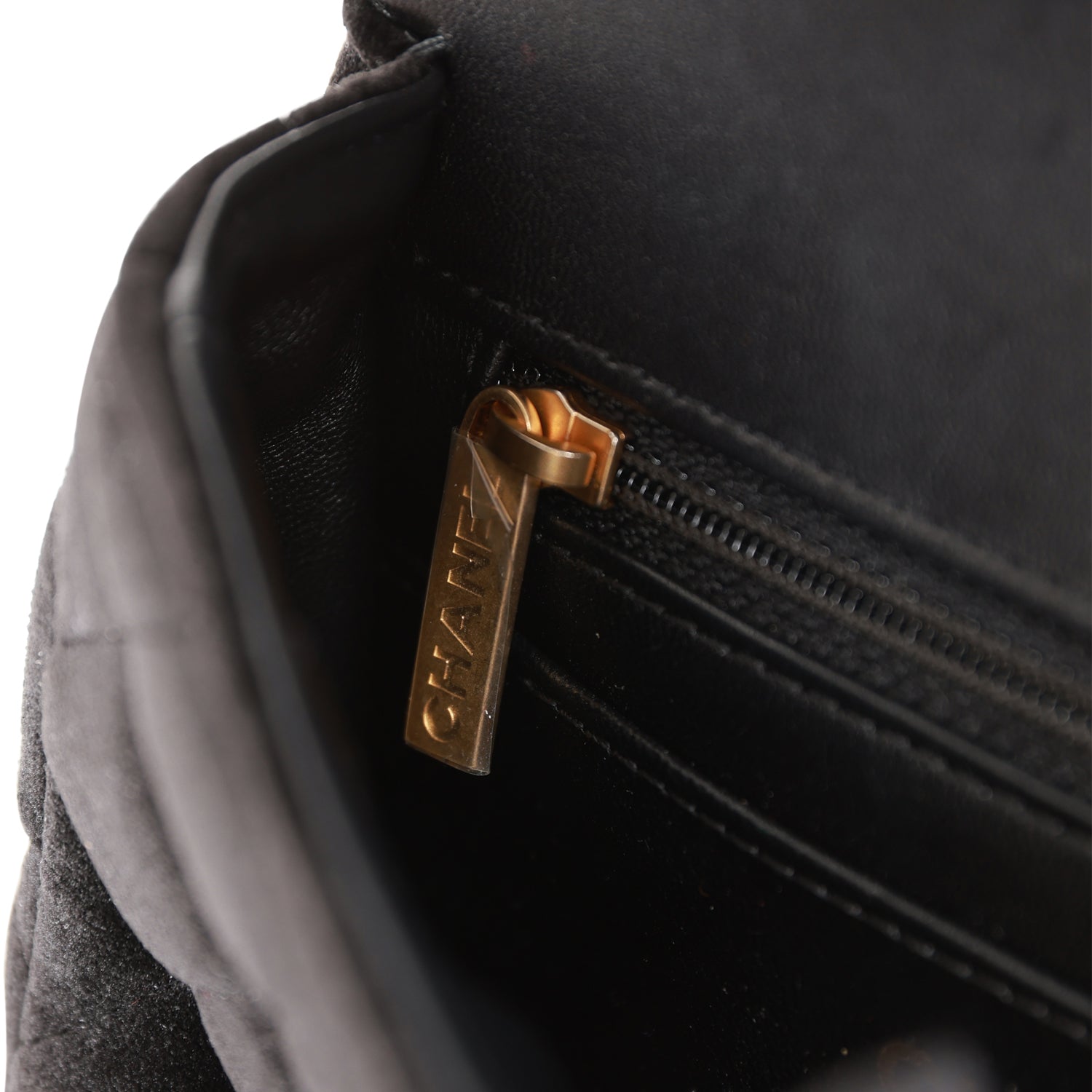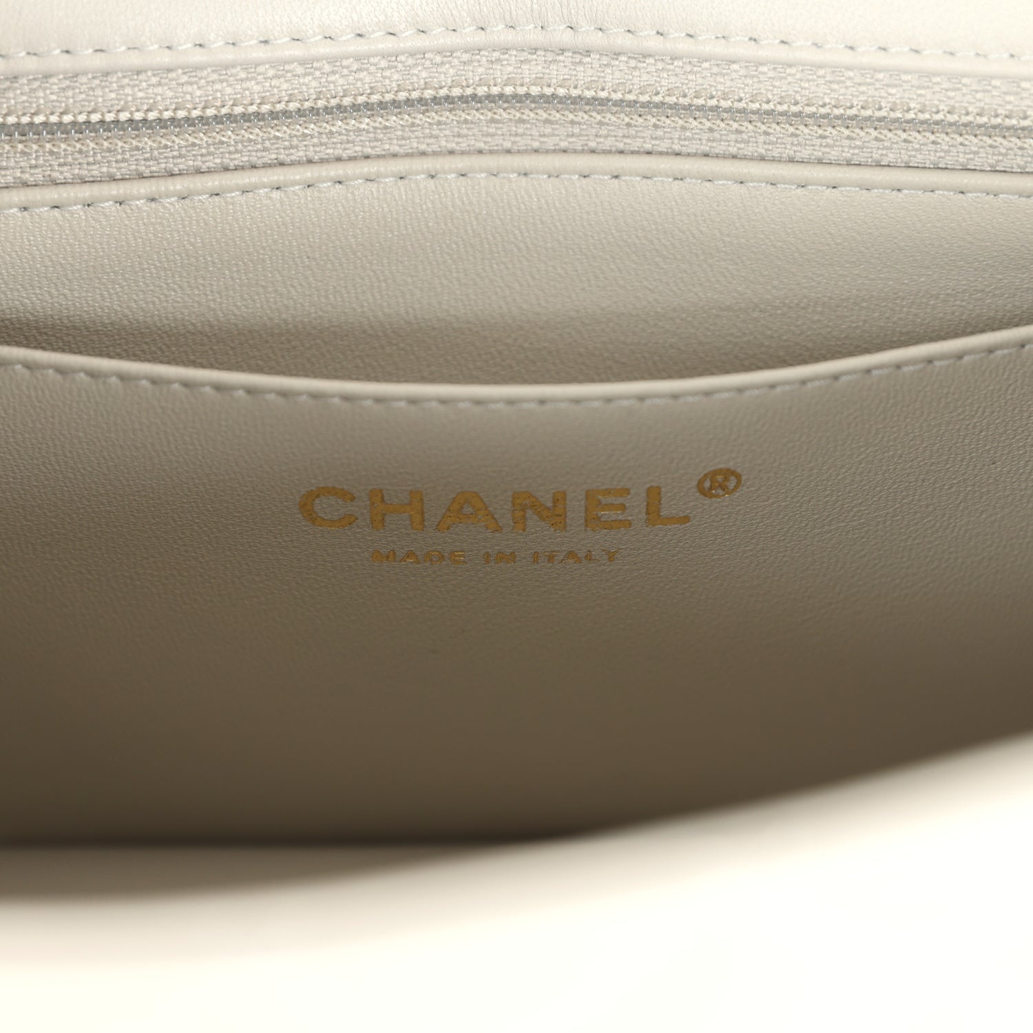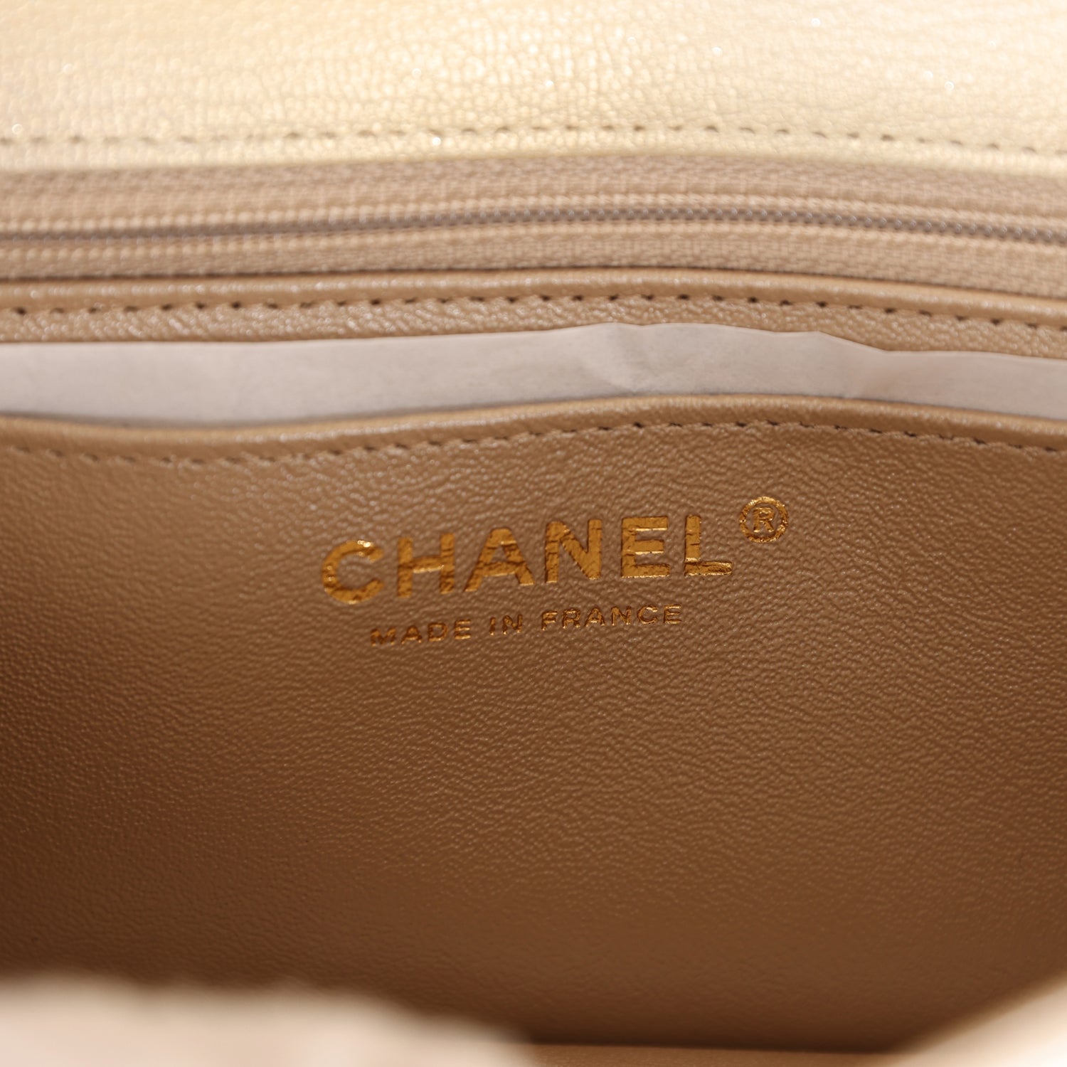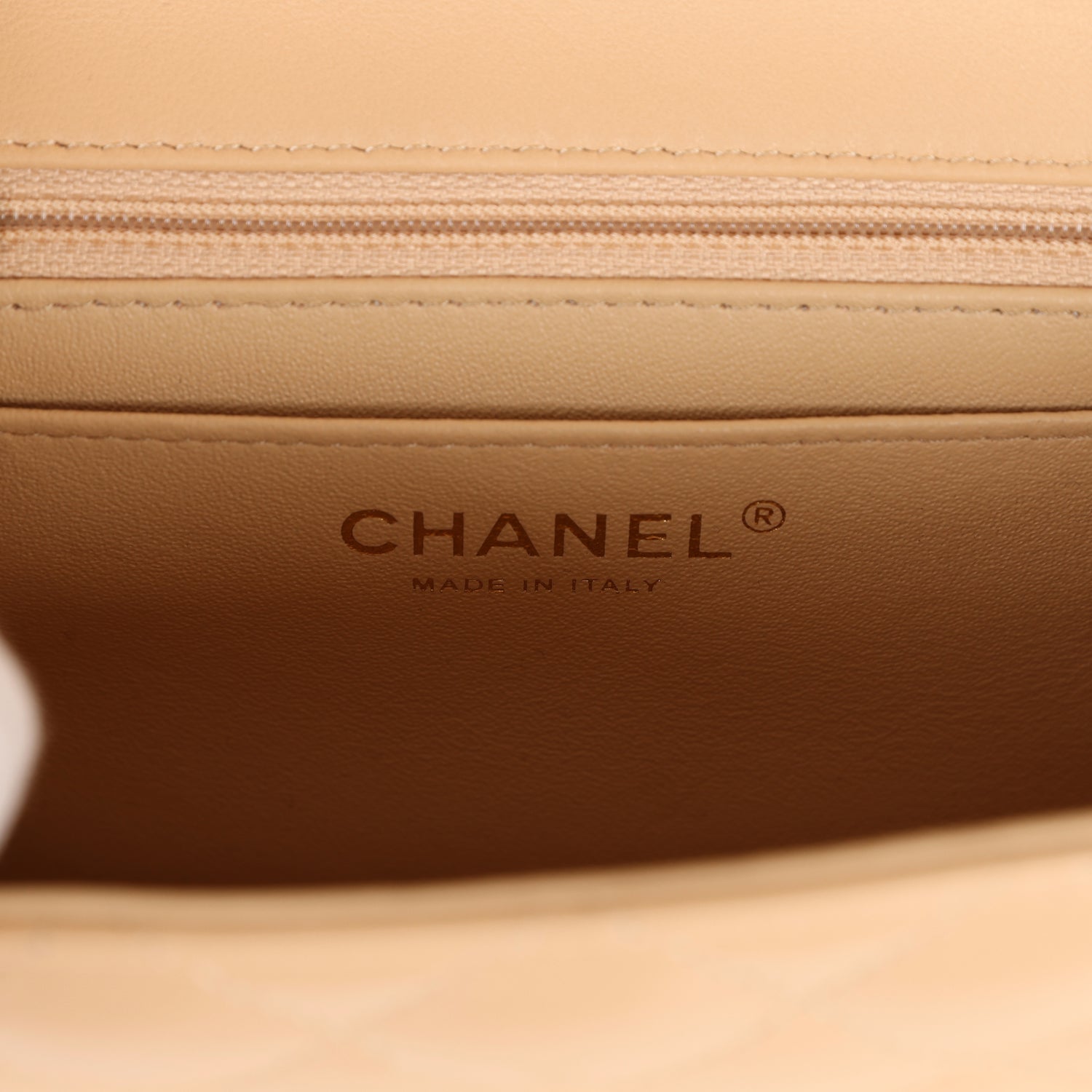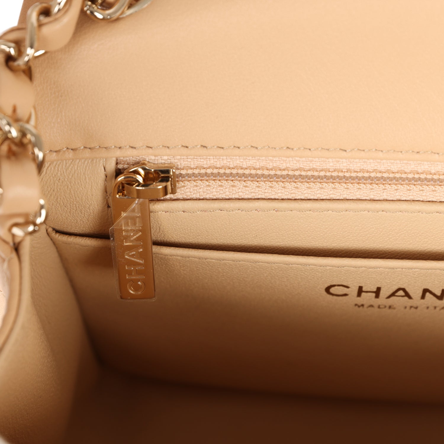 The interior is lined in beige leather and features a zipper pocket with Chanel pull and an open pocket below.