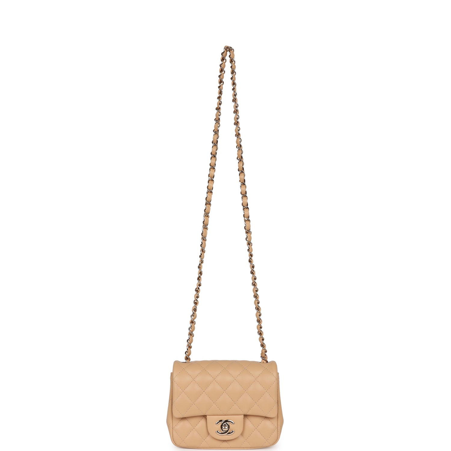 Regular price $1,810.00 Sale price $430.00 Save $1,380.00This Mini Square flap bag is in beige lambskin with gold tone hardware and has a front flap with signature CC turnlock closure, rear half moon pocket and single interwoven beige leather and gold tone chain link shoulder/crossbody strap.