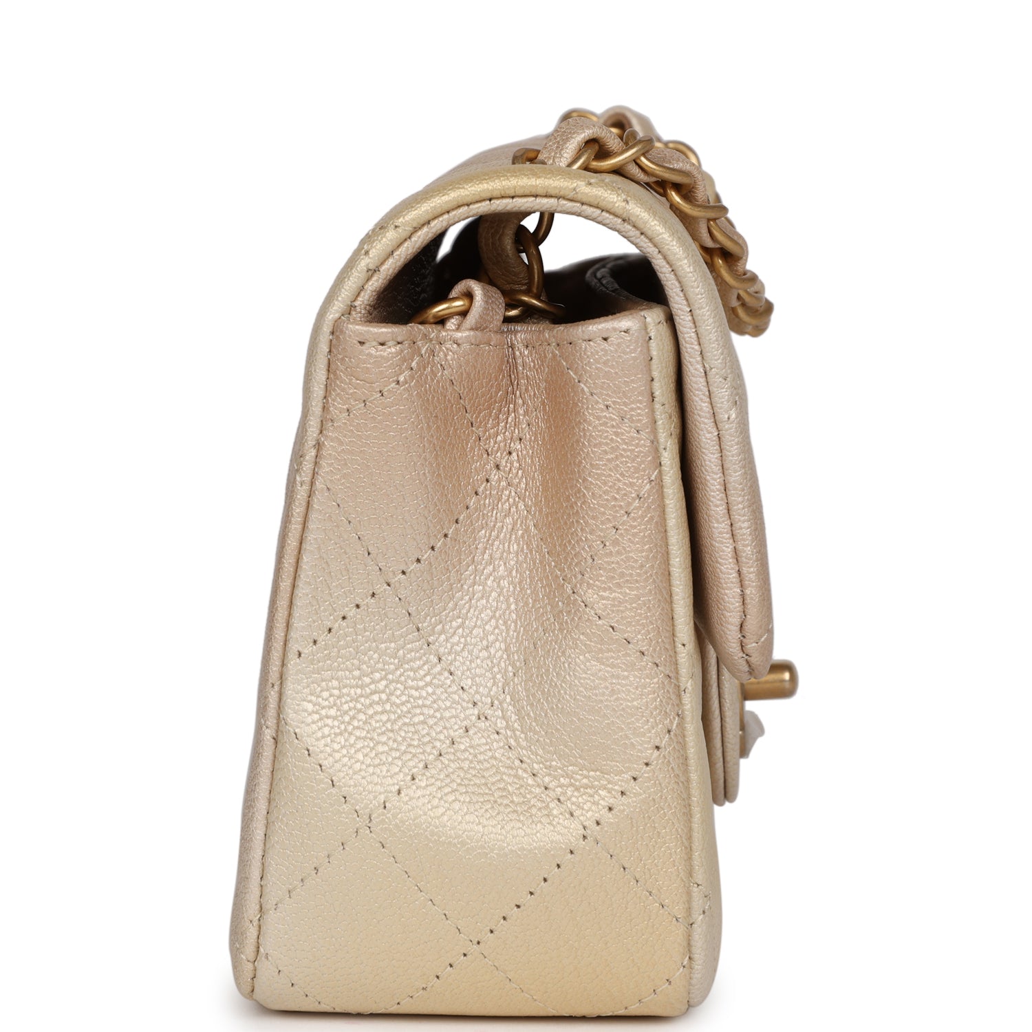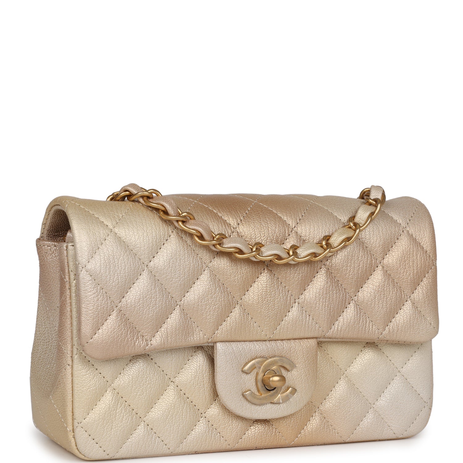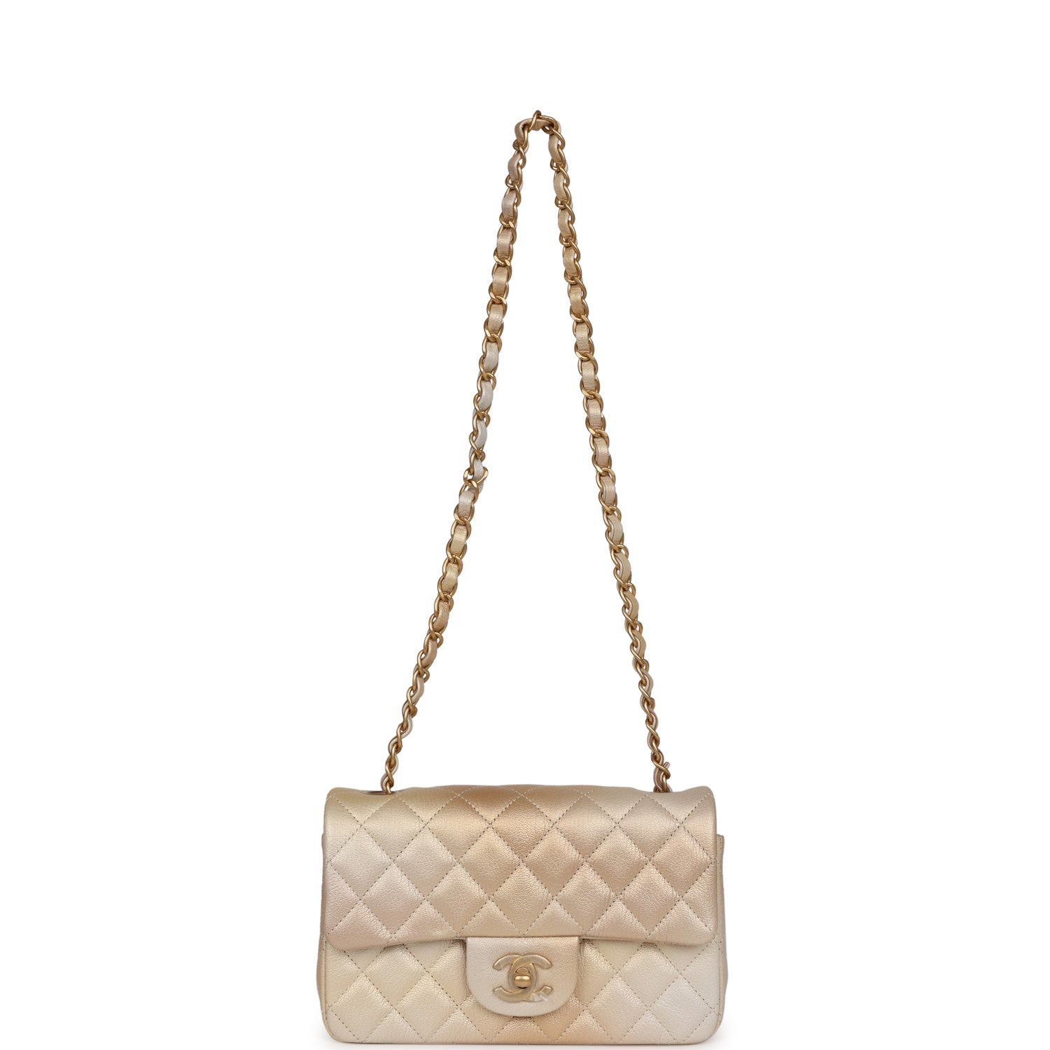 Regular price $2,220.00 Sale price $450.00 Save $1,770.00This Mini Classic Rectangular Flap Bag is in green iridescent lambskin with light gold hardware and features a front flap with CC turnlock closure, half moon back pocket and interwoven light gold chain link and green leather shoulder/crossbody strap.