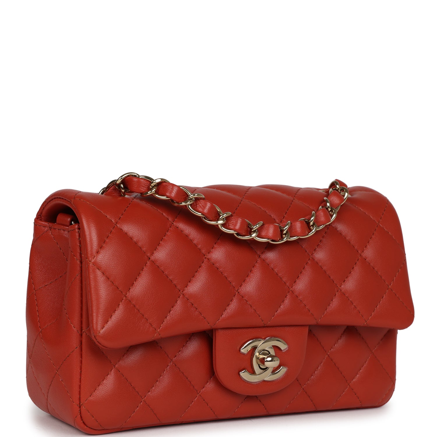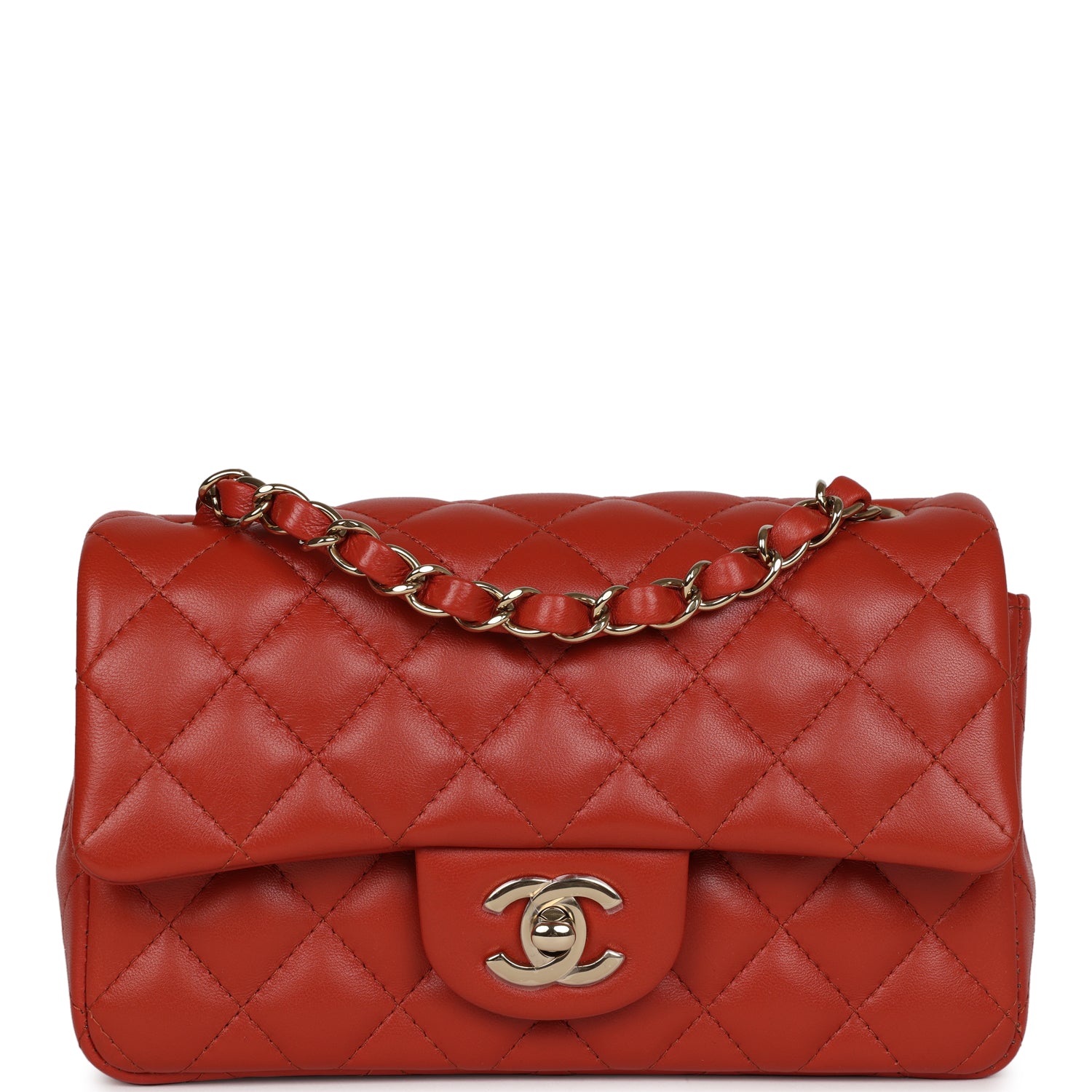 Regular price $1,880.00 Sale price $450.00 Save $1,430.00This Mini Rectangular flap bag is in Maroon lambskin with gold tone hardware and has a front flap with signature CC turnlock closure, rear half moon pocket and single interwoven maroon leather and gold tone chain link shoulder/crossbody strap.