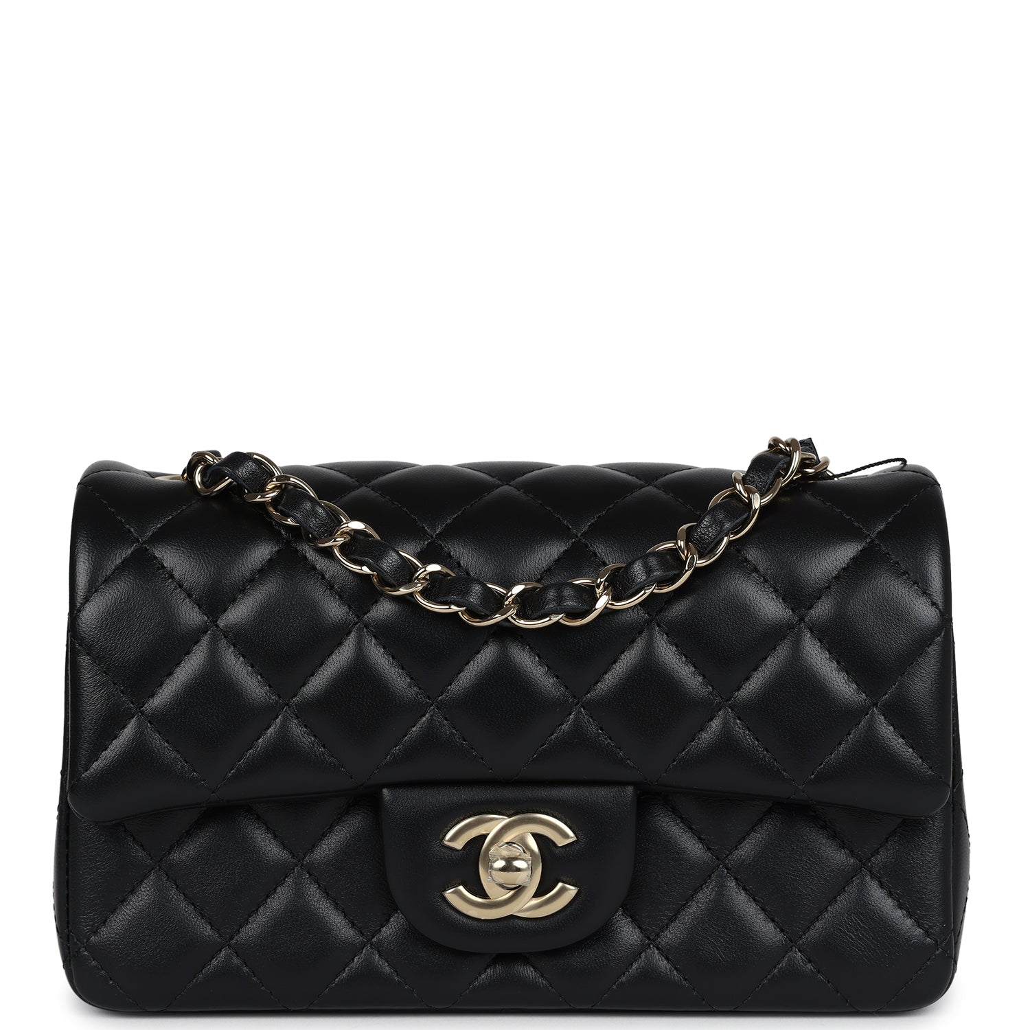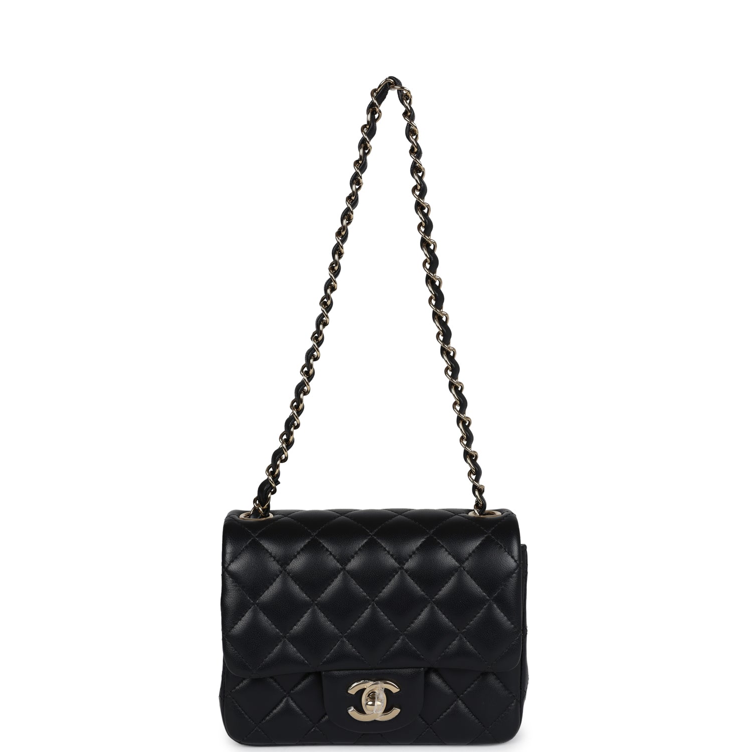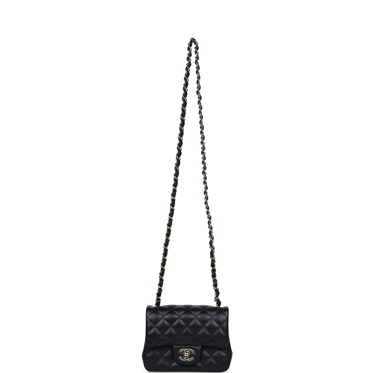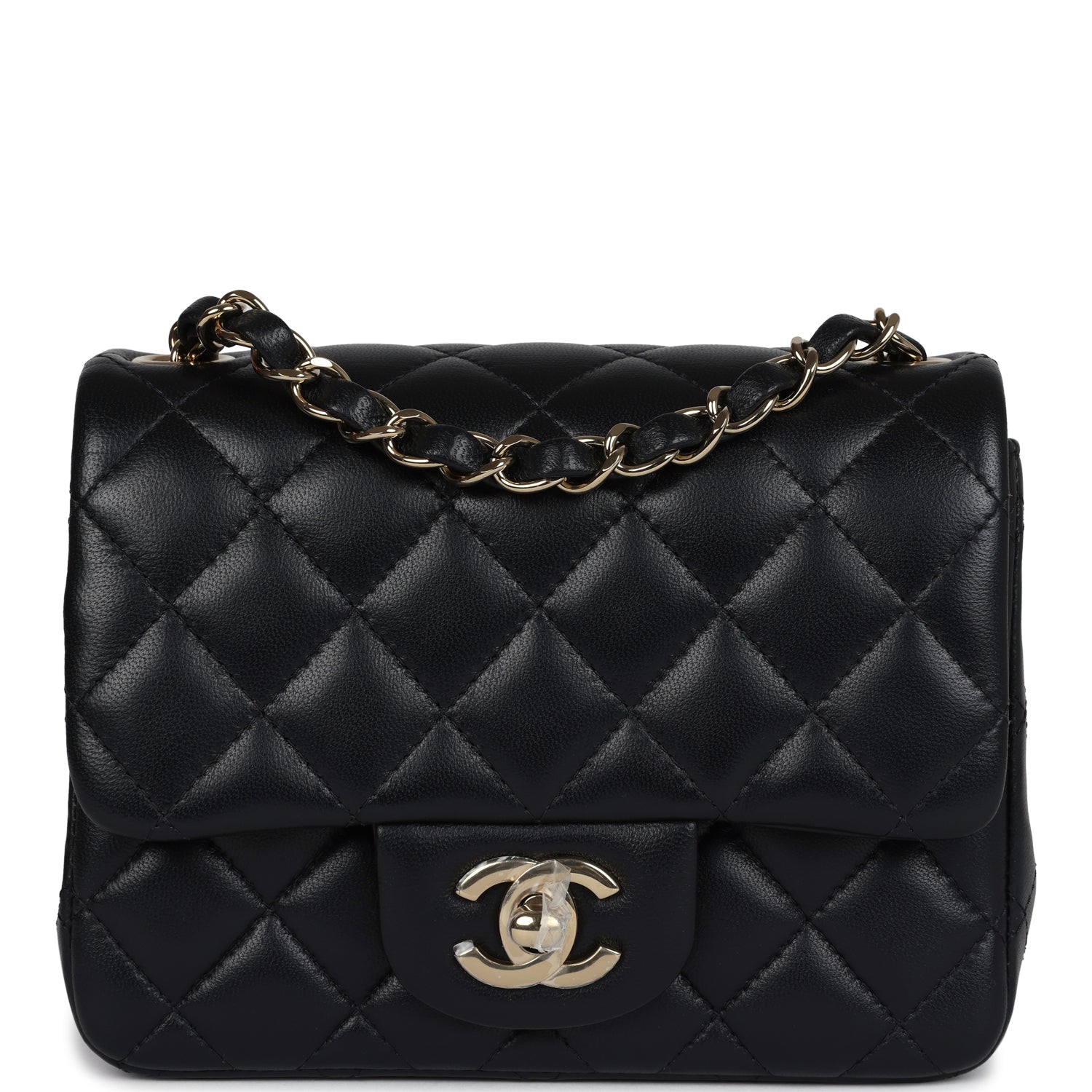 Regular price $16,950.00 Sale price $1,210.00 Save $15,740.00This Chanel Classic Mini Square flap bag is in black lambskin leather with light gold tone hardware and has a front flap with signature CC turnlock closure, tonal stitching, rear half moon pocket and single interwoven black leather and light gold tone chain link shoulder/crossbody strap.