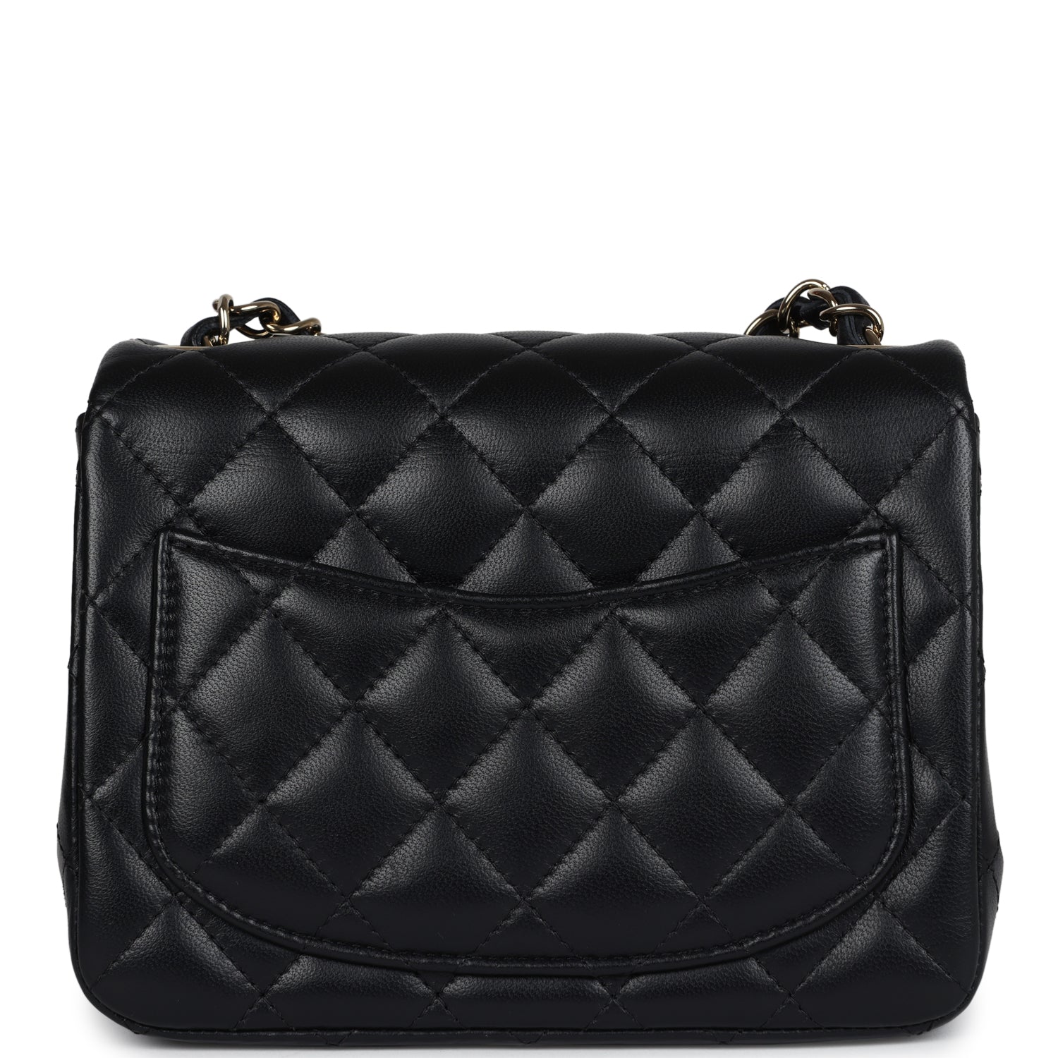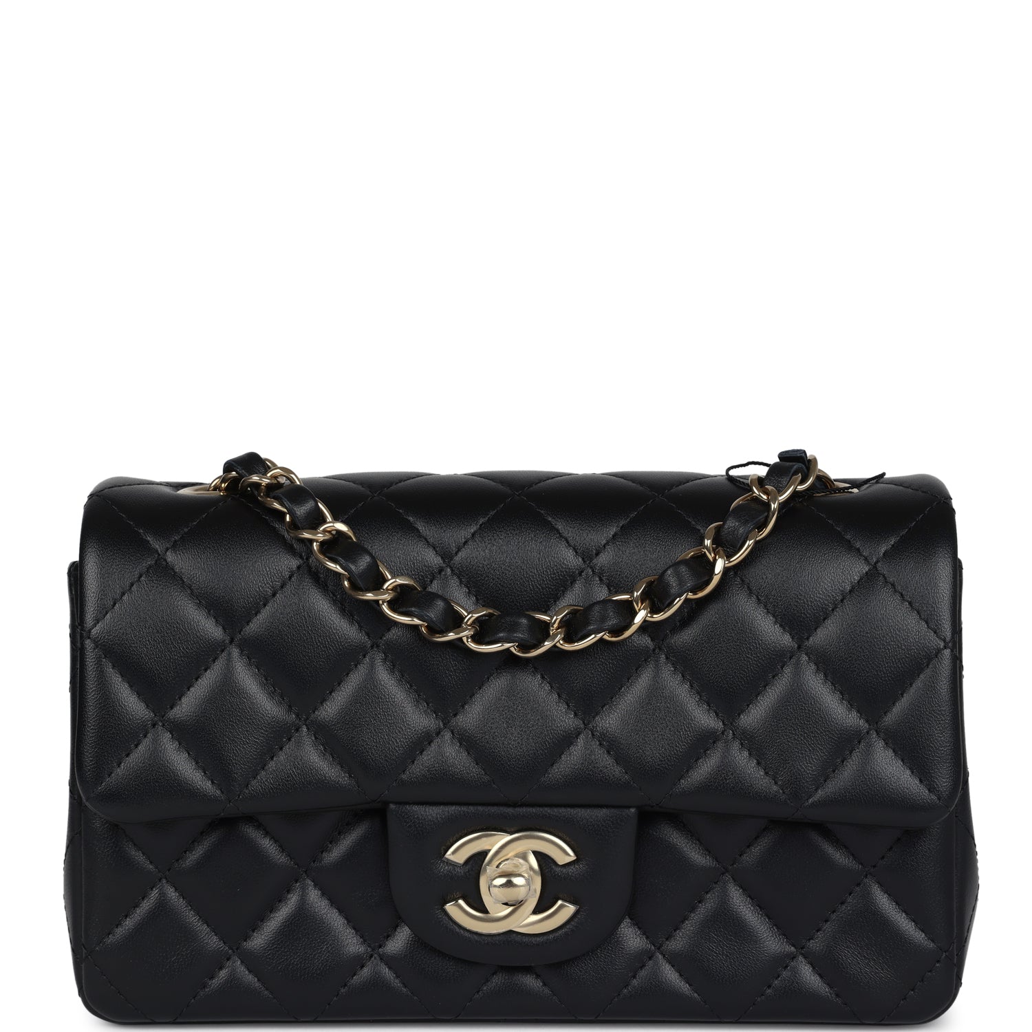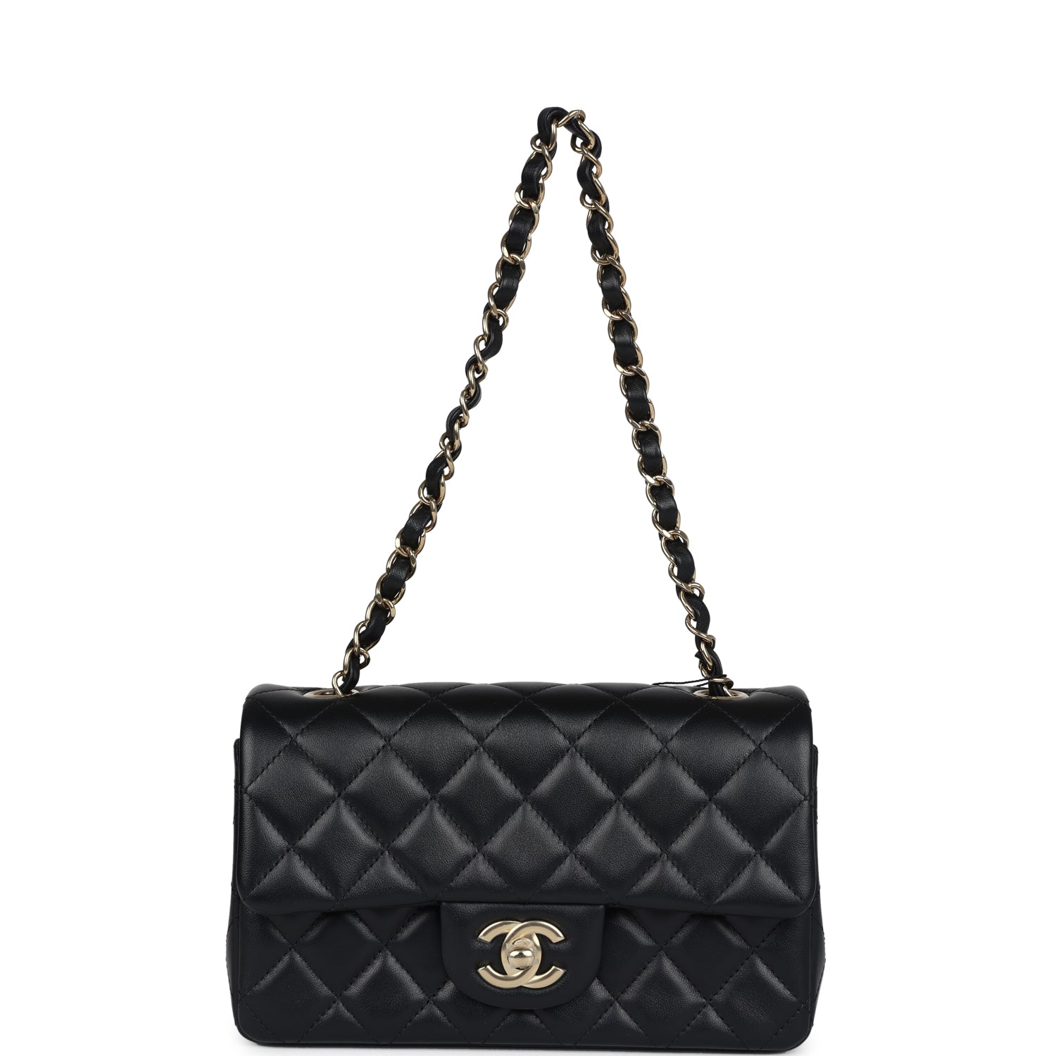 Regular price $16,950.00 Sale price $1,210.00 Save $15,740.00This Chanel Classic Mini Square flap bag is in black lambskin leather with light gold tone hardware and has a front flap with signature CC turnlock closure, tonal stitching, rear half moon pocket and single interwoven black leather and light gold tone chain link shoulder/crossbody strap.