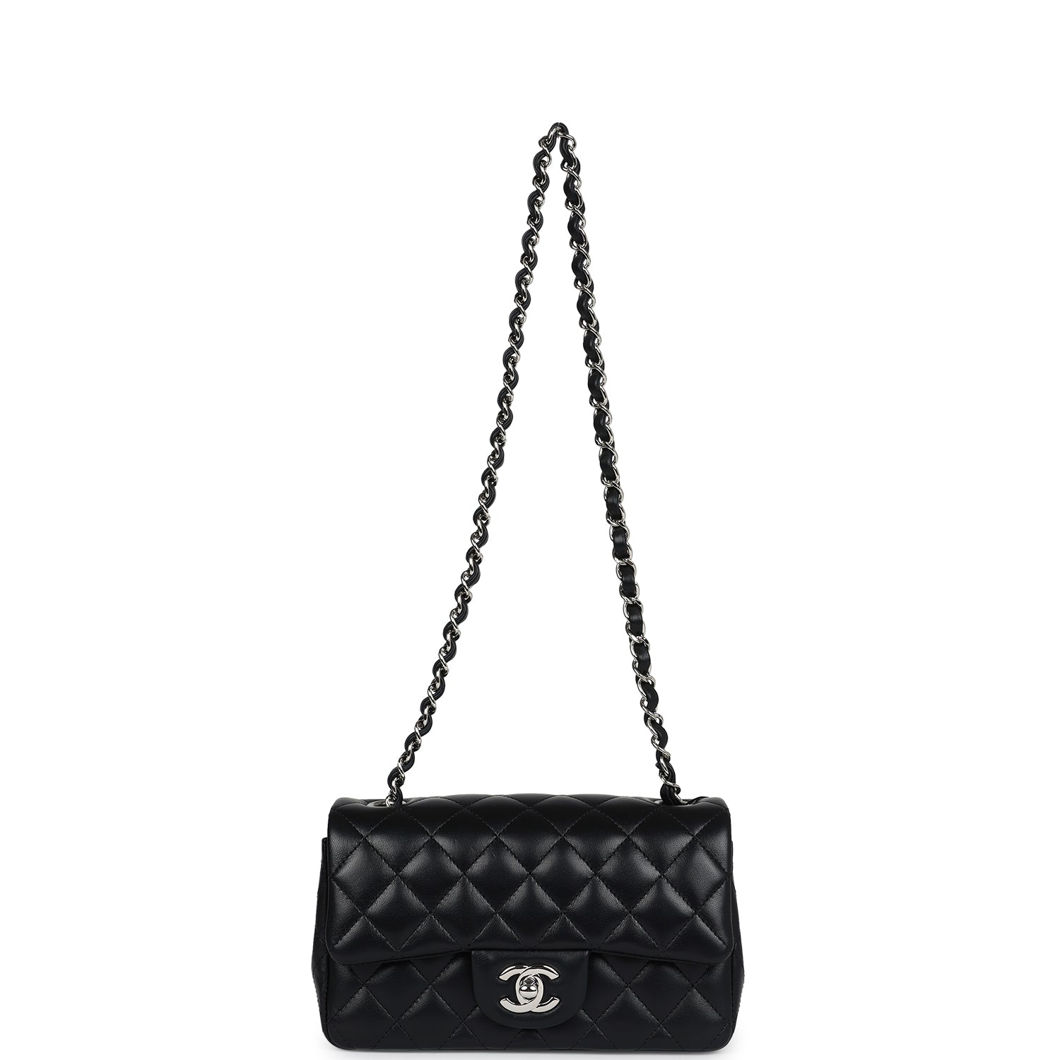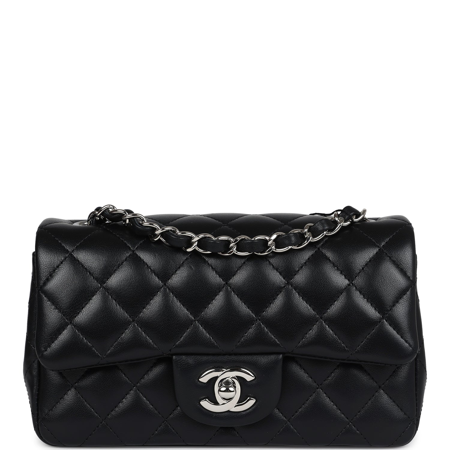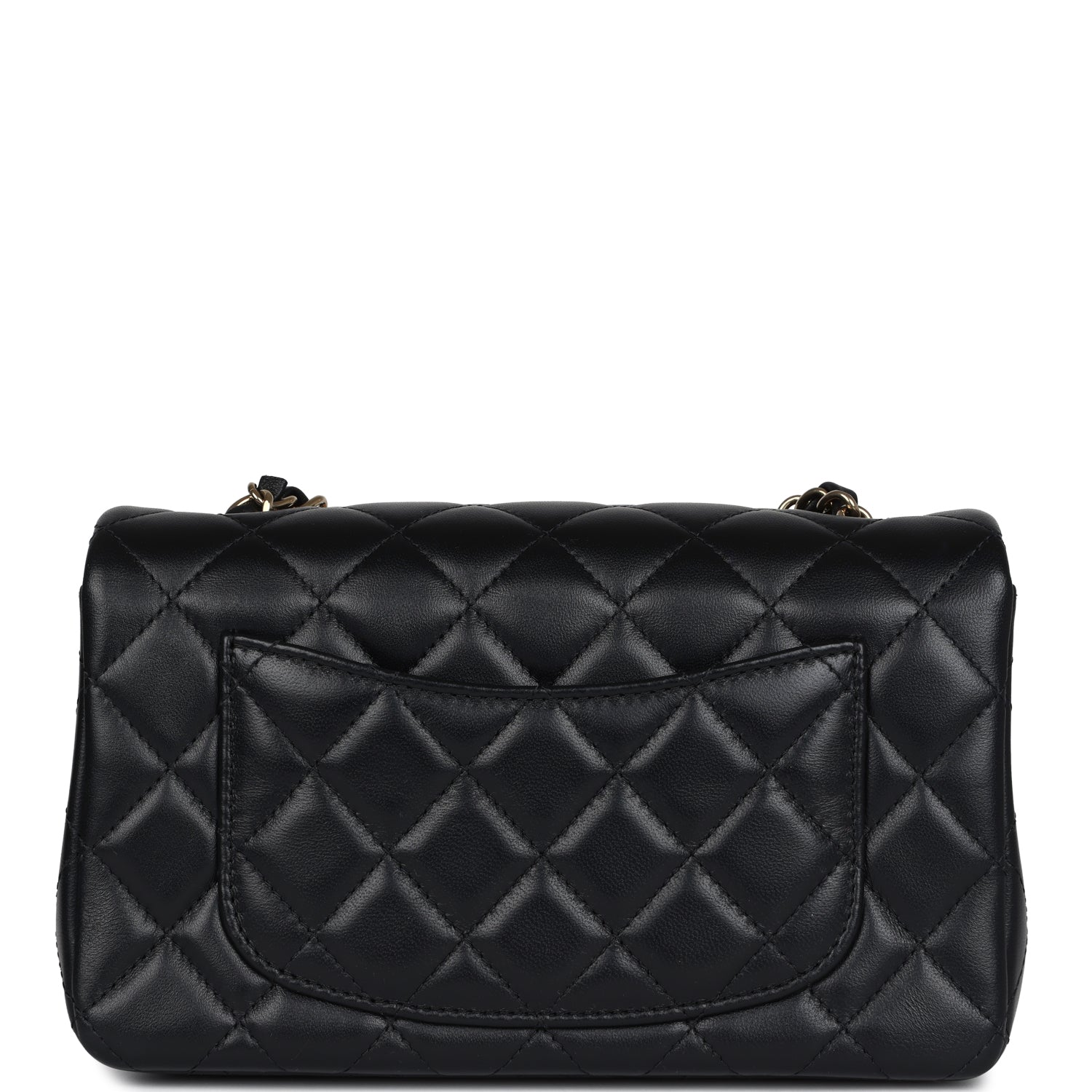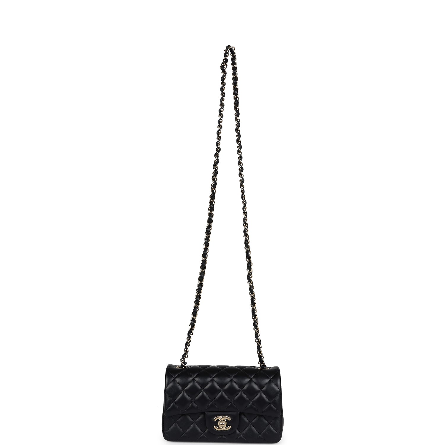 Regular price $16,950.00 Sale price $1,210.00 Save $15,740.00This Chanel Classic Mini Square flap bag is in black lambskin leather with light gold tone hardware and has a front flap with signature CC turnlock closure, tonal stitching, rear half moon pocket and single interwoven black leather and light gold tone chain link shoulder/crossbody strap.