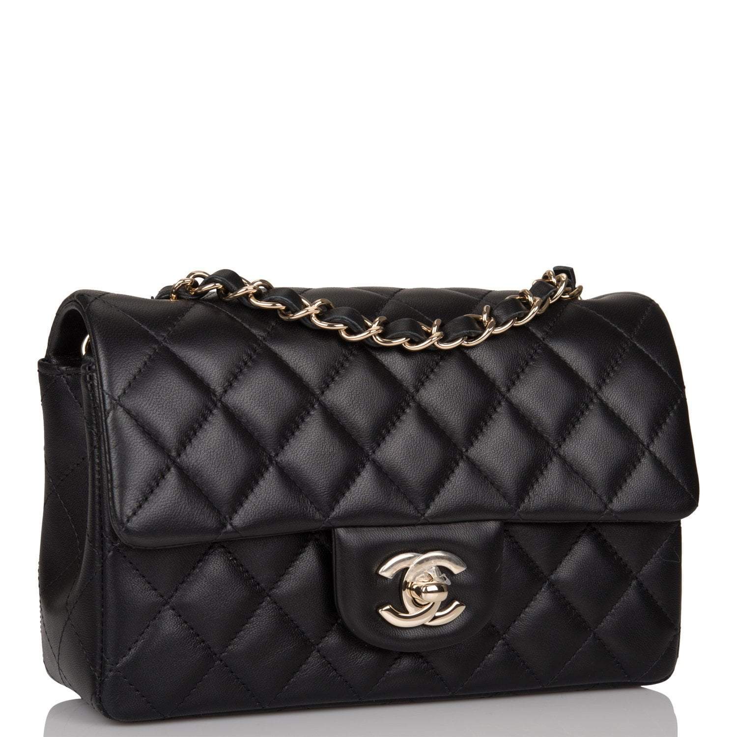 Regular price $1,065.30 Sale price $639.18 Save $426.12This Mini Rectangular flap bag is of green lambskin leather with light gold tone hardware and has a front flap with signature CC turnlock closure, rear half moon pocket, single interwoven green leather and light gold tone chain link shoulder/crossbody strap.