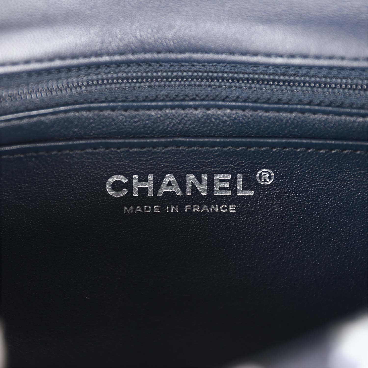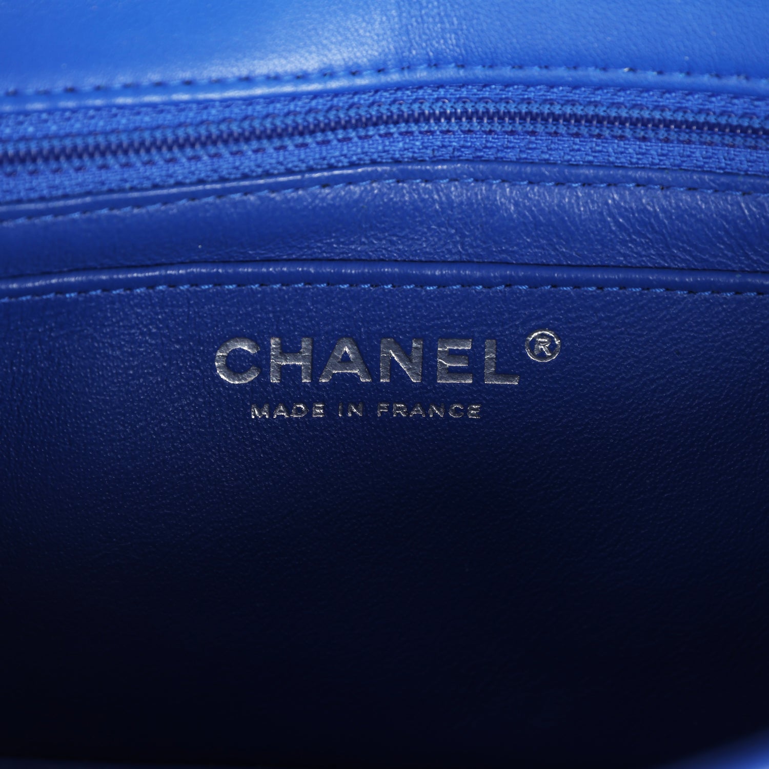 Regular price $18,530.00 Sale price $1,240.00 Save $17,290.00This mini rectangular flap bag is in blue patent leather with ruthenium hardware and has a front flap with signature CC turnlock closure, rear half moon pocket, single interwoven patent blue leather and ruthenium chain link shoulder/crossbody strap.