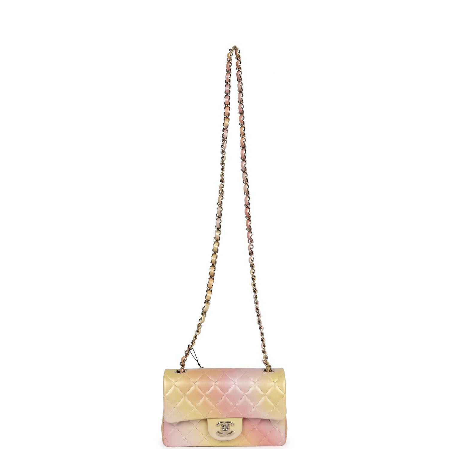 Regular price $1,620.00 Sale price $430.00 Save $1,190.00This Chanel mini classic rectangular flap bag is of ombre iridescent pink, orange and yellow lambskin leather with light gold tone hardware and has a front flap with signature CC turnlock closure, rear half moon pocket, single interwoven ombre leather and light gold chain link shoulder/crossbody strap.