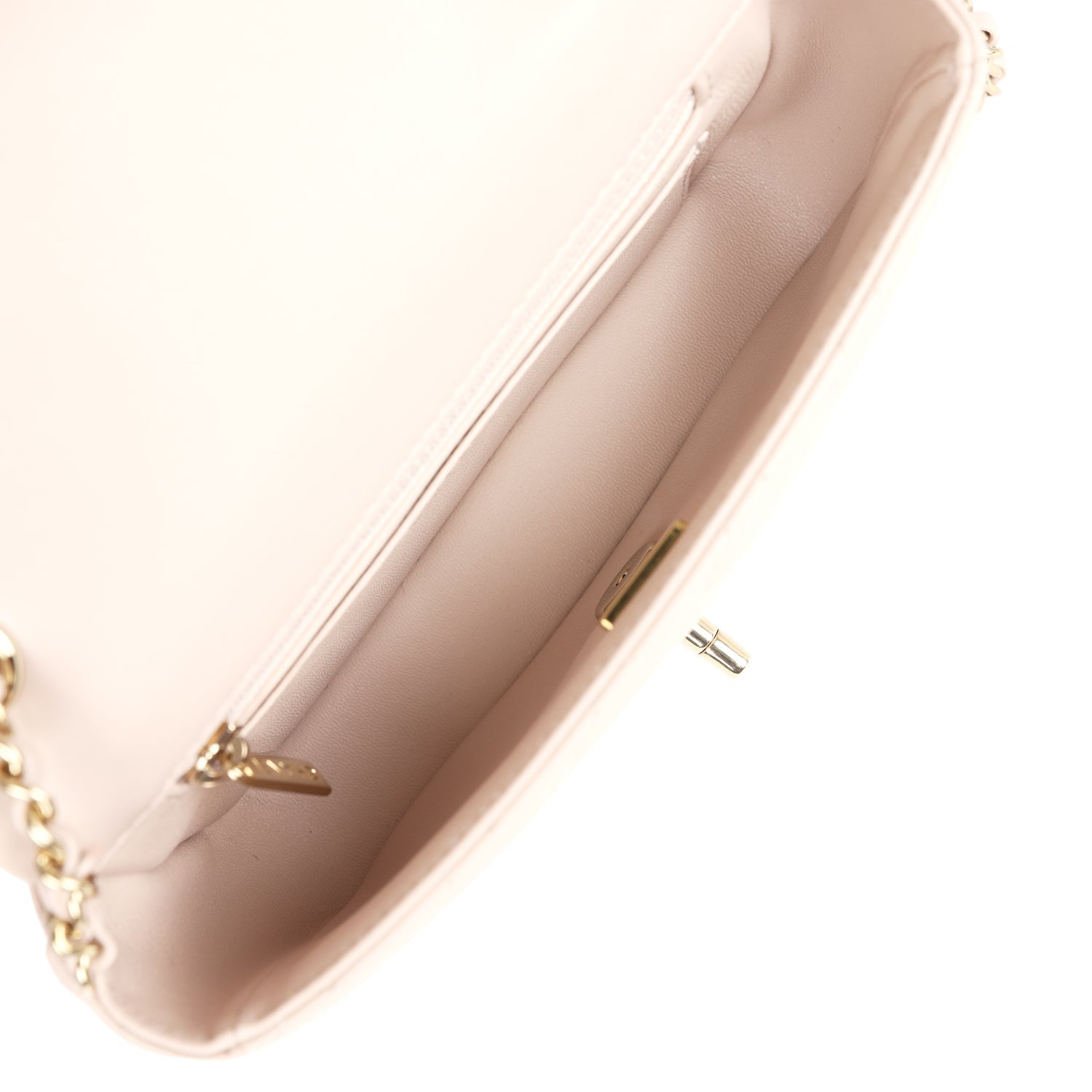 Regular price $1,970.00 Sale price $430.00 Save $1,540.00This Chanel Mini Rectangular Flap Bag is of light beige lambskin with light gold tone hardware, a front flap with CC turnlock closure, half moon back pocket and an interwoven light gold tone chainlink and leather crossbody/shoulder strap.