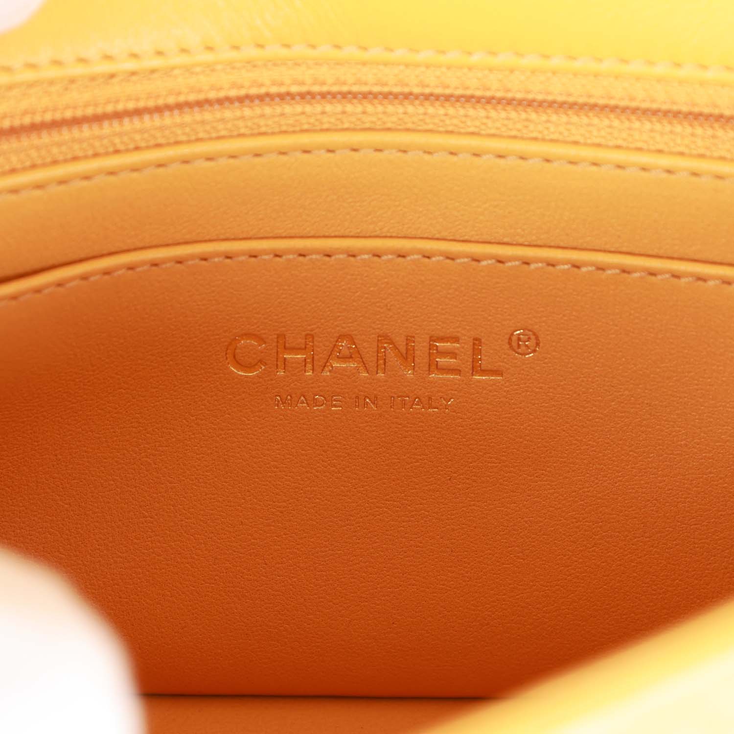 The interior is lined in yellow leather and features a small zip pocket with Chanel pull and slip pocket underneath on the rear wall.