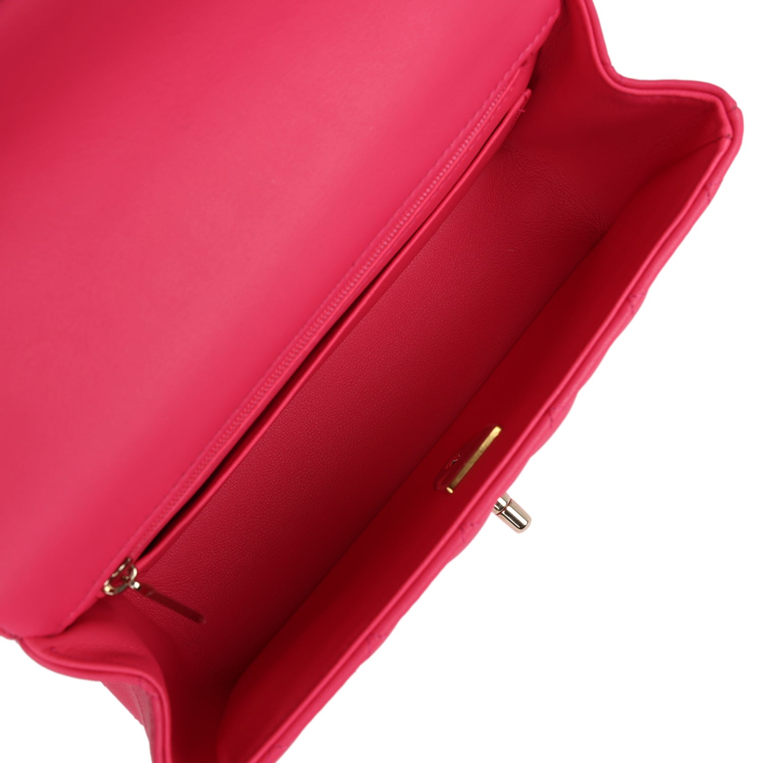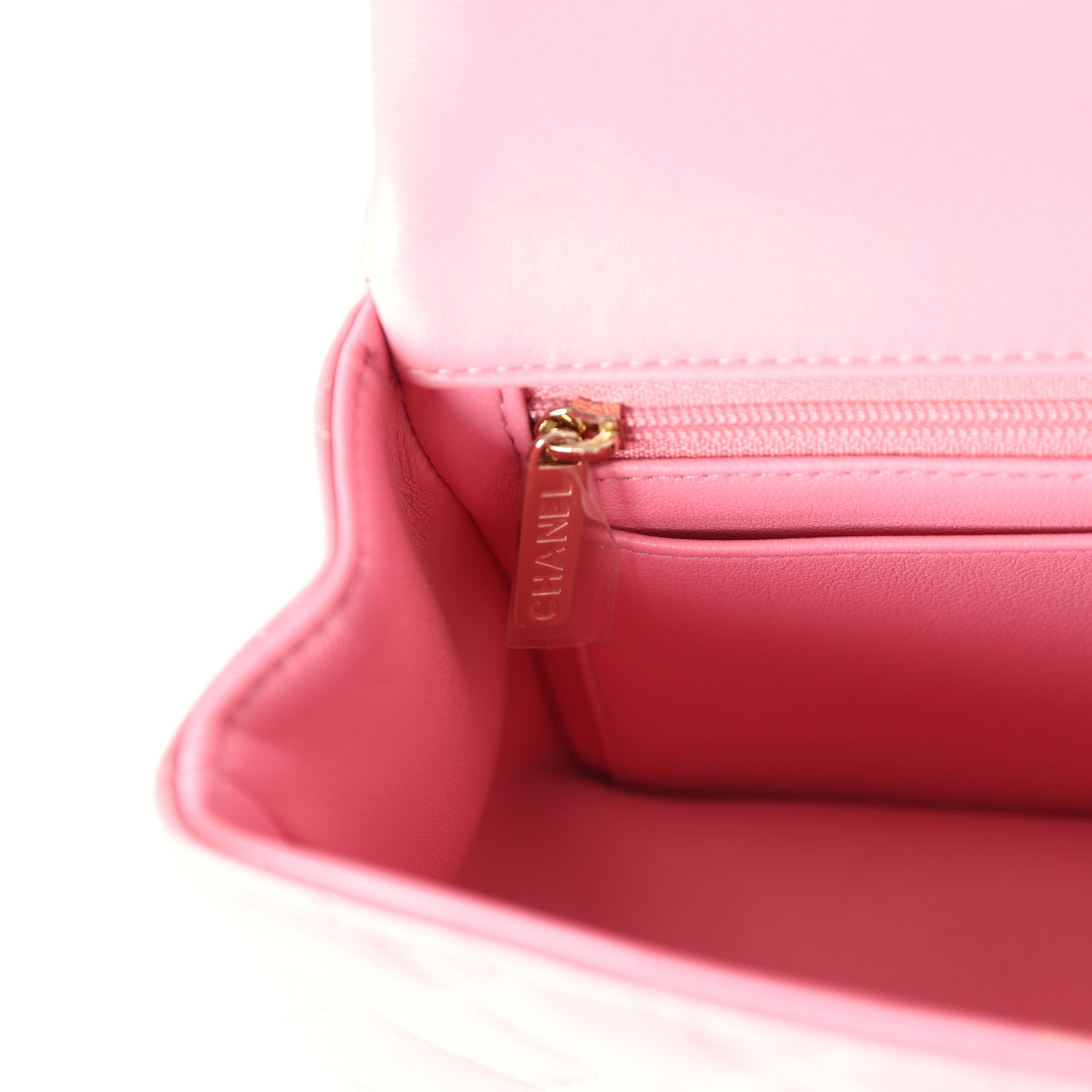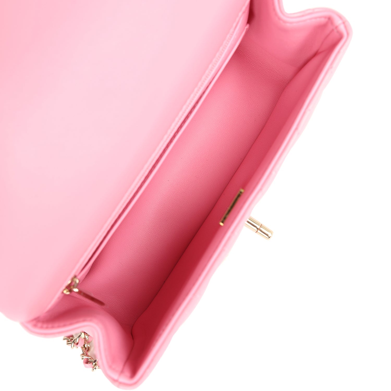 This mini rectangular flap bag is in pink lambskin with light gold tone hardware and has a front flap with signature CC turnlock closure, rear half moon pocket, top handle and single interwoven pink leather and light gold tone chain link shoulder/crossbody strap.