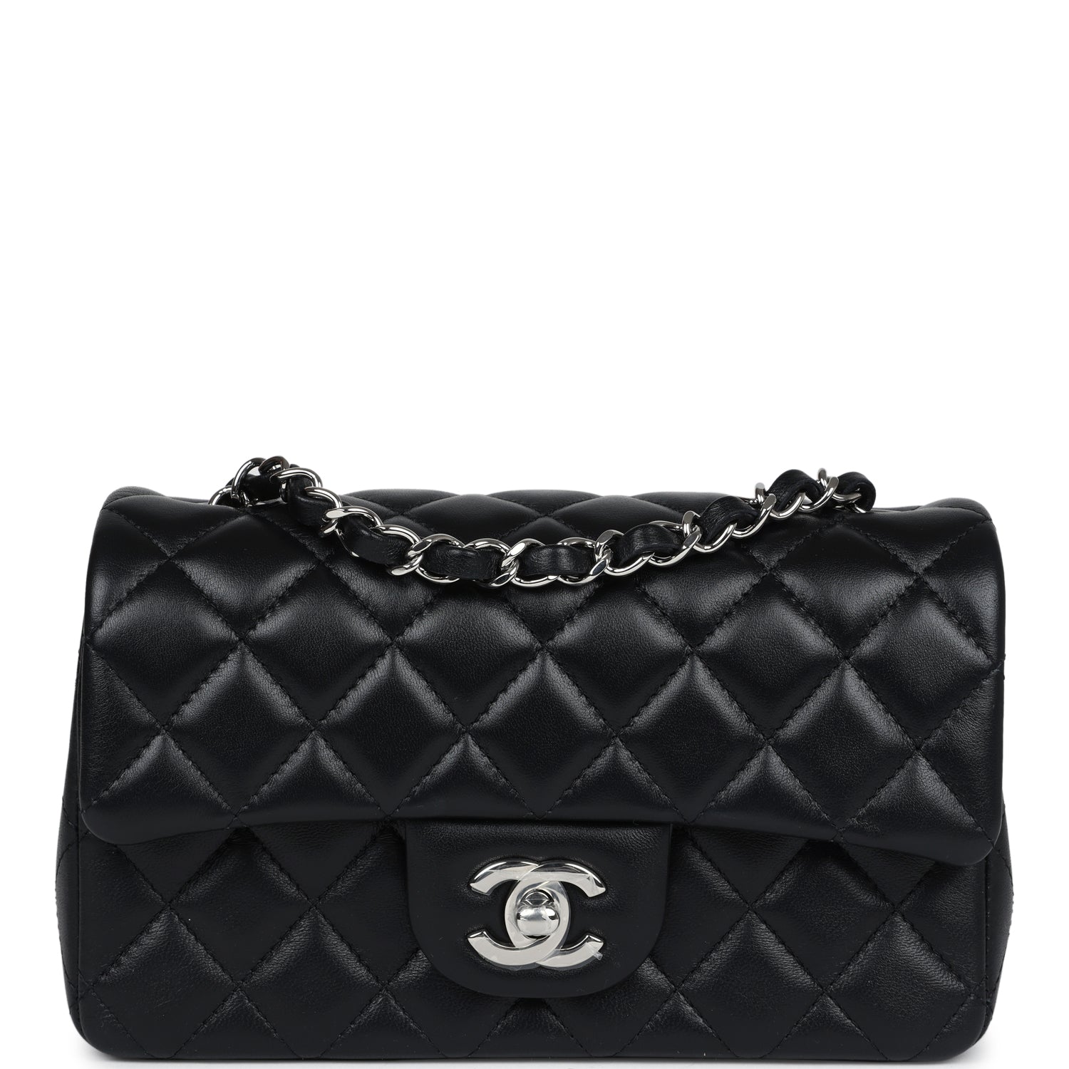 Regular price $1,820.00 Sale price $430.00 Save $1,390.00This Mini Classic Rectangular Flap Bag is in So Black Iridescent lambskin with black hardware and features a front flap with CC turnlock closure, half moon back pocket and interwoven black chain link and black leather shoulder/crossbody strap.