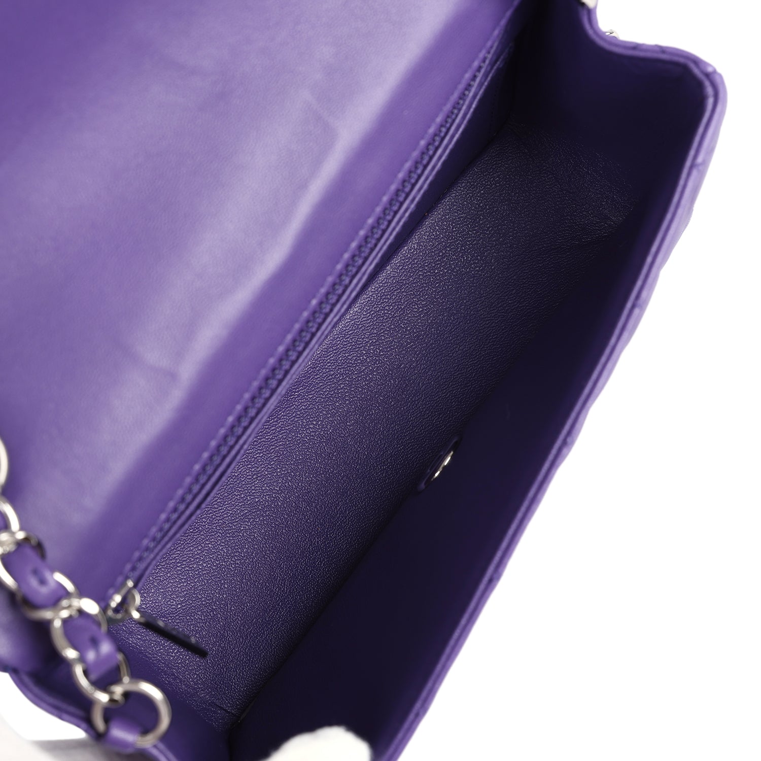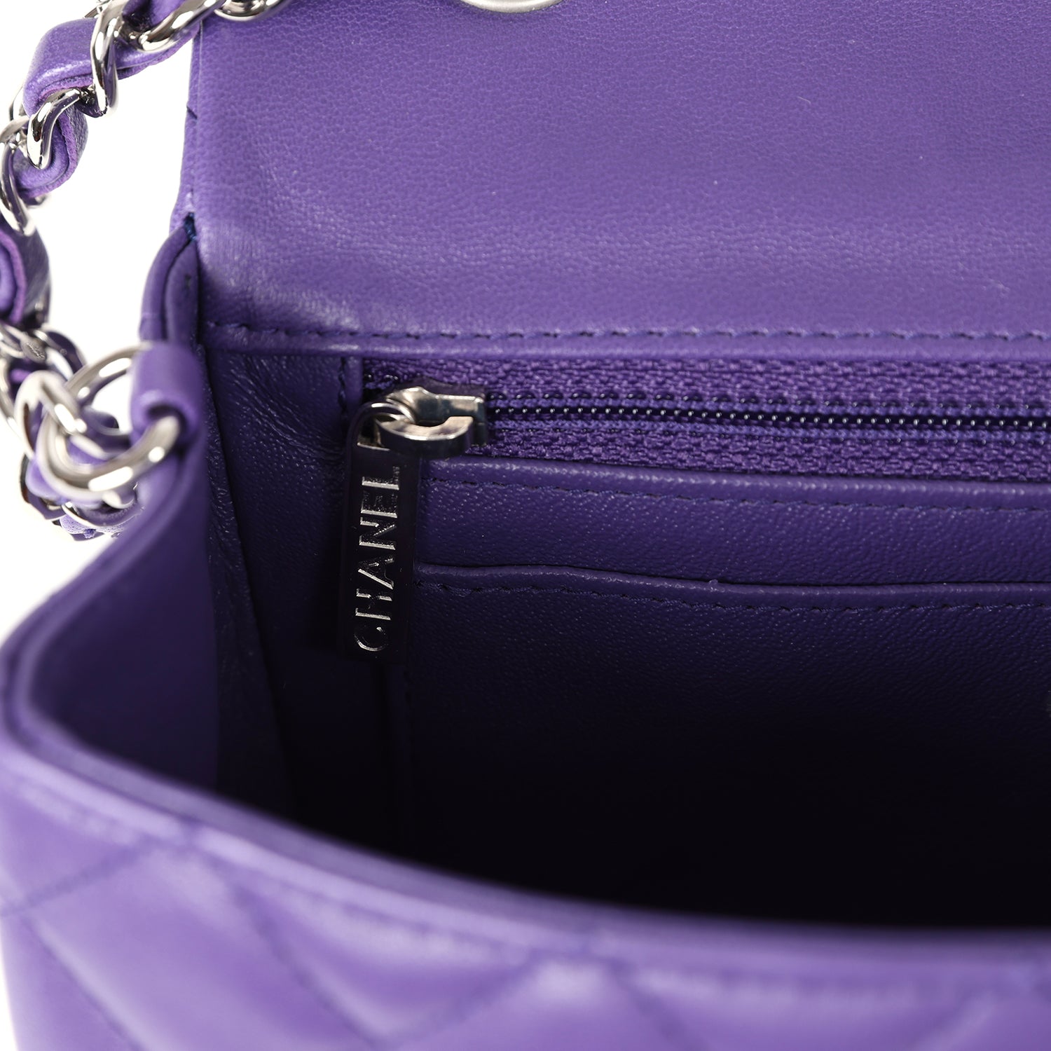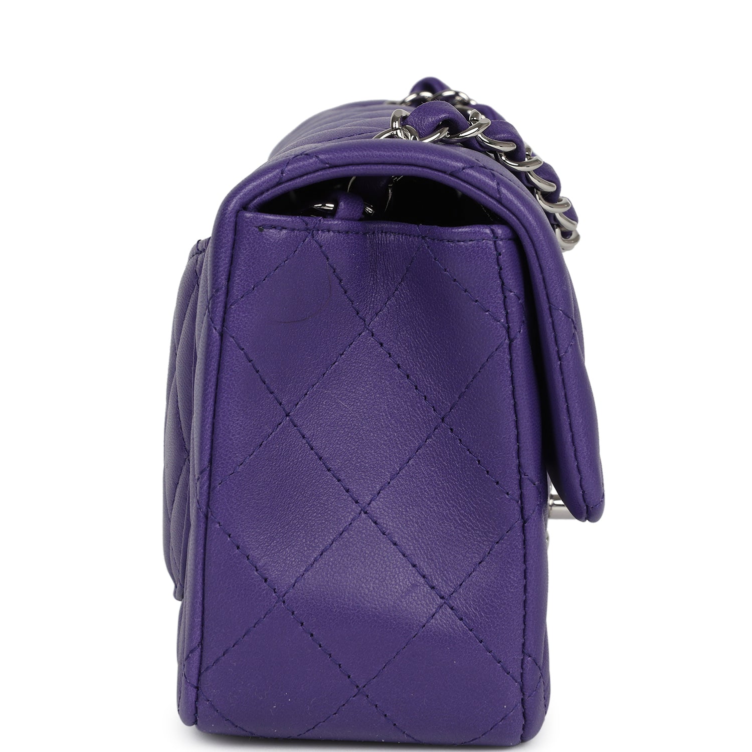 Regular price $1,970.00 Sale price $440.00 Save $1,530.00This Chanel mini classic rectangular flap bag is of dark purple lambskin leather with silver tone hardware and has a front flap with signature CC turnlock closure, rear half moon pocket, single interwoven dark purple leather and silver chain link shoulder/crossbody strap.