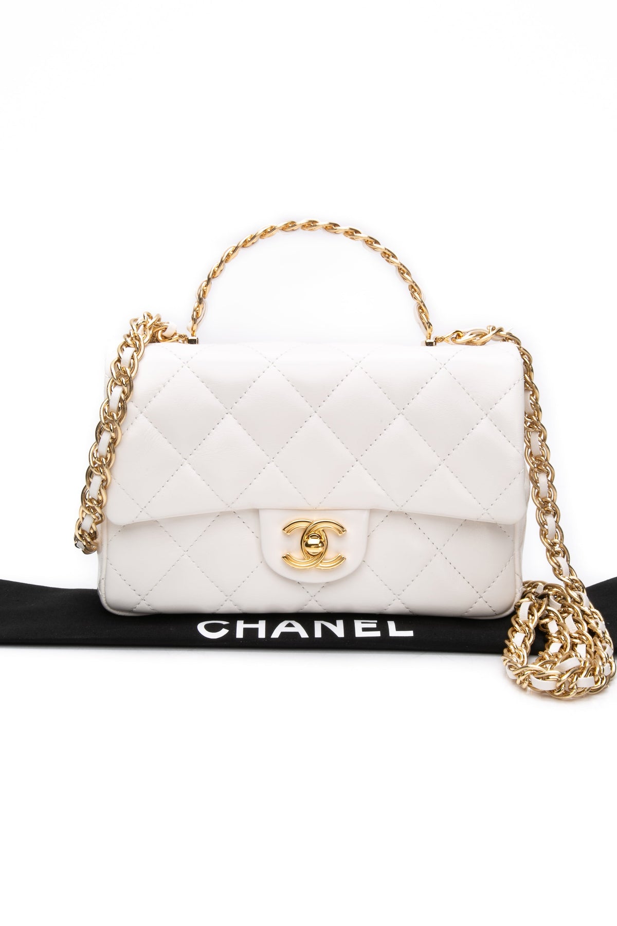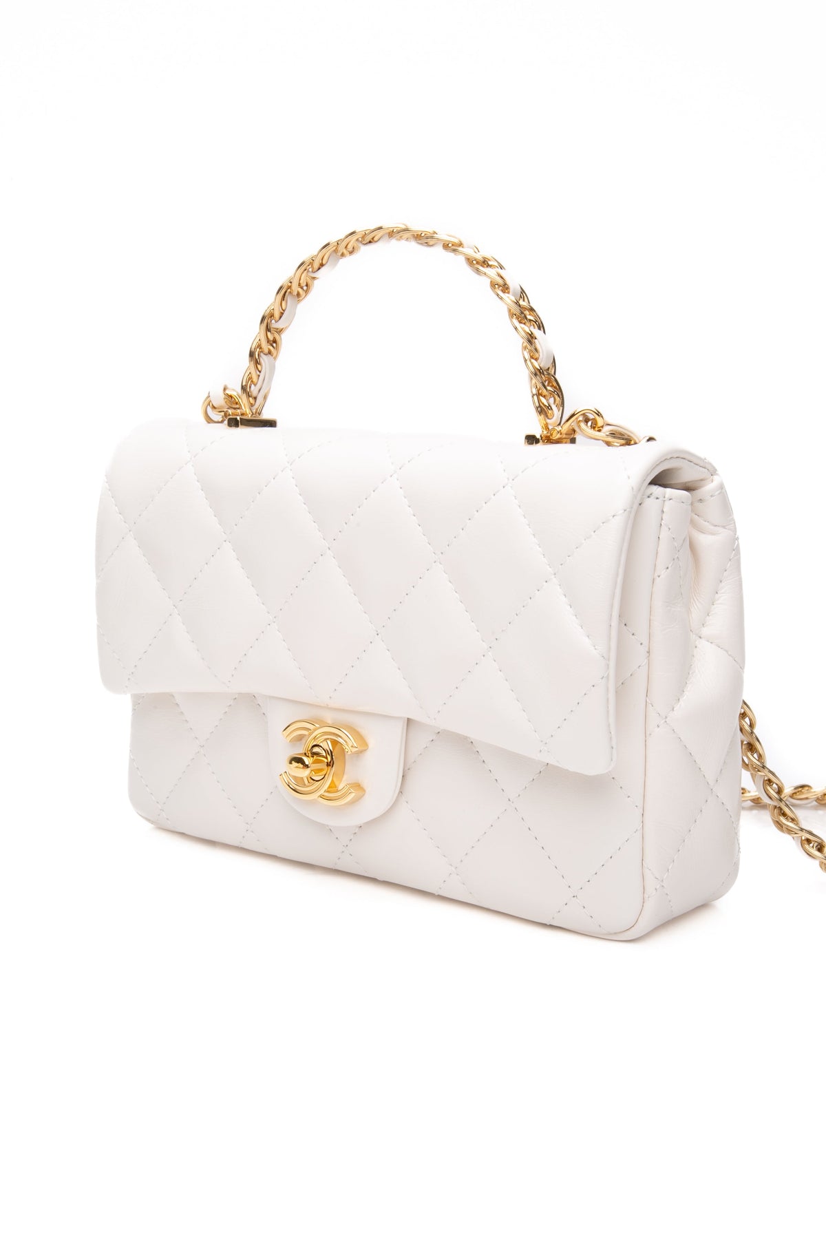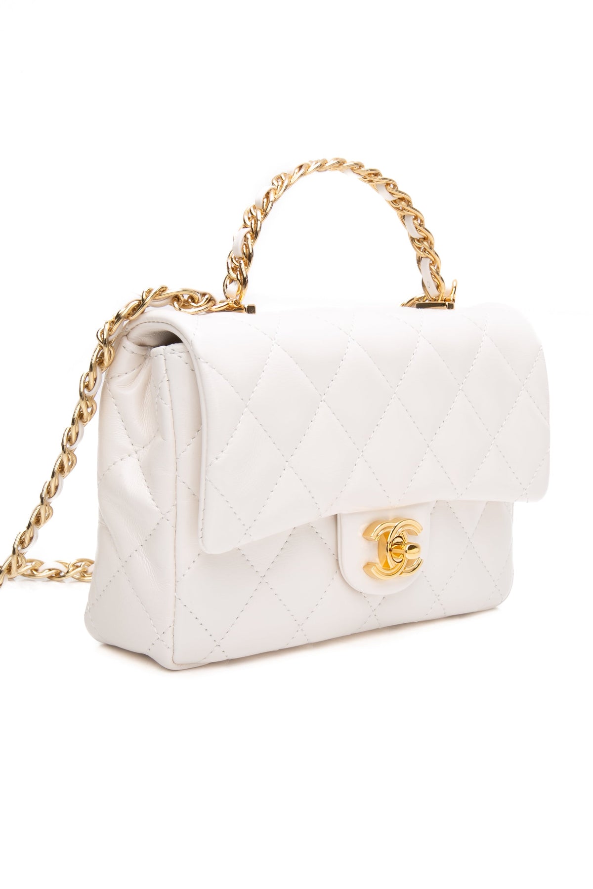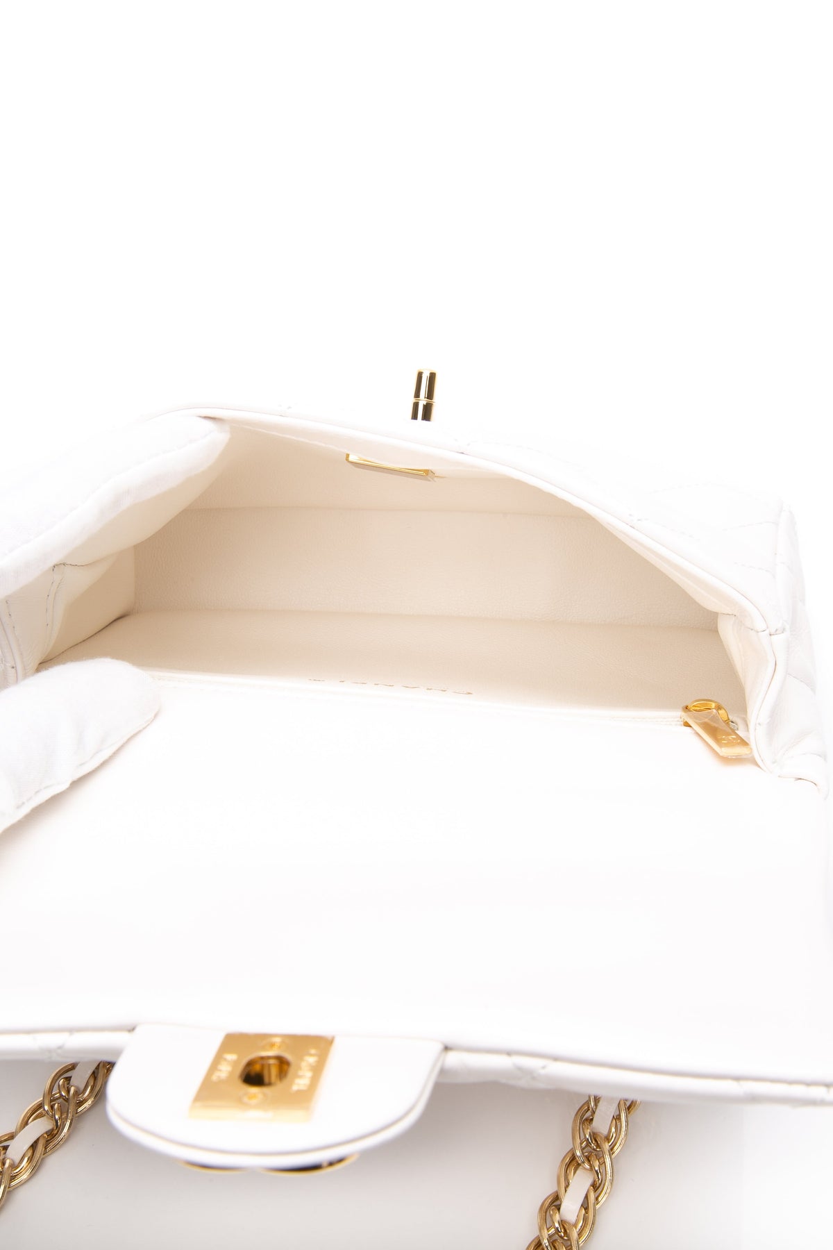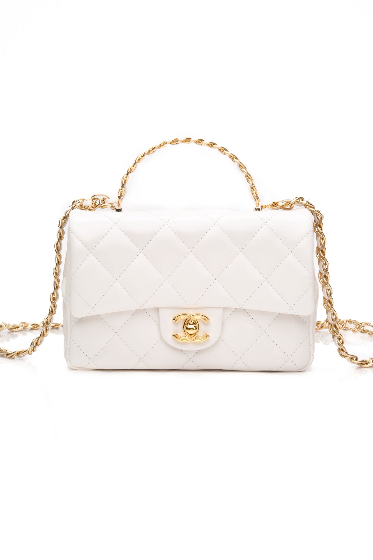 CHANEL Mini White Quilted Calfskin Top Handle Flap Bag with Chain