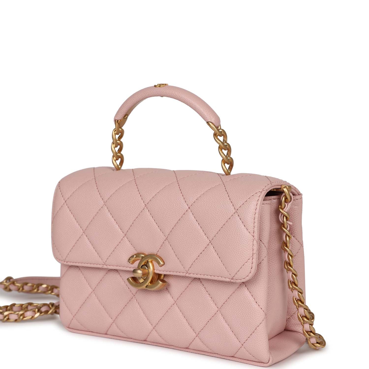Regular price $1,810.00 Sale price $450.00 Save $1,360.00This Mini Top Handle Flap bag is in Pink Caviar leather with Aged Gold Hardware, tonal stitching, front flap with CC turnlock closure, caviar and aged gold top handle, and an interwoven pink leather chainlink shoulder/crossbody strap
