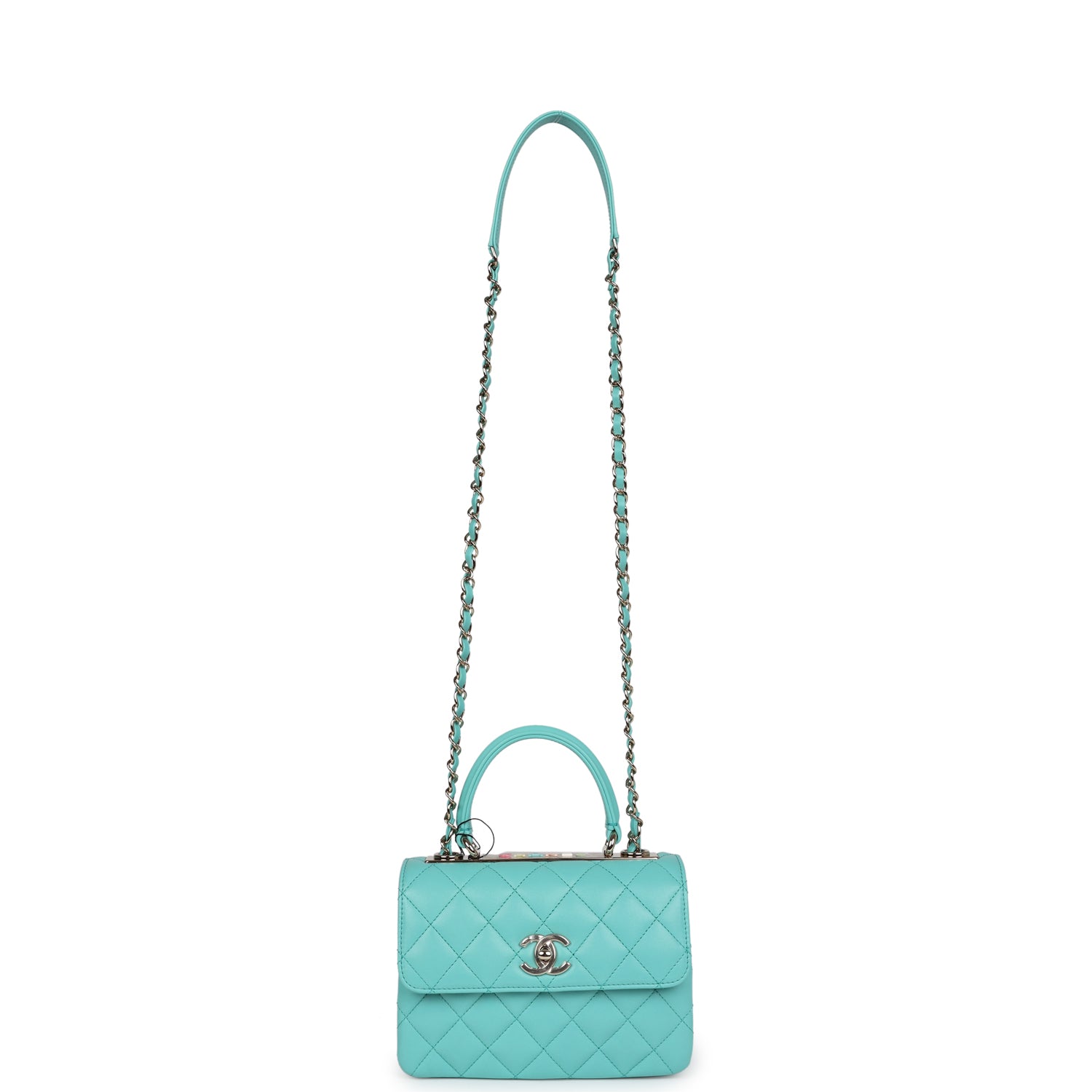 Regular price $1,750.00 Sale price $450.00 Save $1,300.00This Mini Trendy CC bag is in Turquoise lambskin leather with light gold tone hardware and has a front flap with signature CC turnlock closure, rear half moon pocket, single interwoven Turquoise leather and light gold tone chain link shoulder/crossbody strap and top handle.