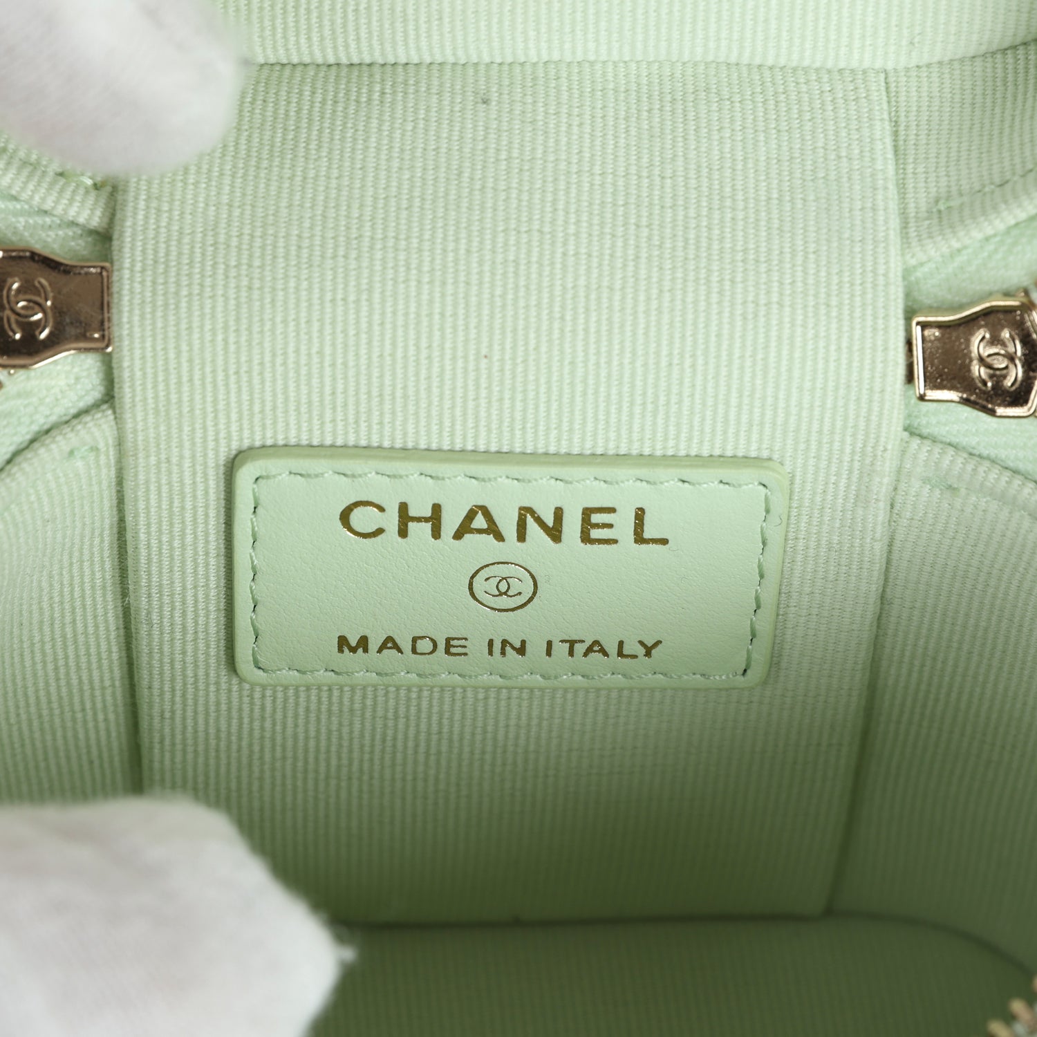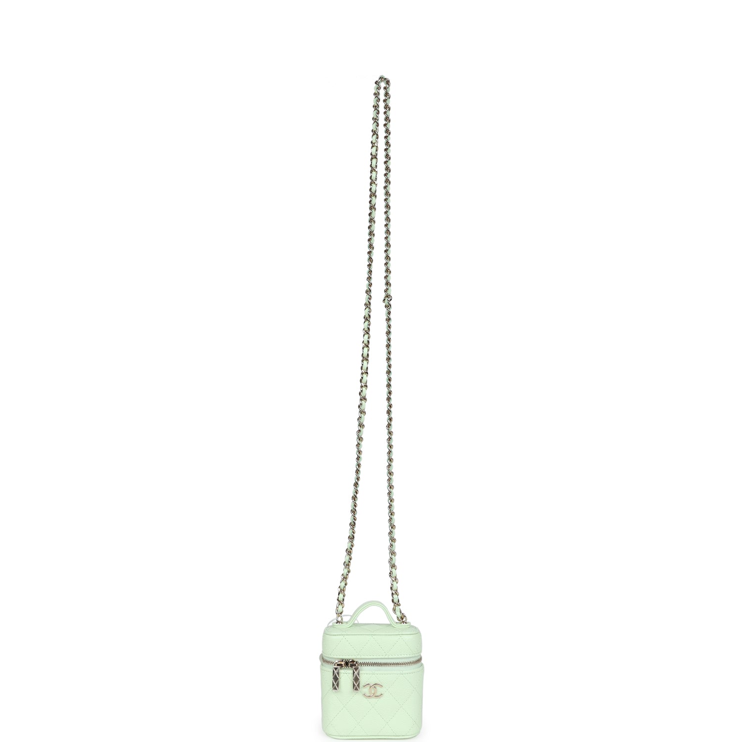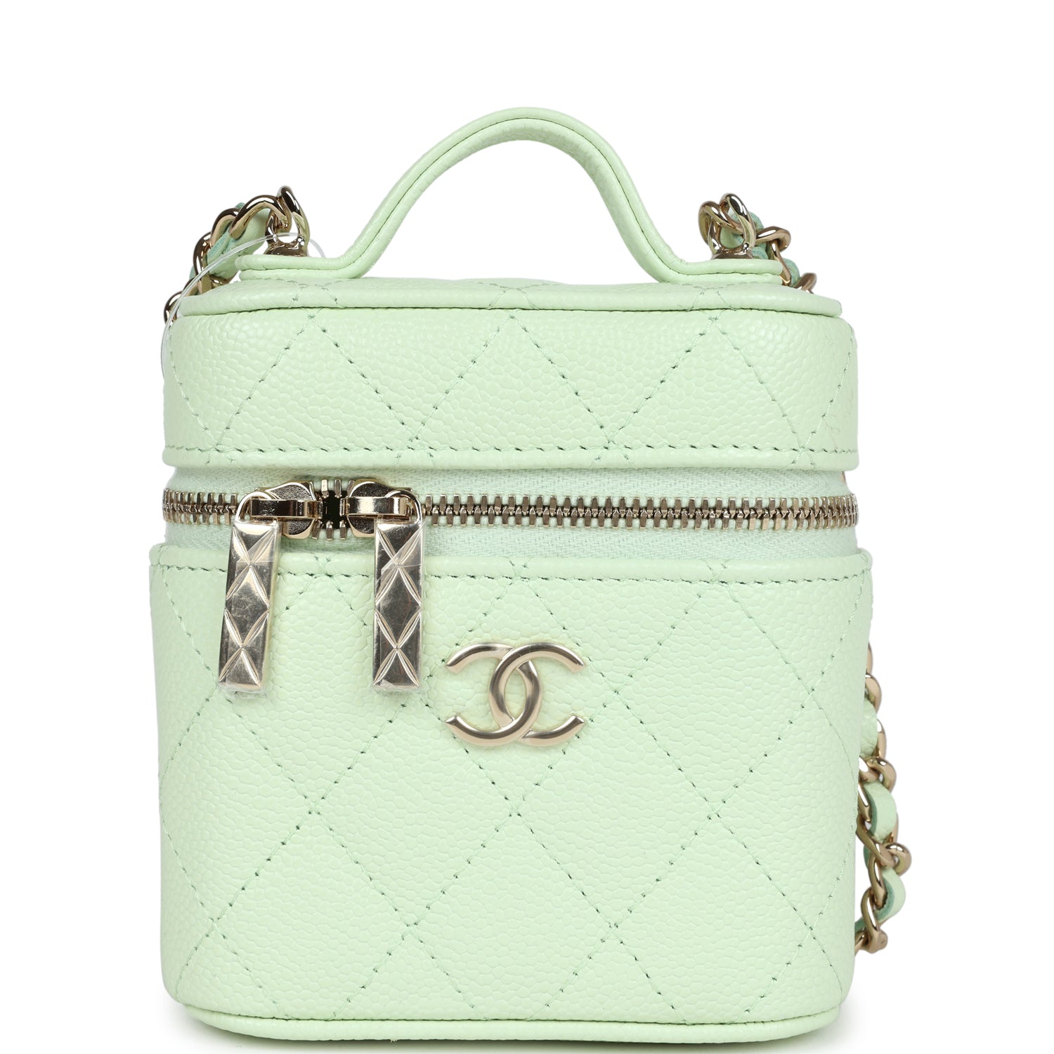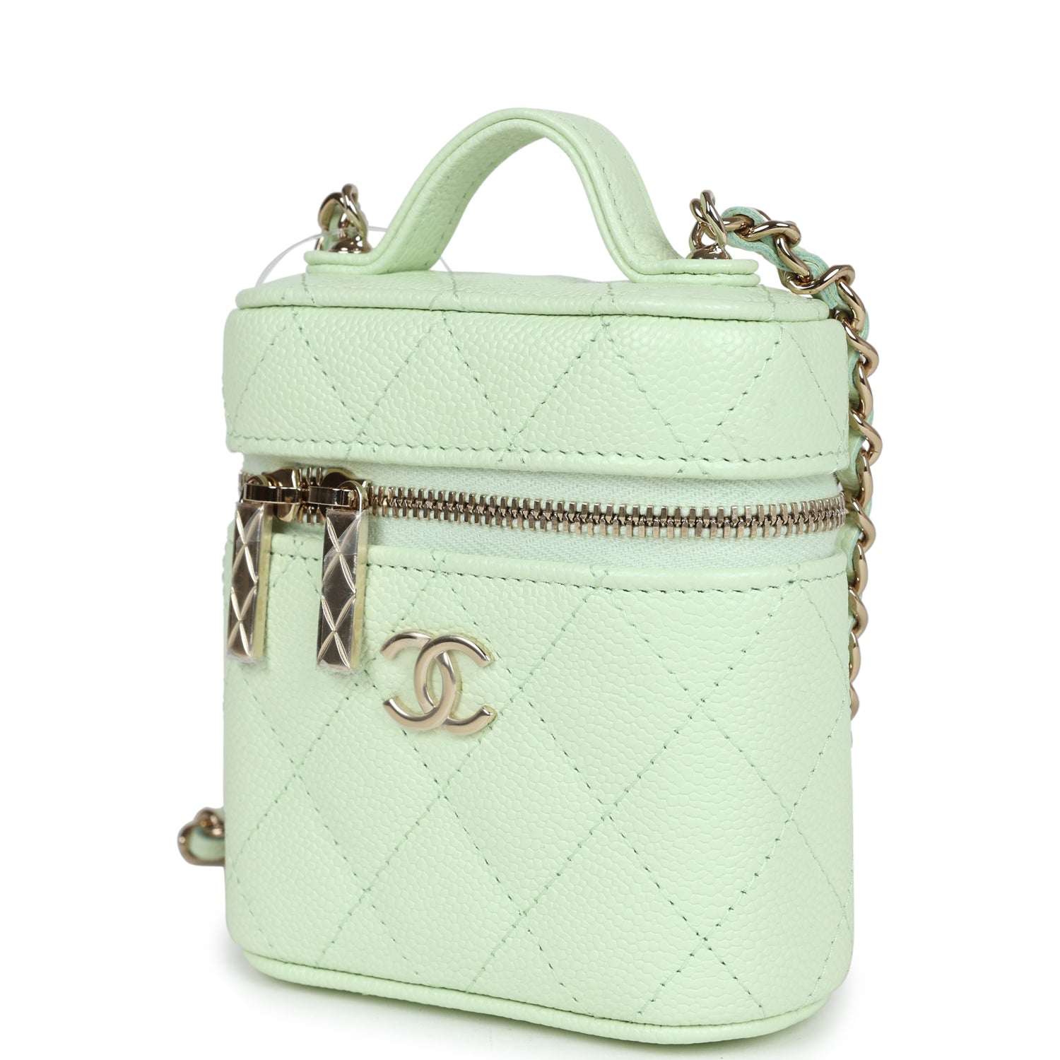 Regular price $2,000.00 Sale price $450.00 Save $1,550.00This Chanel mini top handle vanity case in quilted Light Green caviar leather with Gold tone hardware, features tonal stitching, vertical shaped vanity case Gold tone CC logo on front of vanity case, zip around zipper closure, leather top handle, and a long Gold interwoven with Light Green leather shoulder/crossbody strap.