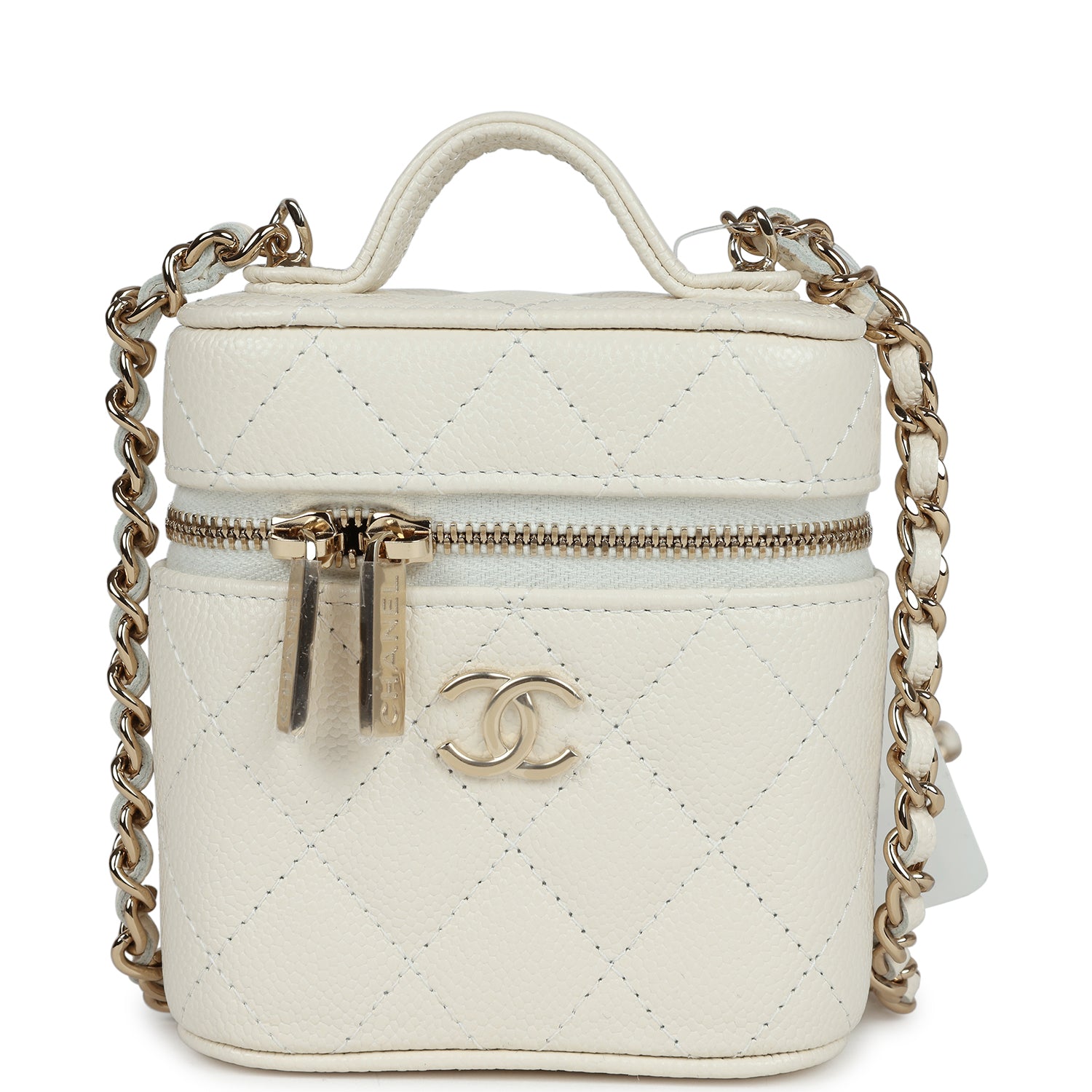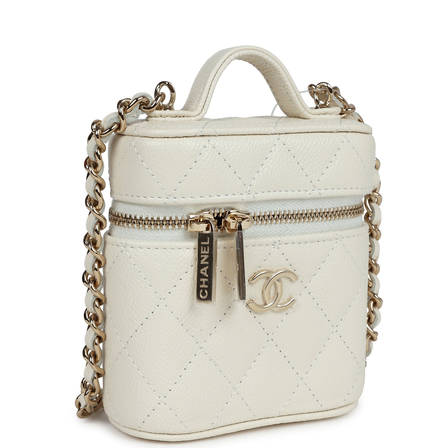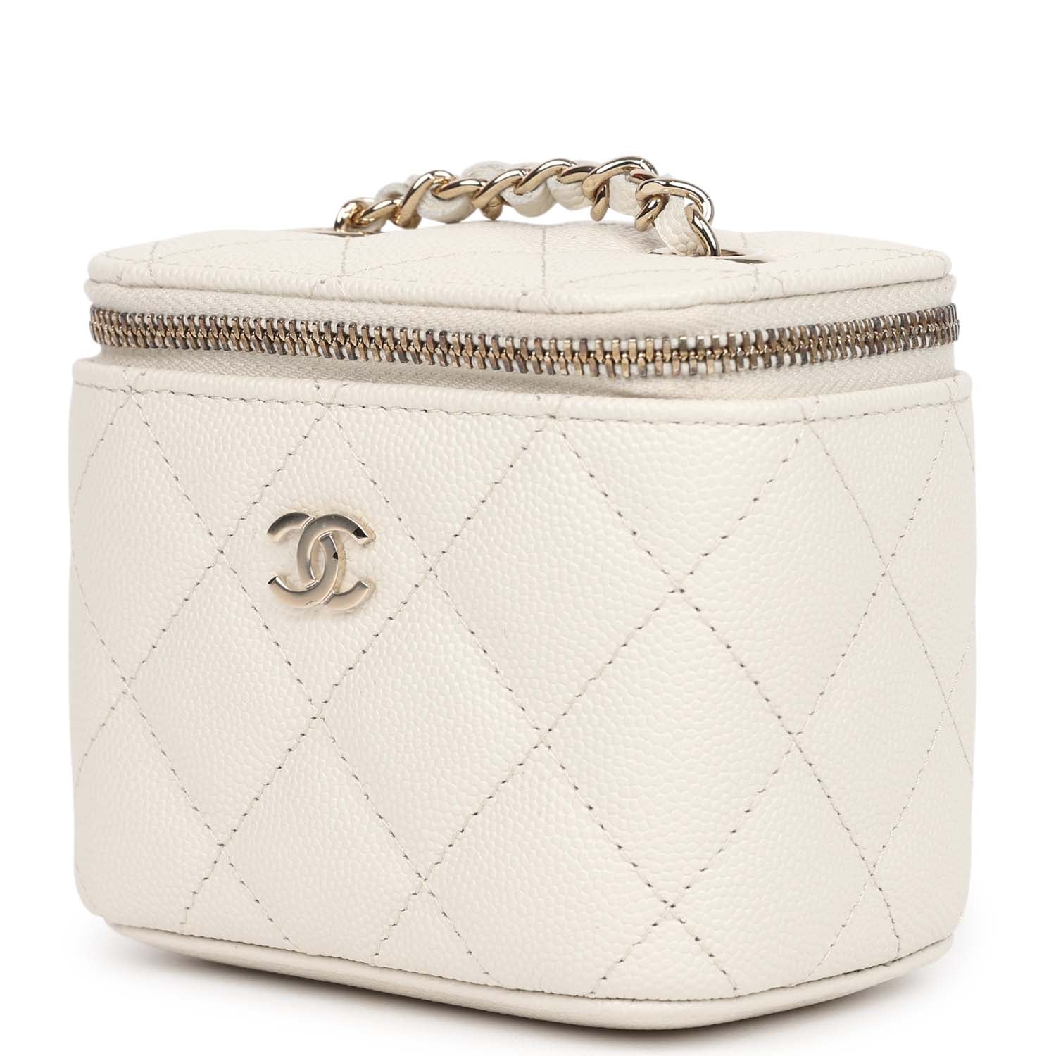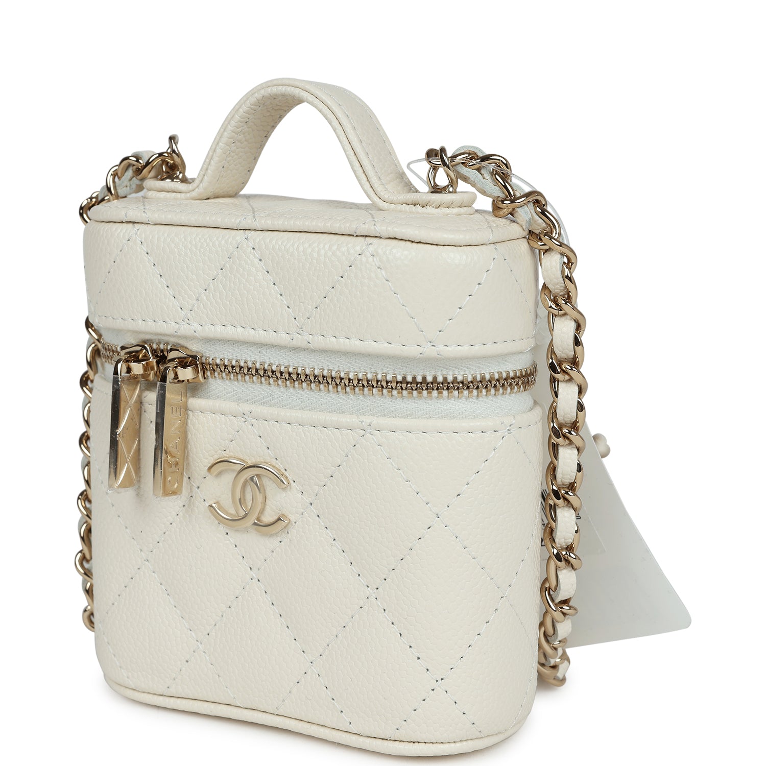 Regular price $1,740.00 Sale price $430.00 Save $1,310.00This Chanel mini top handle vanity case in quilted White caviar leather with Gold tone hardware, features tonal stitching, vertical shaped vanity case Gold tone CC logo on front of vanity case, zip around zipper closure, leather top handle, and a long Gold interwoven with White leather shoulder/crossbody strap.