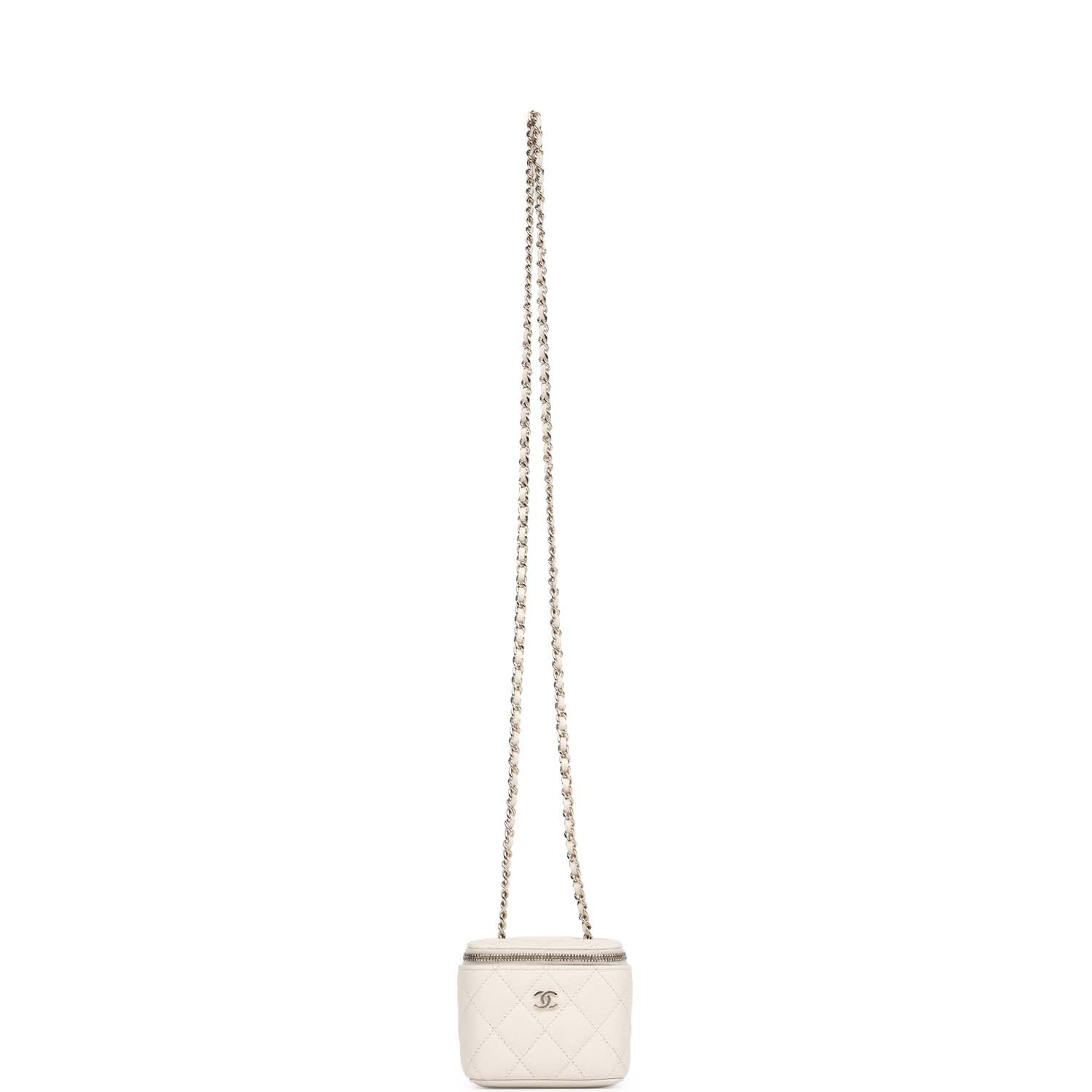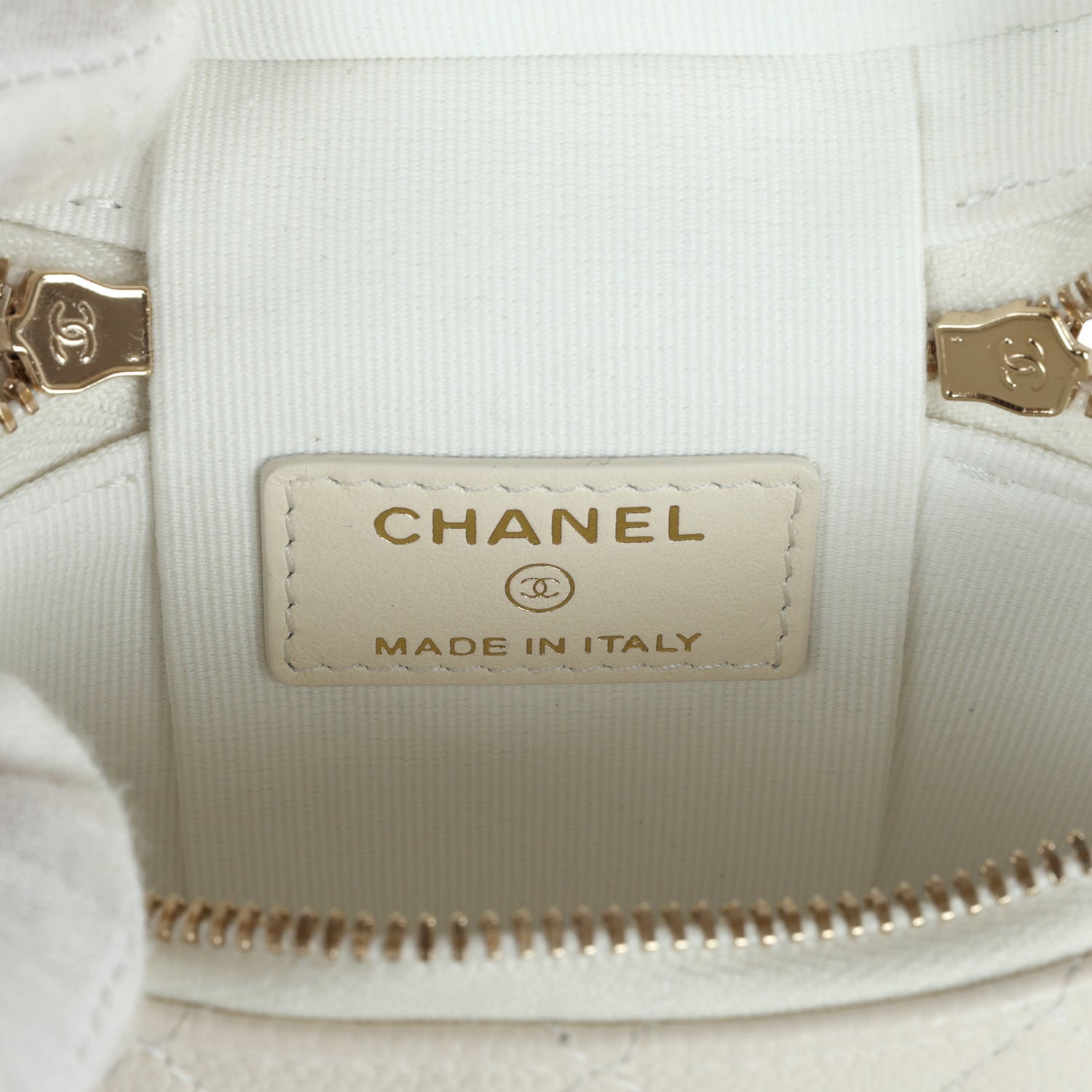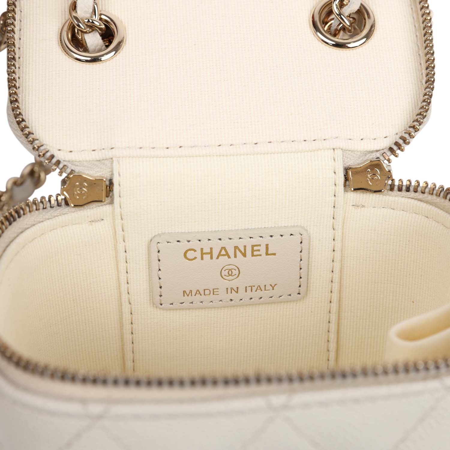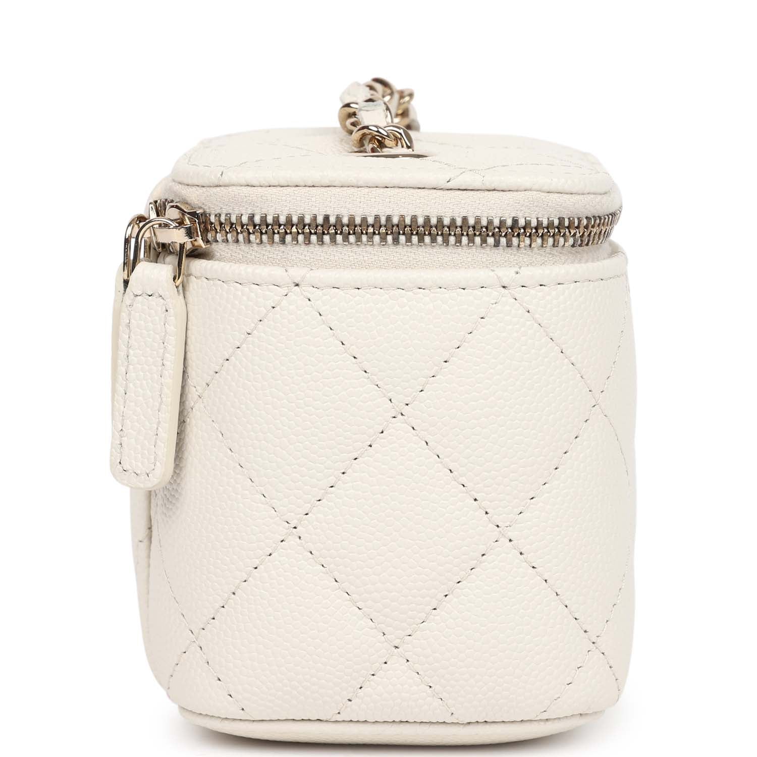 Regular price $1,740.00 Sale price $430.00 Save $1,310.00This Chanel mini top handle vanity case in quilted White caviar leather with Gold tone hardware, features tonal stitching, vertical shaped vanity case Gold tone CC logo on front of vanity case, zip around zipper closure, leather top handle, and a long Gold interwoven with White leather shoulder/crossbody strap.
