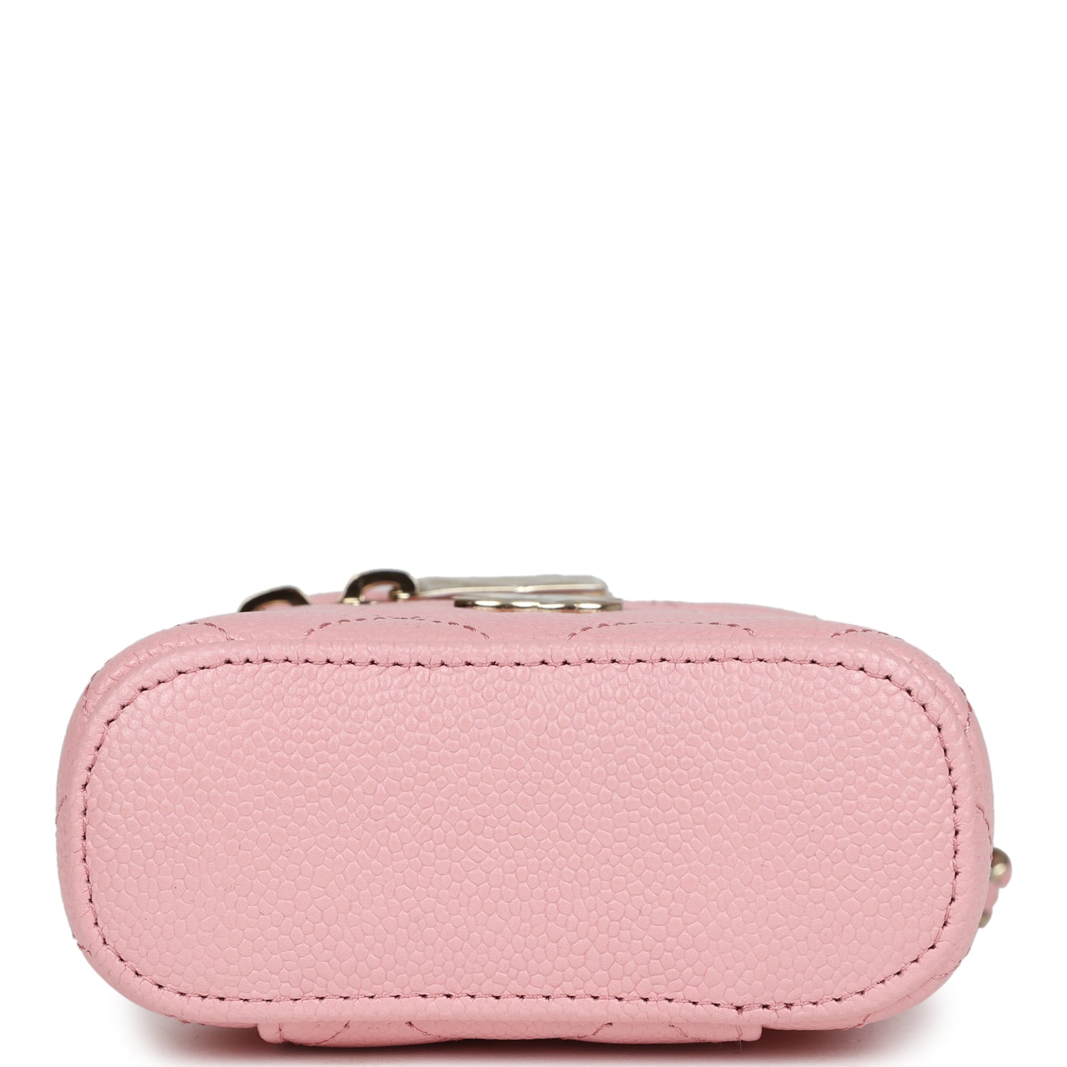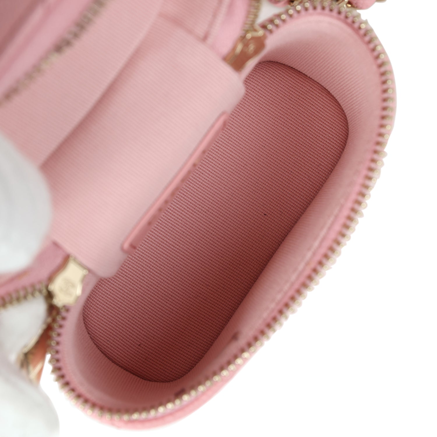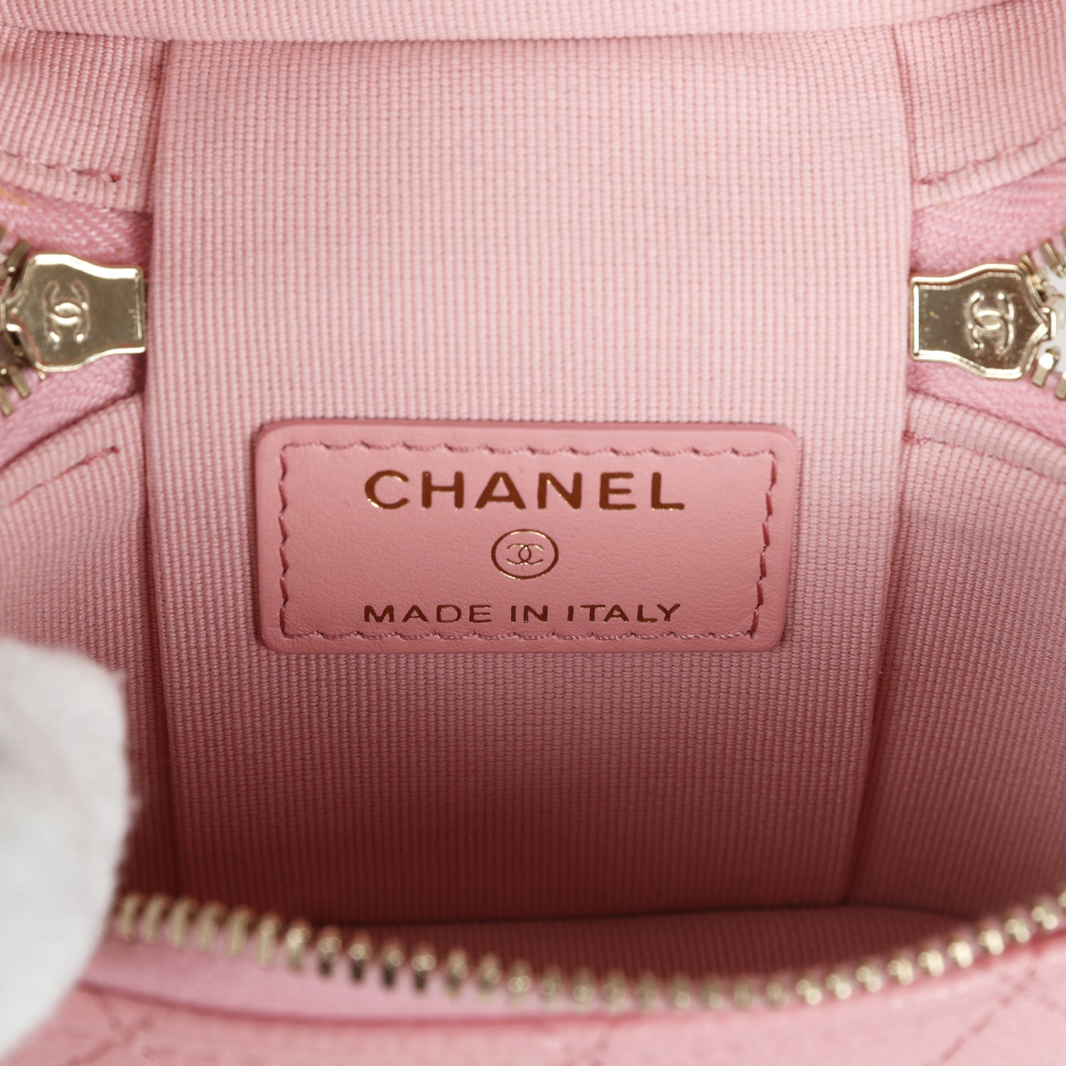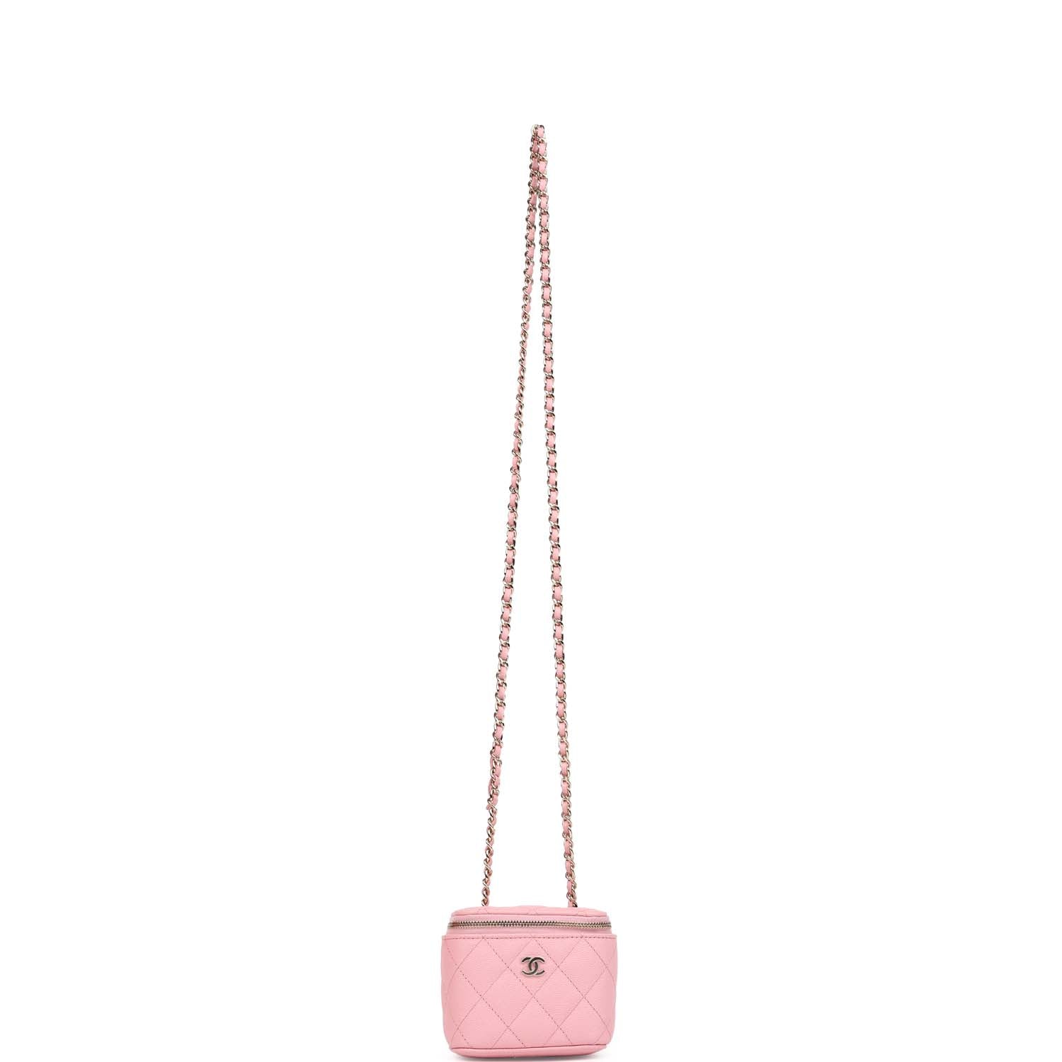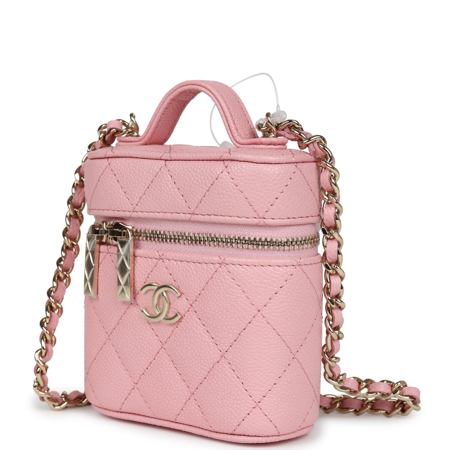 Regular price $1,760.00 Sale price $450.00 Save $1,310.00This Chanel mini top handle vanity case in quilted Pink caviar leather with gold tone hardware, features tonal stitching, vertical shaped vanity case Gold tone CC logo on front of vanity case, zip around zipper closure, leather top handle, and a long gold interwoven with pink leather shoulder/crossbody strap.