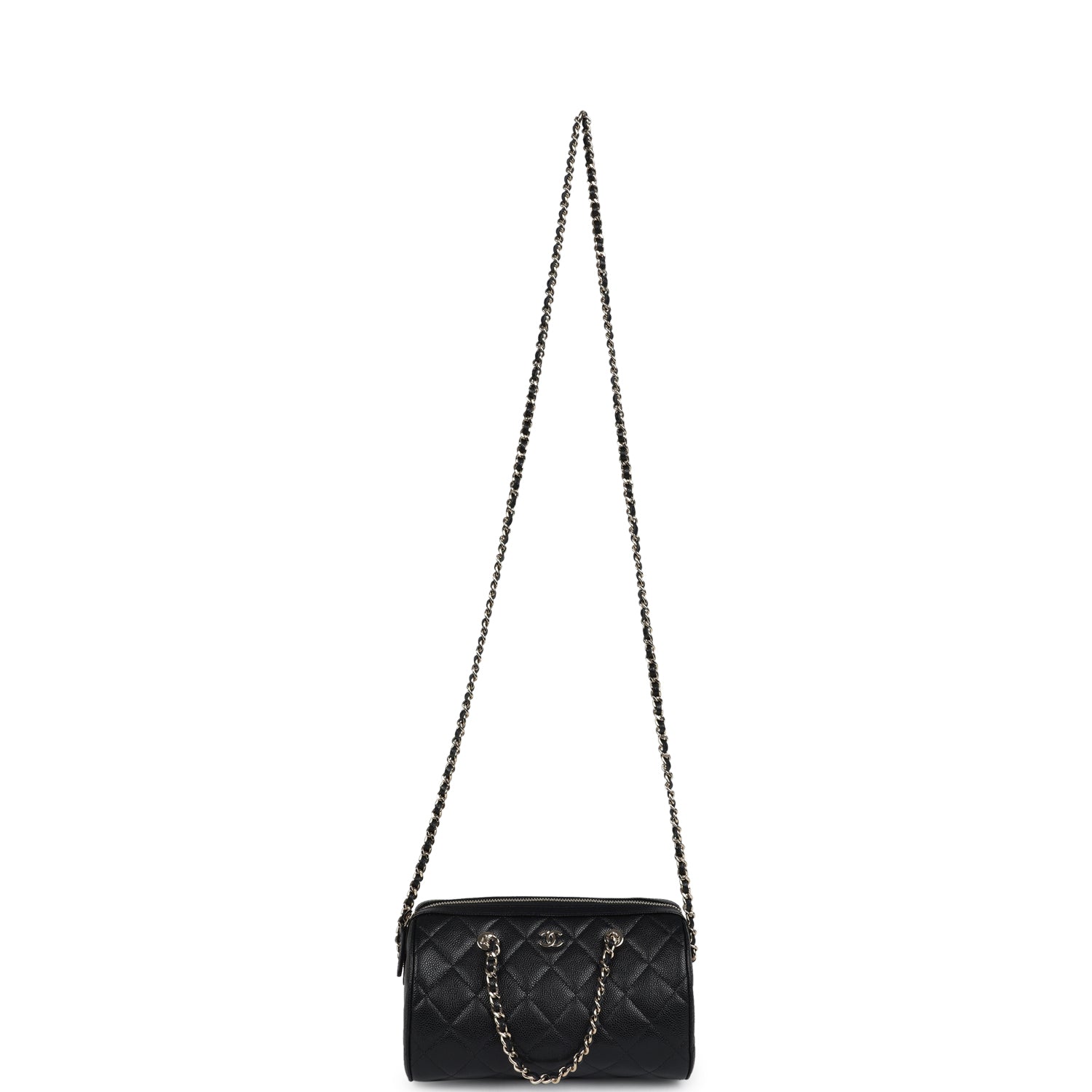 Regular price $2,060.00 Sale price $440.00 Save $1,620.00This Mini Timeless Classic Barrel Bag with Chain is in black shiny grained calfskin leather light gold tone hardware, featuring signature diamond quilt leather, signature front CC emblem, zipper closure, interwoven leather and light gold tone chain link top handles, and a single interwoven leather and light gold tone chain link shoulder/crossbody strap.