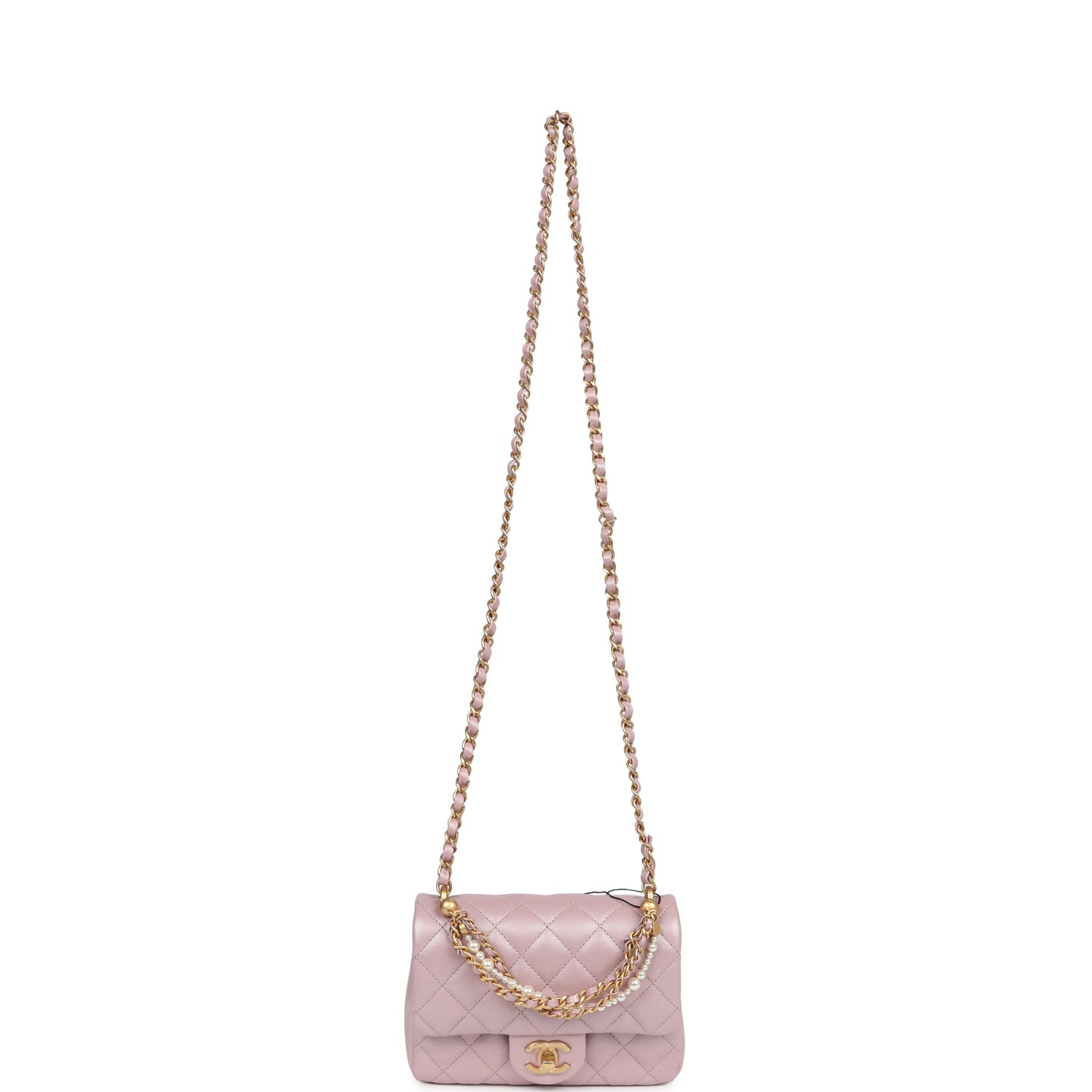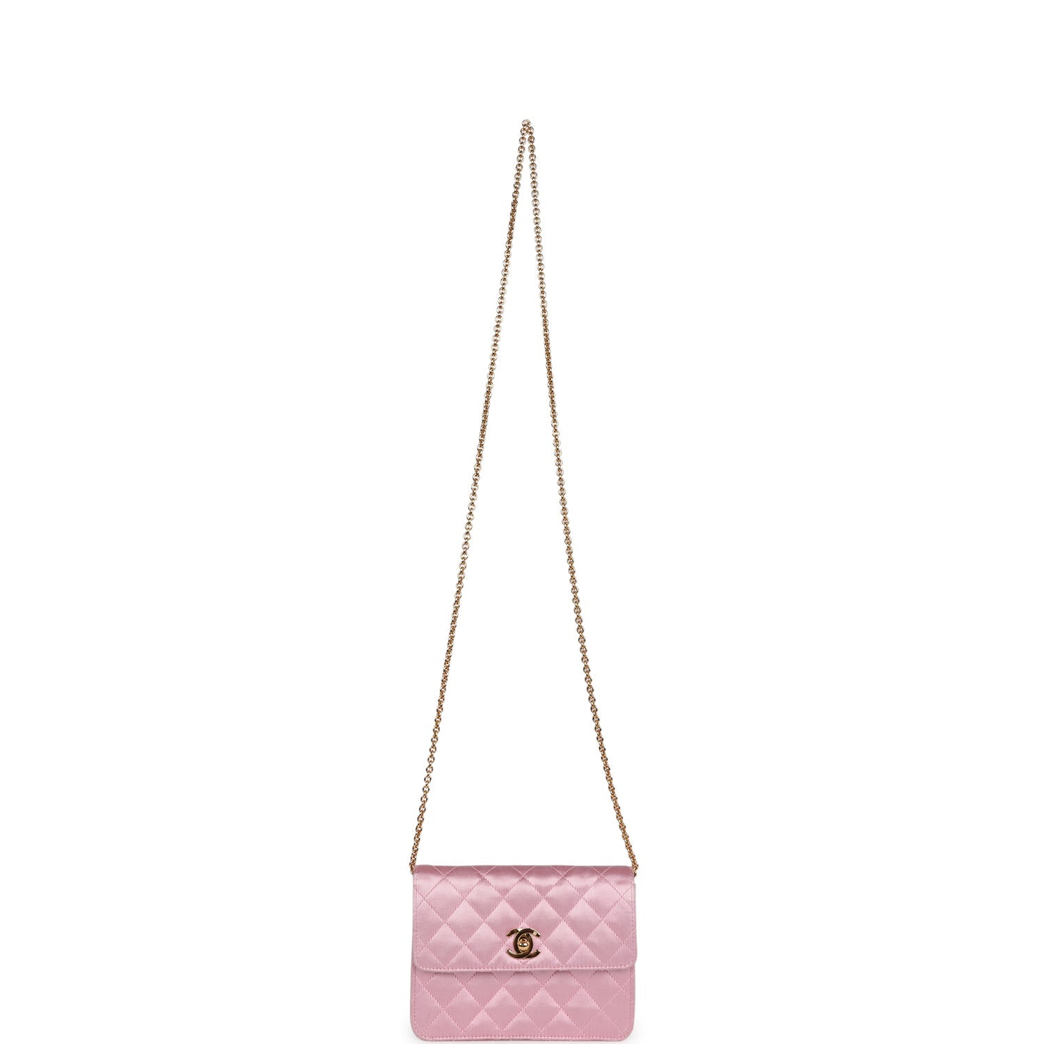 Regular price $17,330.00 Sale price $1,180.00 Save $16,150.00This New mini flap bag is in Pink satin with gold hardware, featuring a single straight front flap with signature CC logo turnlock, a rear slip pocket, and a gold chain link shoulder/crossbody strap.