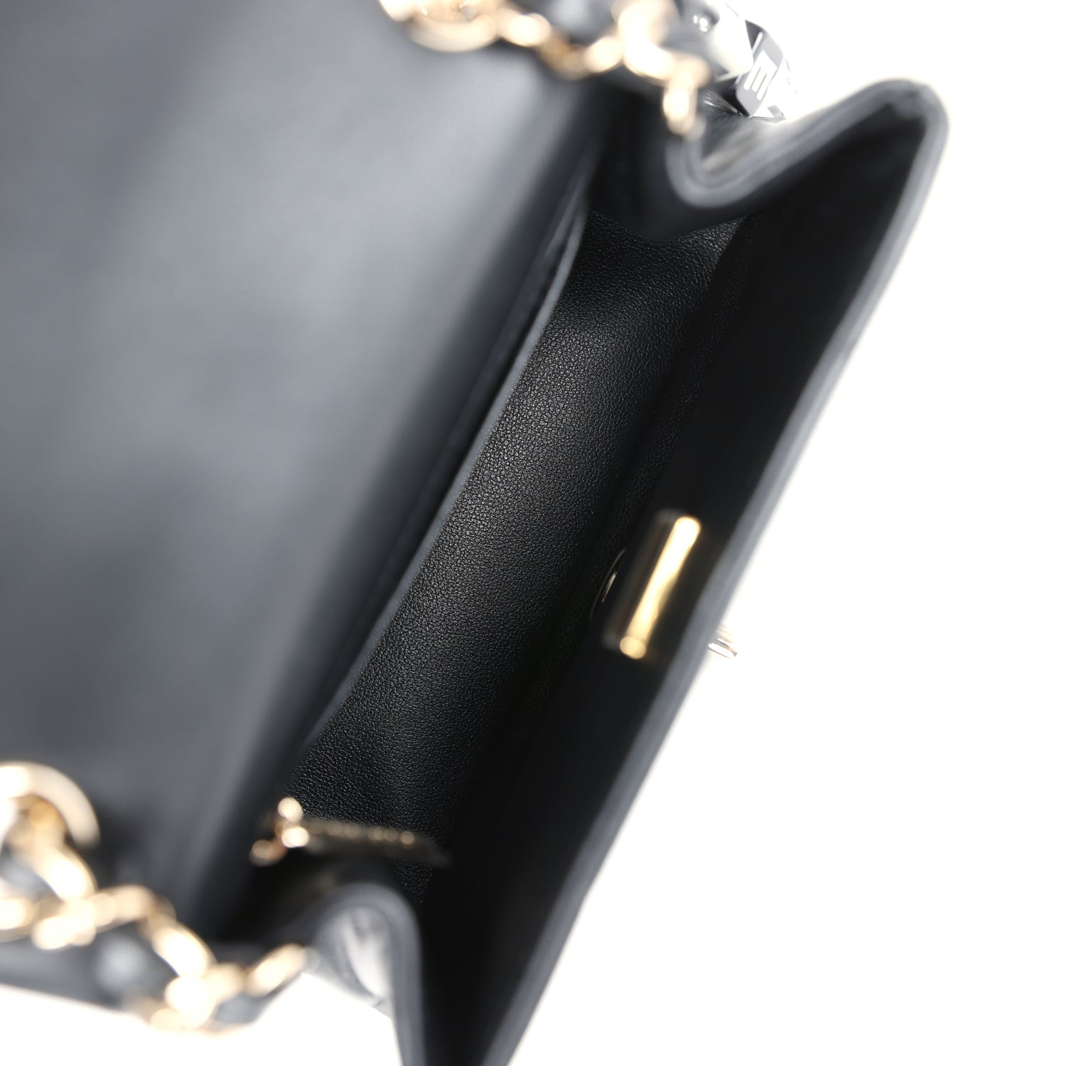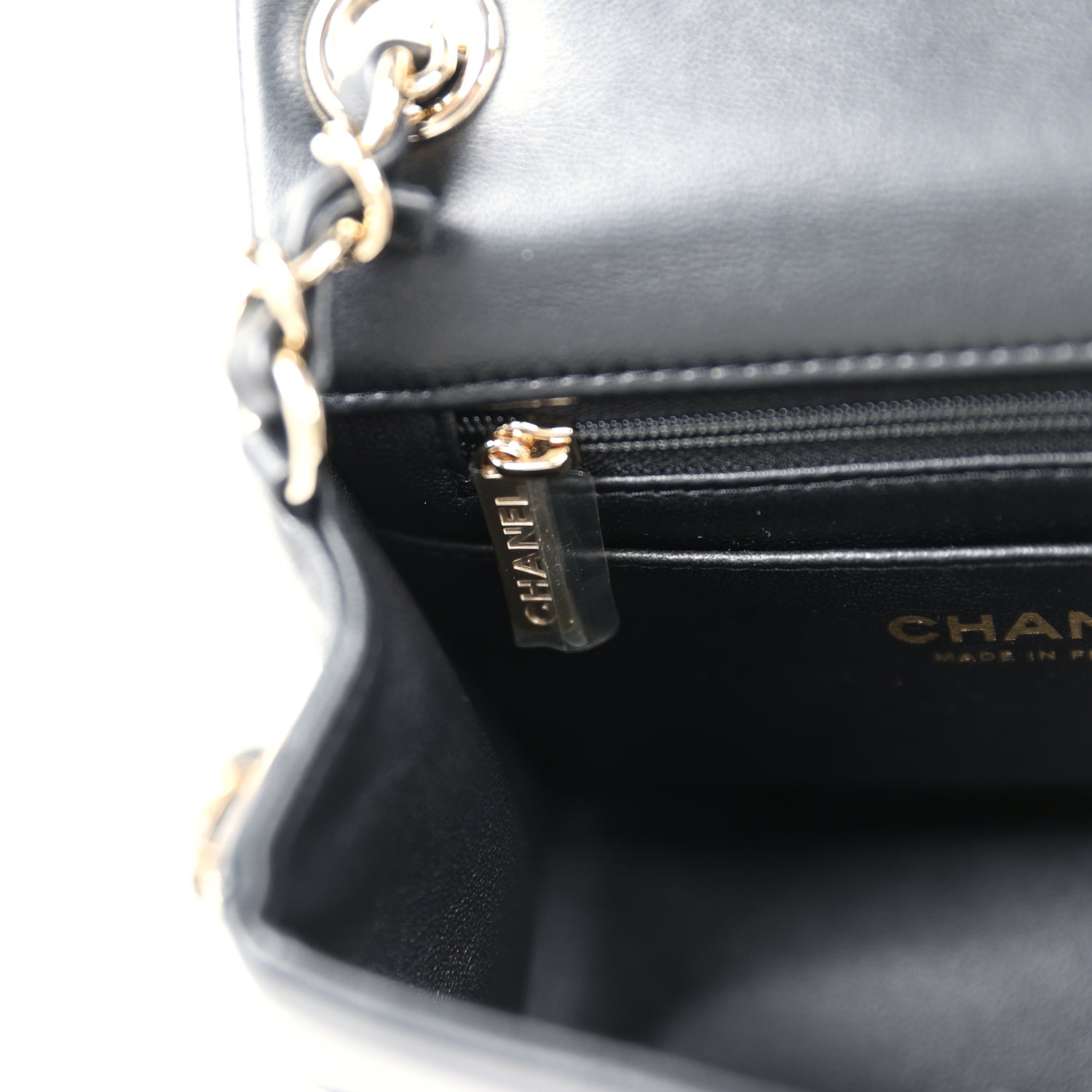 Regular price $1,640.00 Sale price $430.00 Save $1,210.00This Mini Flap bag is in black lambskin leather with light gold tone hardware and features a front flap with CC turnlock closure, back half moon pocket and adjustable interwoven light gold tone chain link shoulder/crossbody strap with charm attachment.