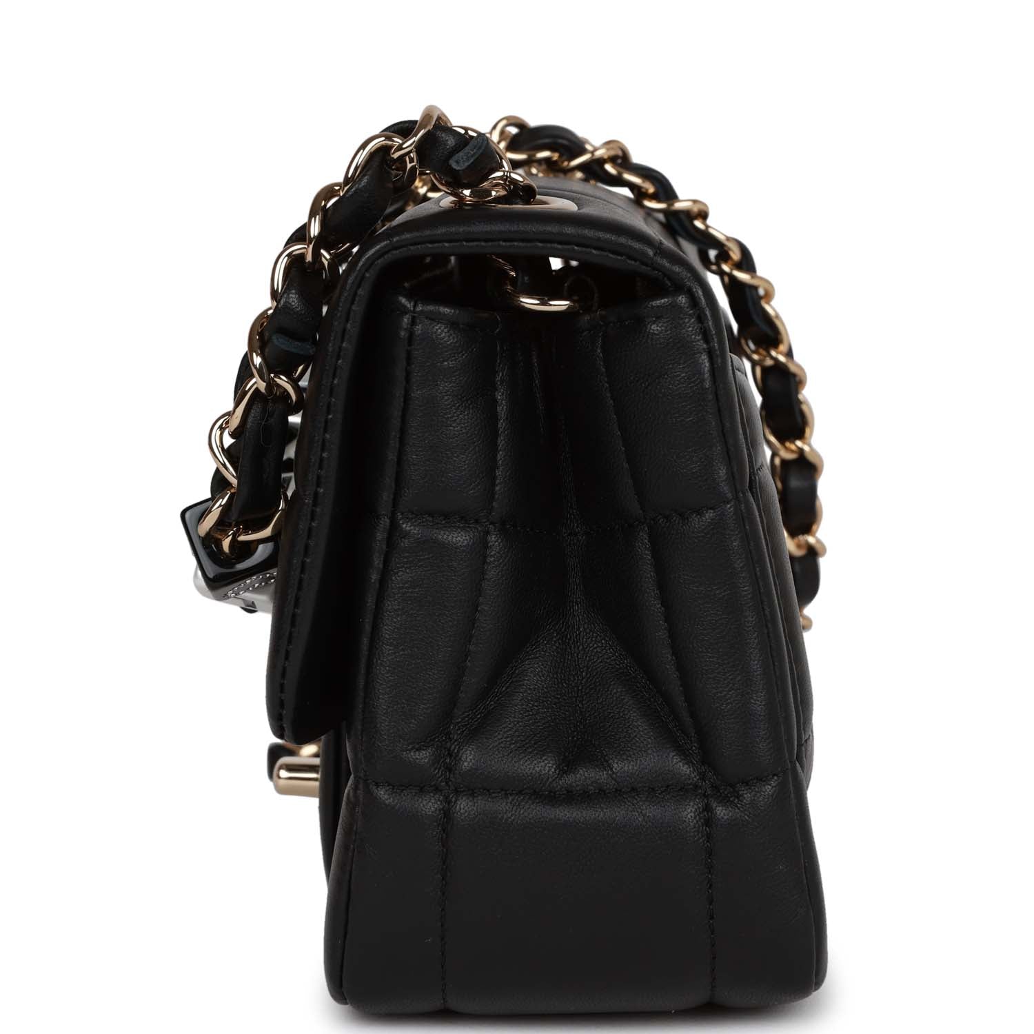 This limited edition Mini Square flap bag is in black lambskin with light gold tone hardware and has a front flap with signature CC turnlock closure, rear half moon pocket and single interwoven black leather and light gold tone chain link shoulder/crossbody strap with resin charms.