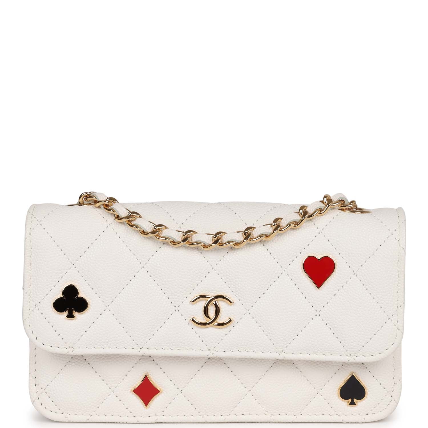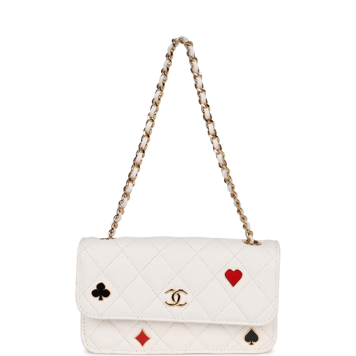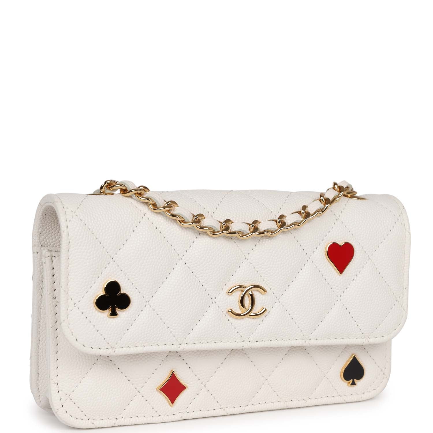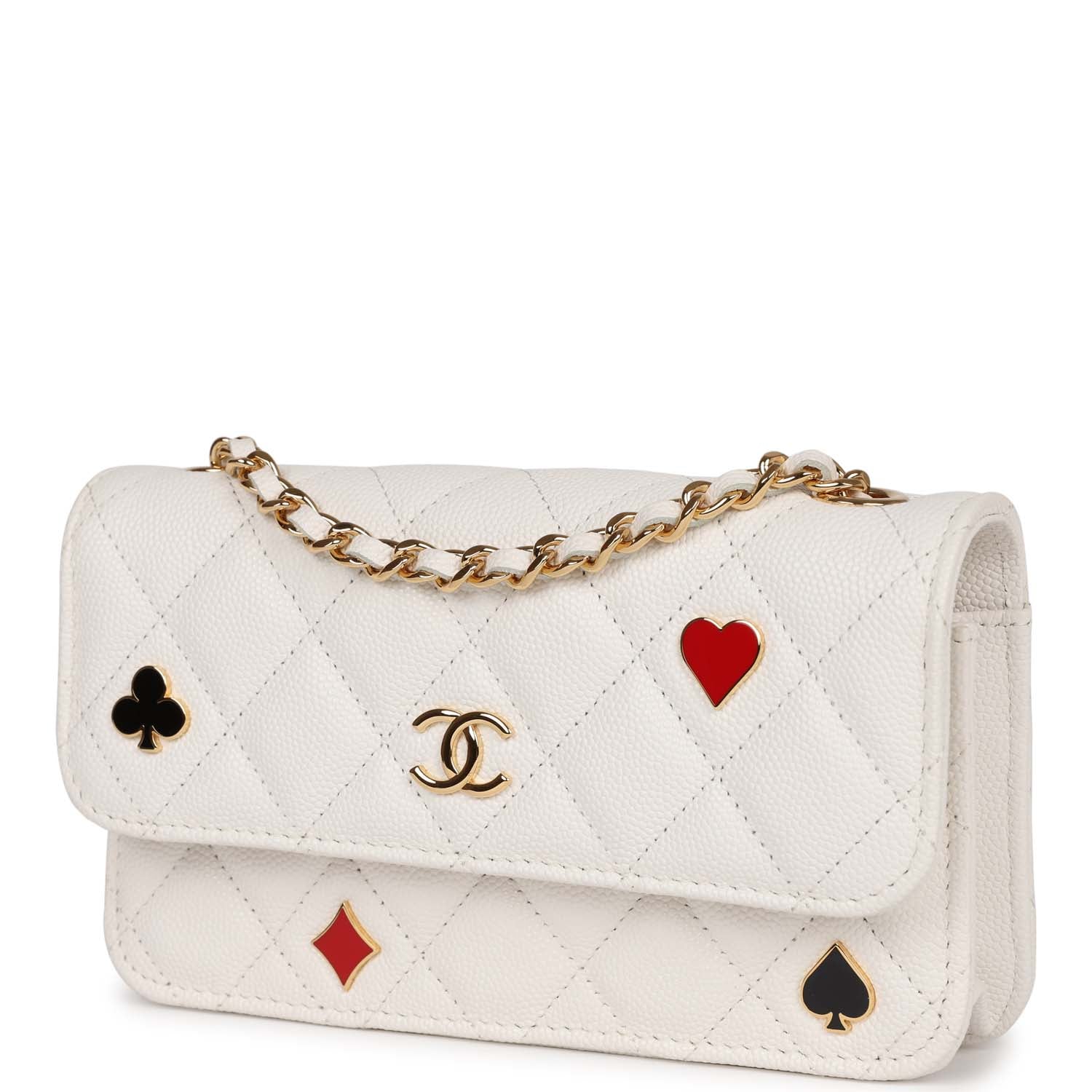 Regular price $1,990.00 Sale price $450.00 Save $1,540.00This Wallet on Chain is of White caviar leather with gold tone hardware and features poker themed enamel charms on front of bag, has a front flap with a CC magnetic closure, and a long gold tone metal and white leather chain.