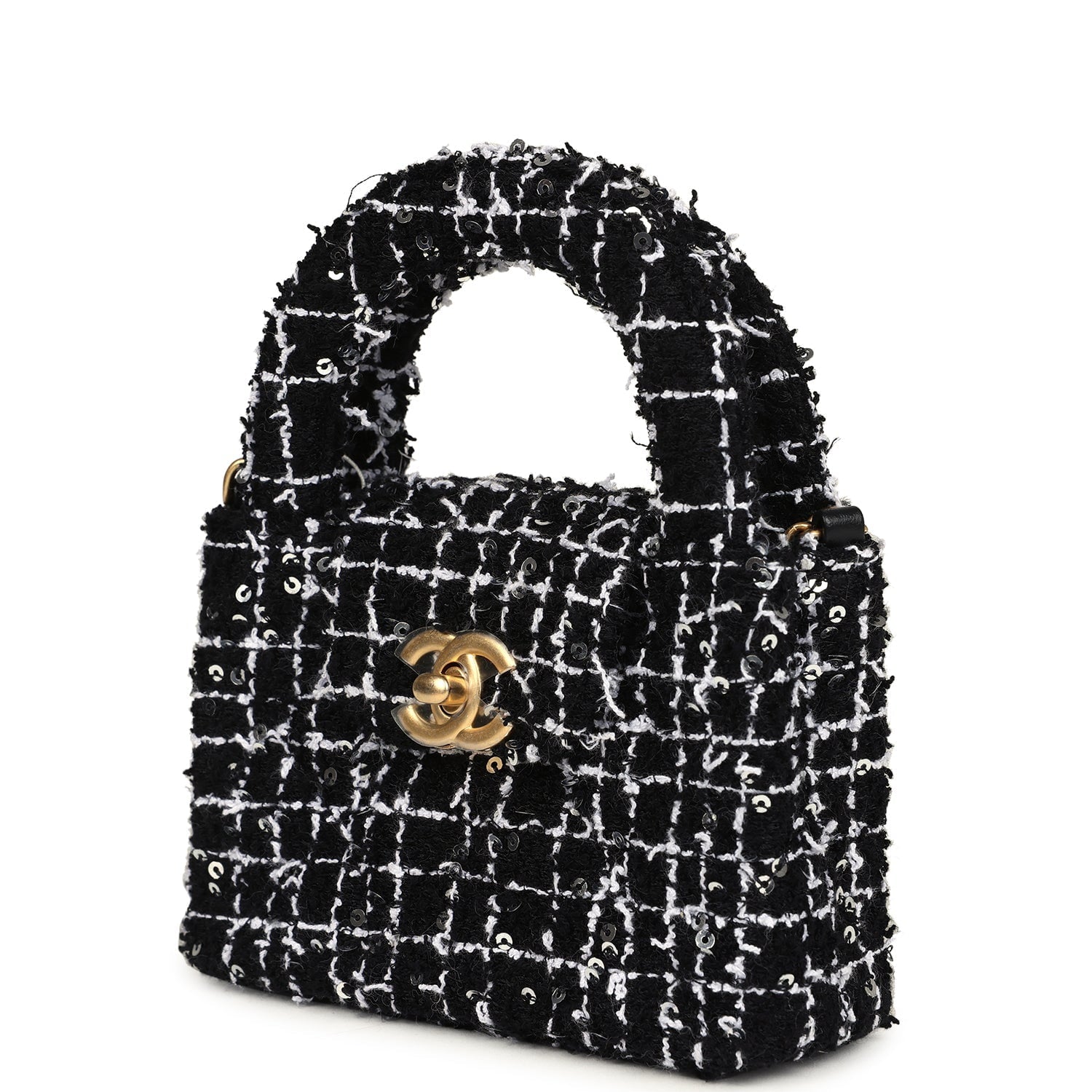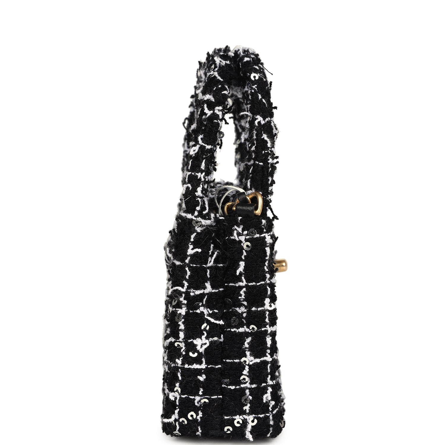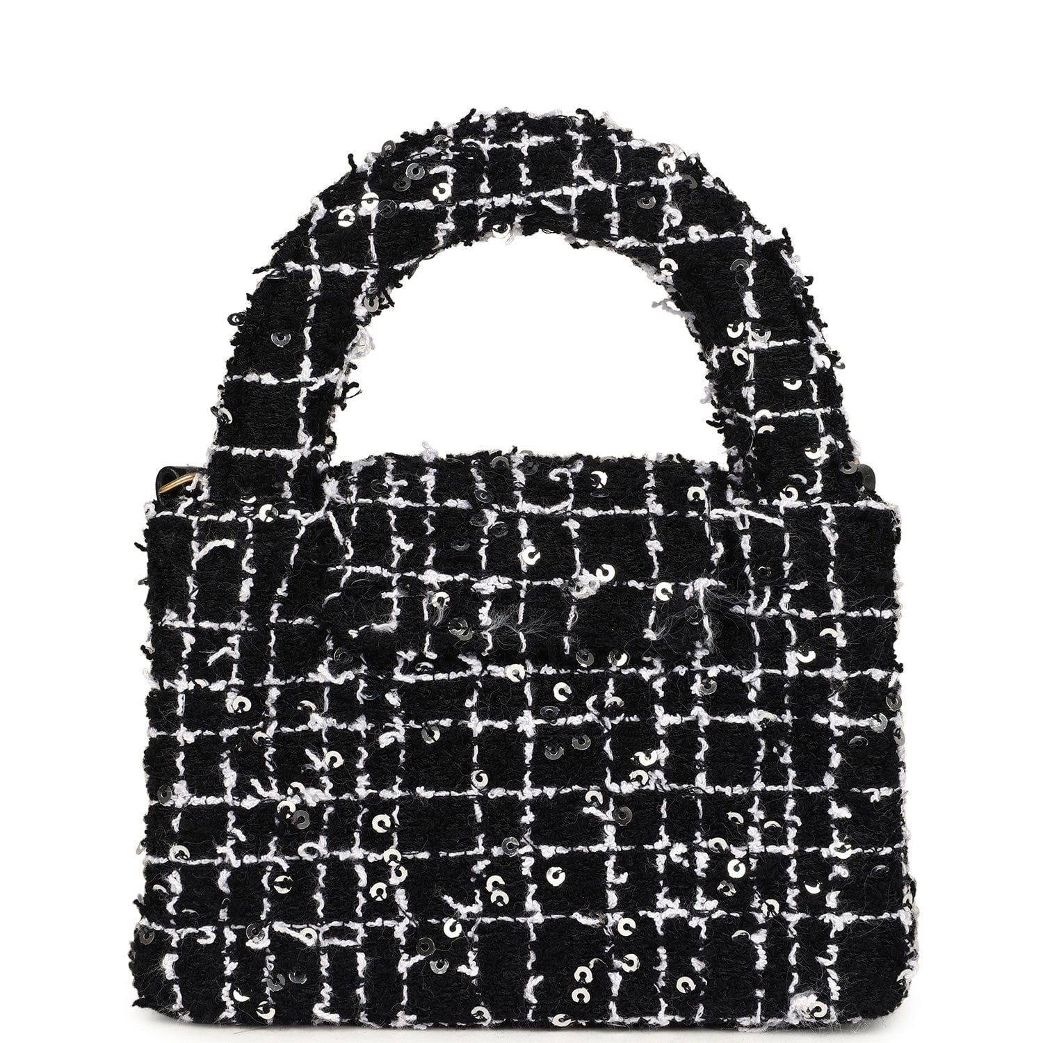 Chanel Nano Kelly Shopper Black, White & Sequin Tweed Brushed Gold Hardware