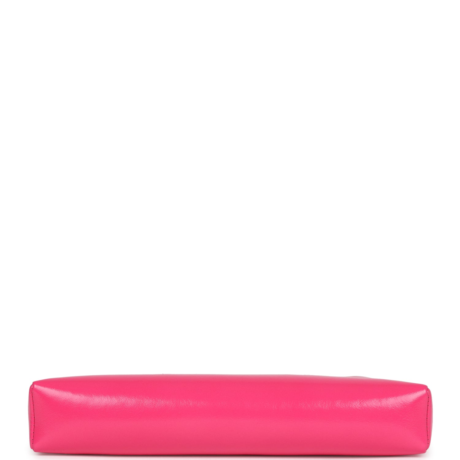 The interior is lined in a mixture of hot pink grossgrain and leather with one slit pocket on rear wall.