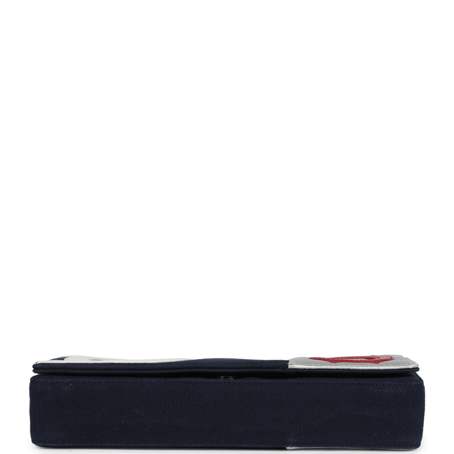 Regular price $18,210.00 Sale price $1,320.00 Save $16,890.00This vintage Chanel N0.5 Chain Shoulder Flap Bag is in navy canvas and red, white, lambskin leather with silver tone hardware, featuring a large signature leather CC logo on one side and metallic silver chocolate bar quilted leather trimming on the opposite side with a red leather N0. 5 motif, a magnetic snap closure, and a detachable interwoven silver-tone hardware and a red leather shoulder strap that can be tucked into the bag to wear as a clutch.