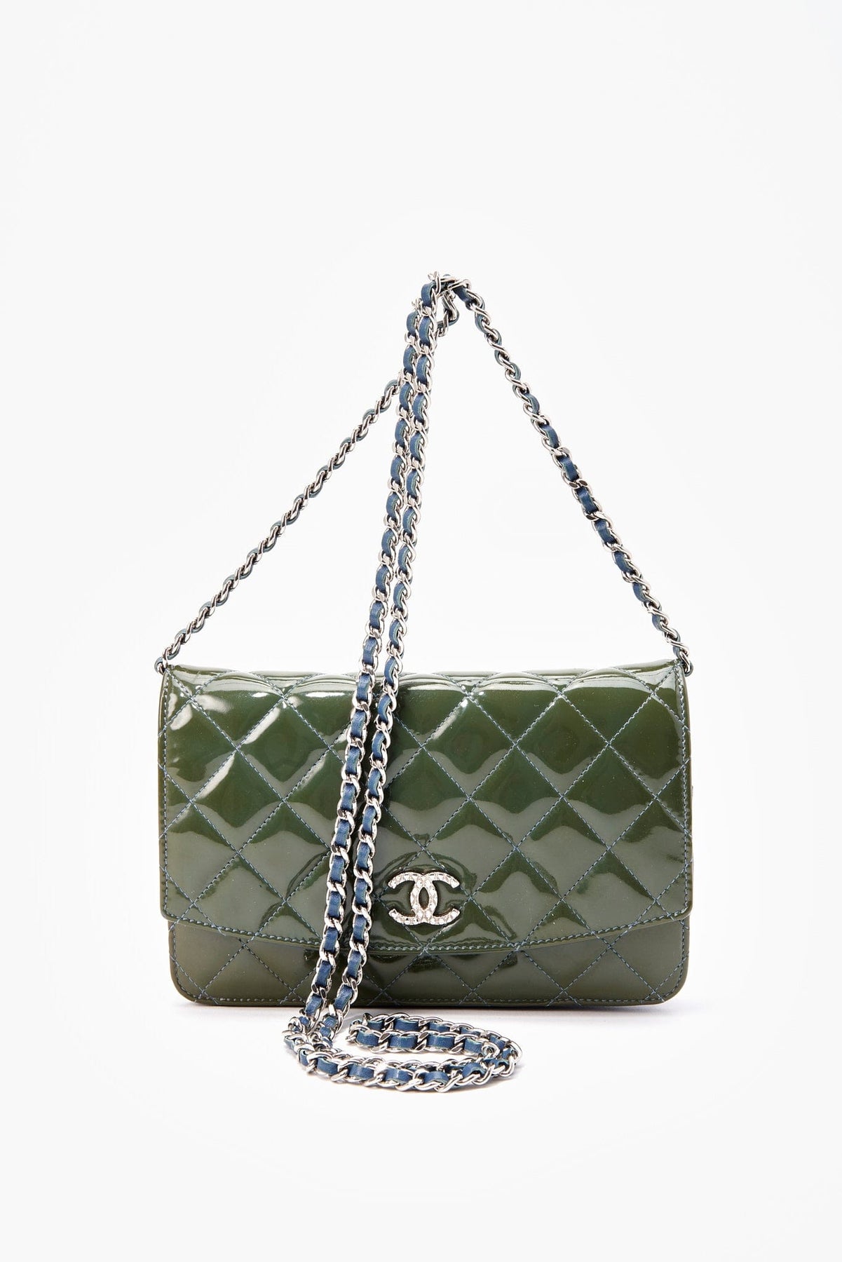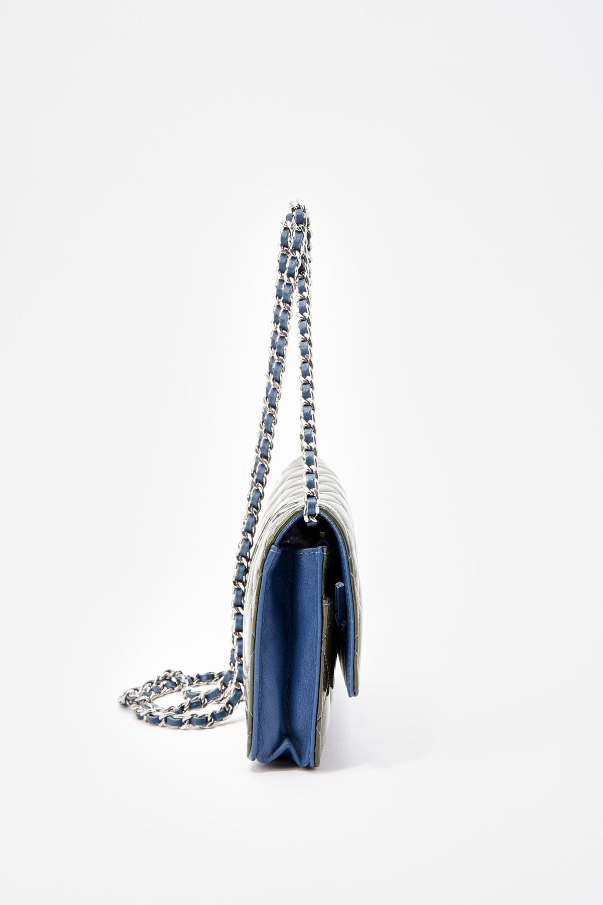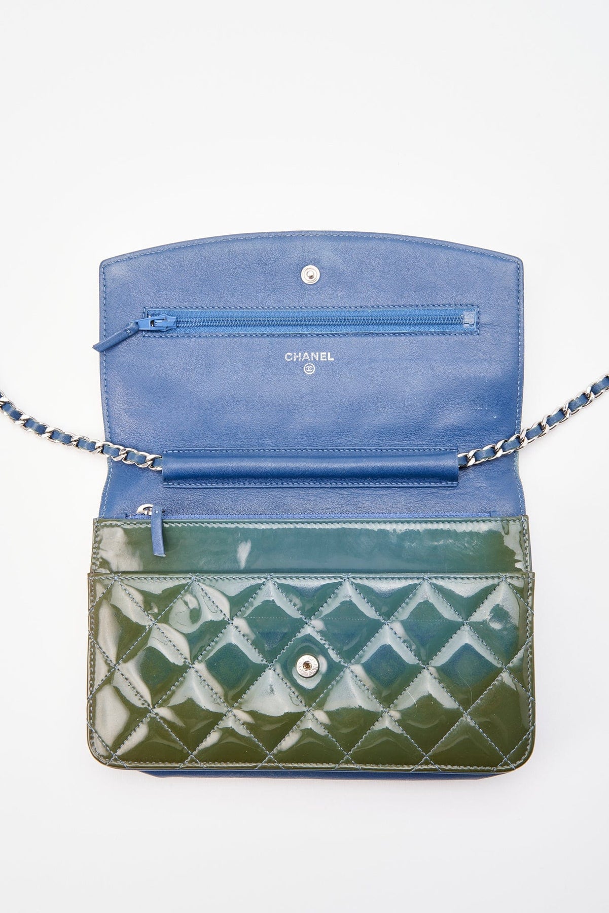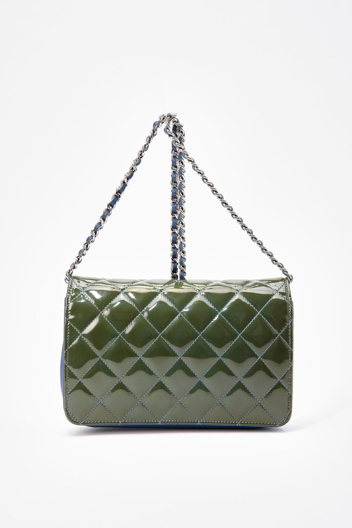 Regular price $2,060.00 Sale price $420.00 Save $1,640.00This Chanel wallet on chain, WOC, is crafted from a patent green leather mixed with a blue lambskin leather, featuring silver hardware and a single leather-trimmed chain-link shoulder strap.