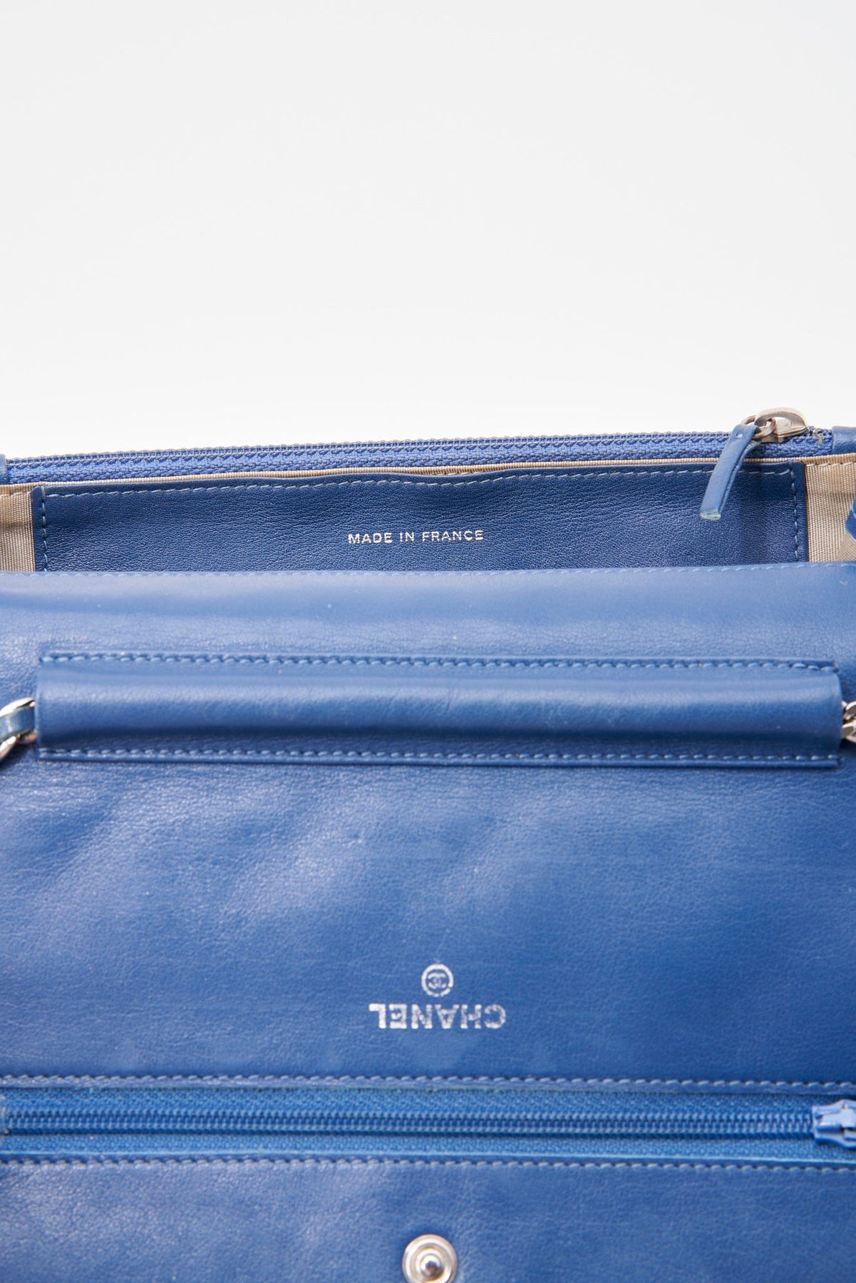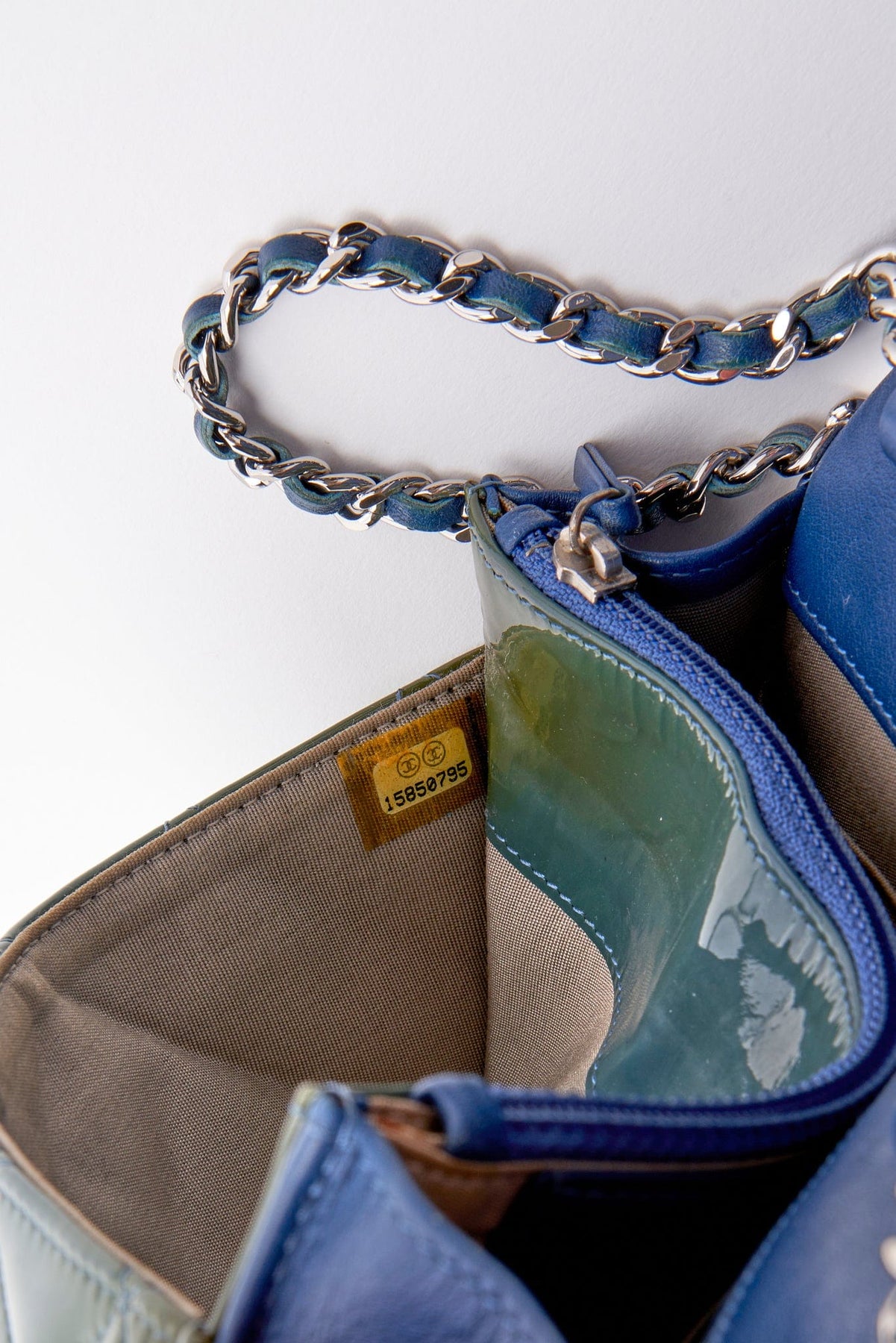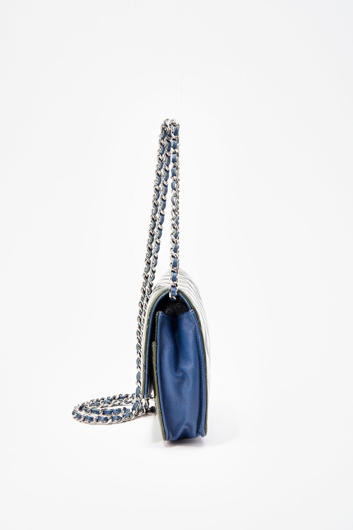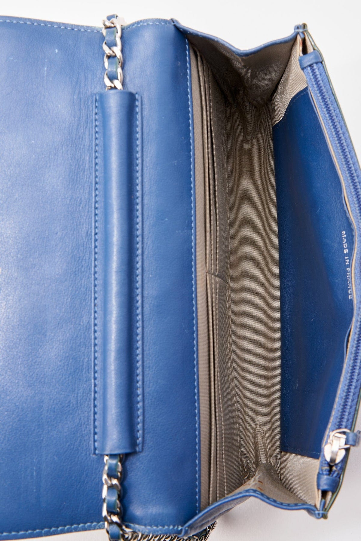 Regular price $2,060.00 Sale price $420.00 Save $1,640.00This Chanel wallet on chain, WOC, is crafted from a patent green leather mixed with a blue lambskin leather, featuring silver hardware and a single leather-trimmed chain-link shoulder strap.