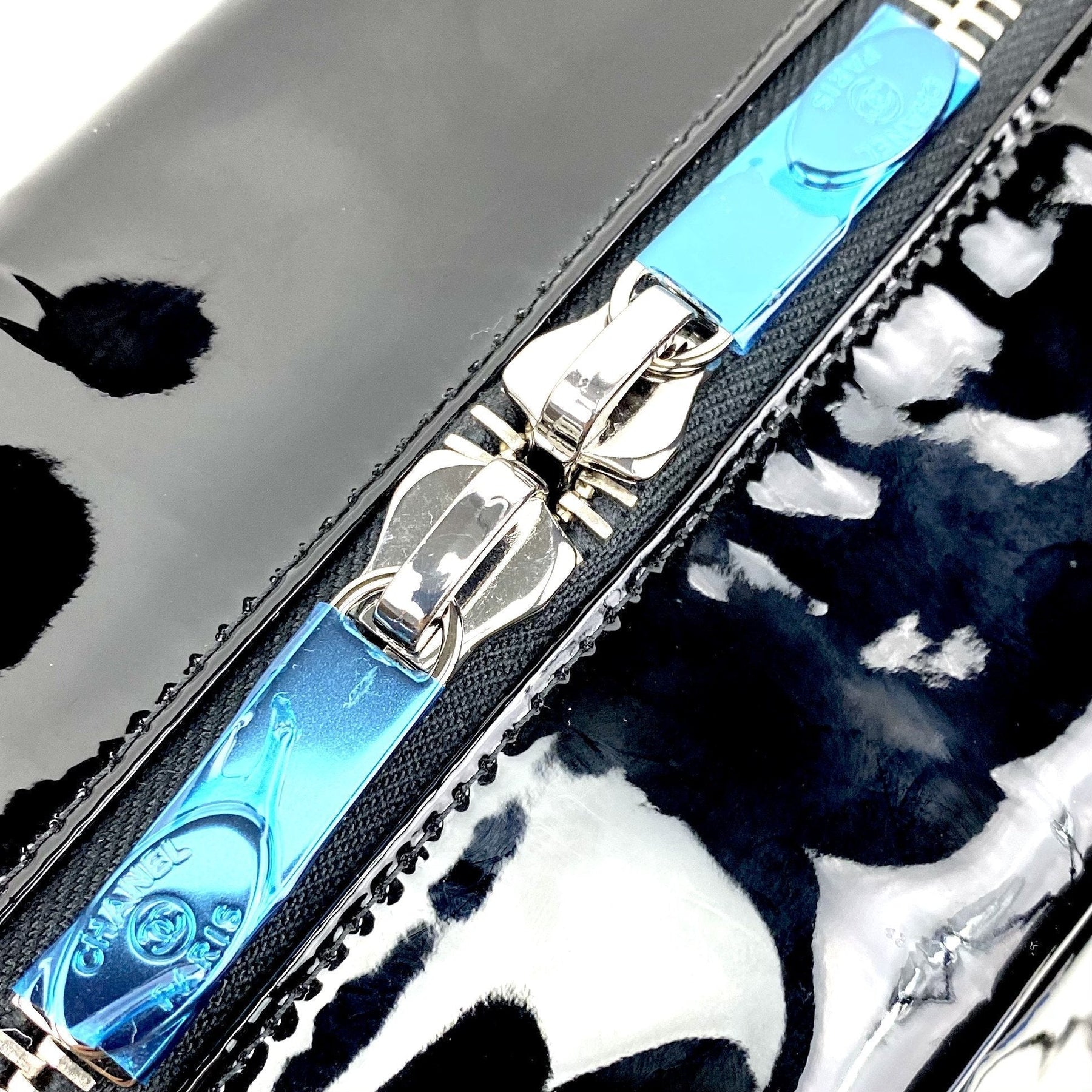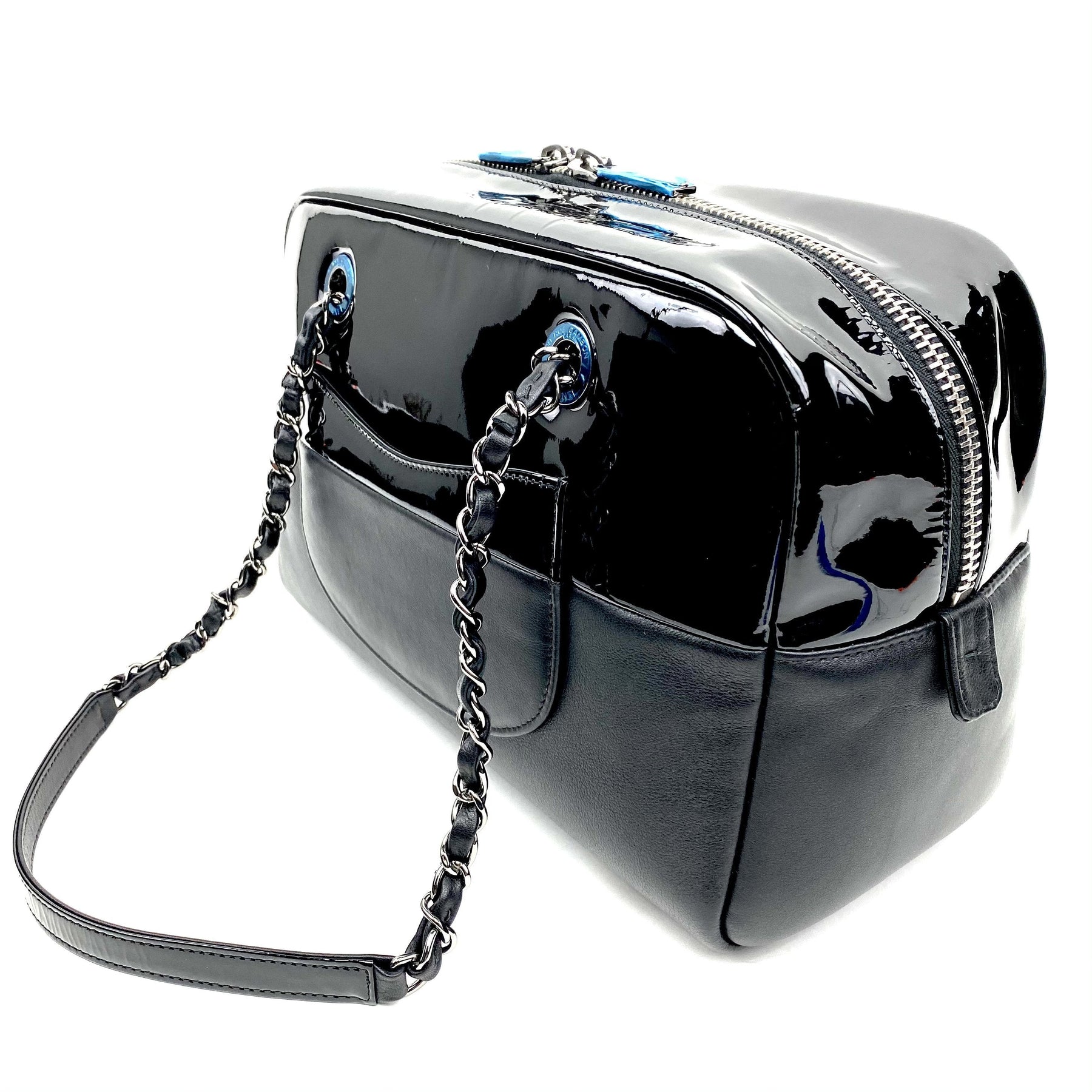 Regular price $1,078.60 Sale price $647.16 Save $431.44Black Patent & Lambskin leather Chanel Bowling bag with gunmetal hardware, dual chain-link and leather shoulder straps, black grosgrain lining, three interior pockets one with zip closure and zip closure at top. Includes dust bag and authenticity card.