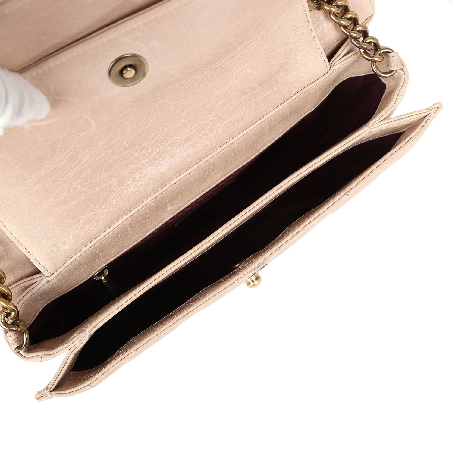 Regular price $2,290.00 Sale price $440.00 Save $1,850.00This Perfect Edge flap bag is in beige aged calfskin with antique gold hardware, front flap with CC snap closure, tonal stitching, an interwoven antique gold tone chain link shoulder strap, an antique gold tone chain link top handle, and signature back pocket on exterior.