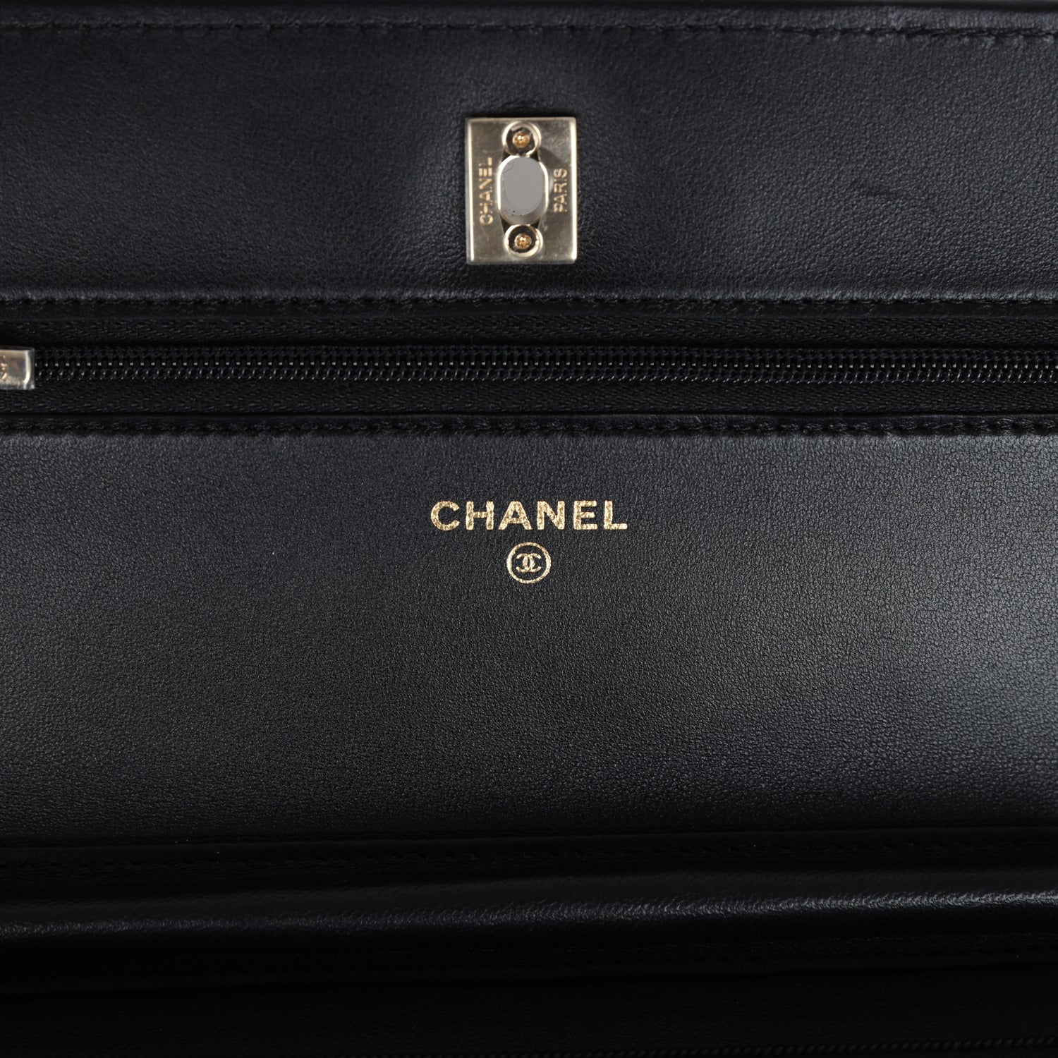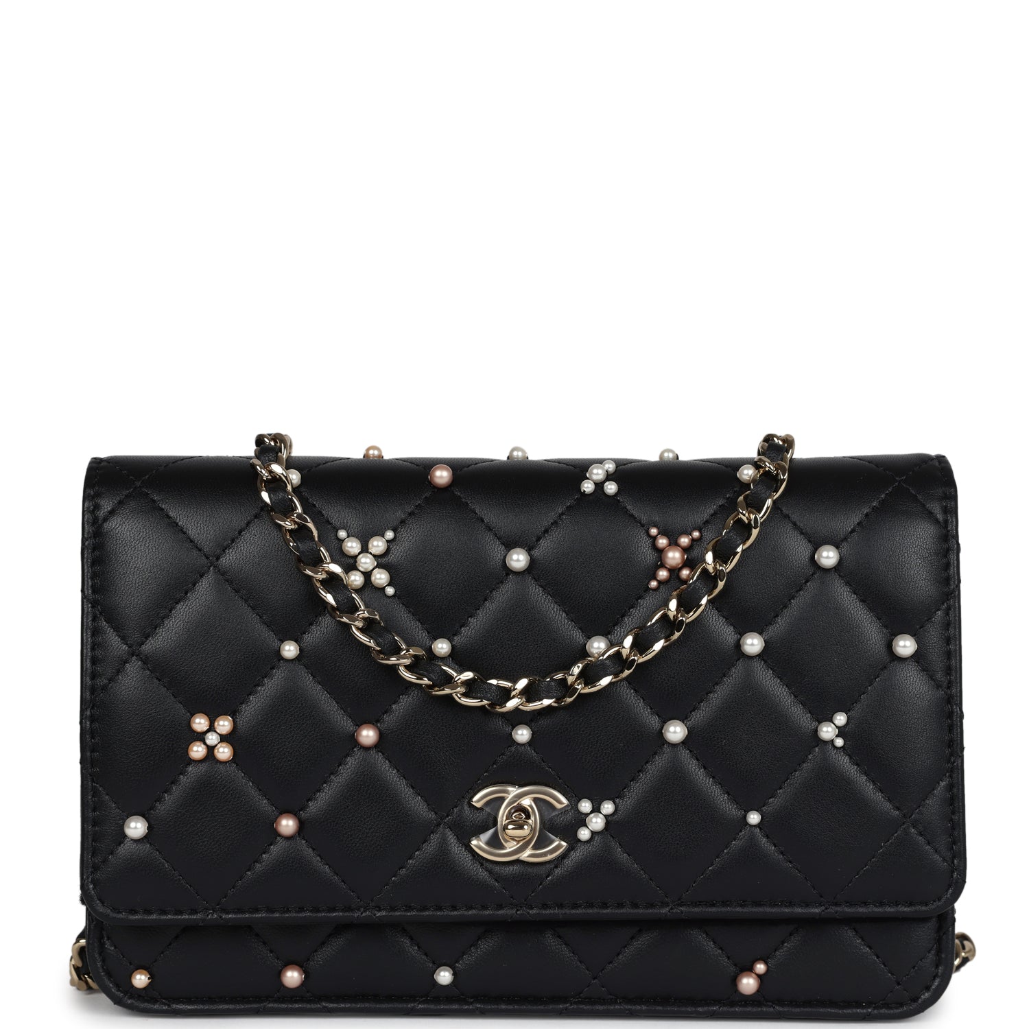 Regular price $1,800.00 Sale price $440.00 Save $1,360.00 This Chanel pearl studded Wallet on Chain is in black lambskin leather with light gold tone hardware and has a front flap with CC turnlock closure, half moon back pocket, and a light gold tone metal and black leather interwoven chain.